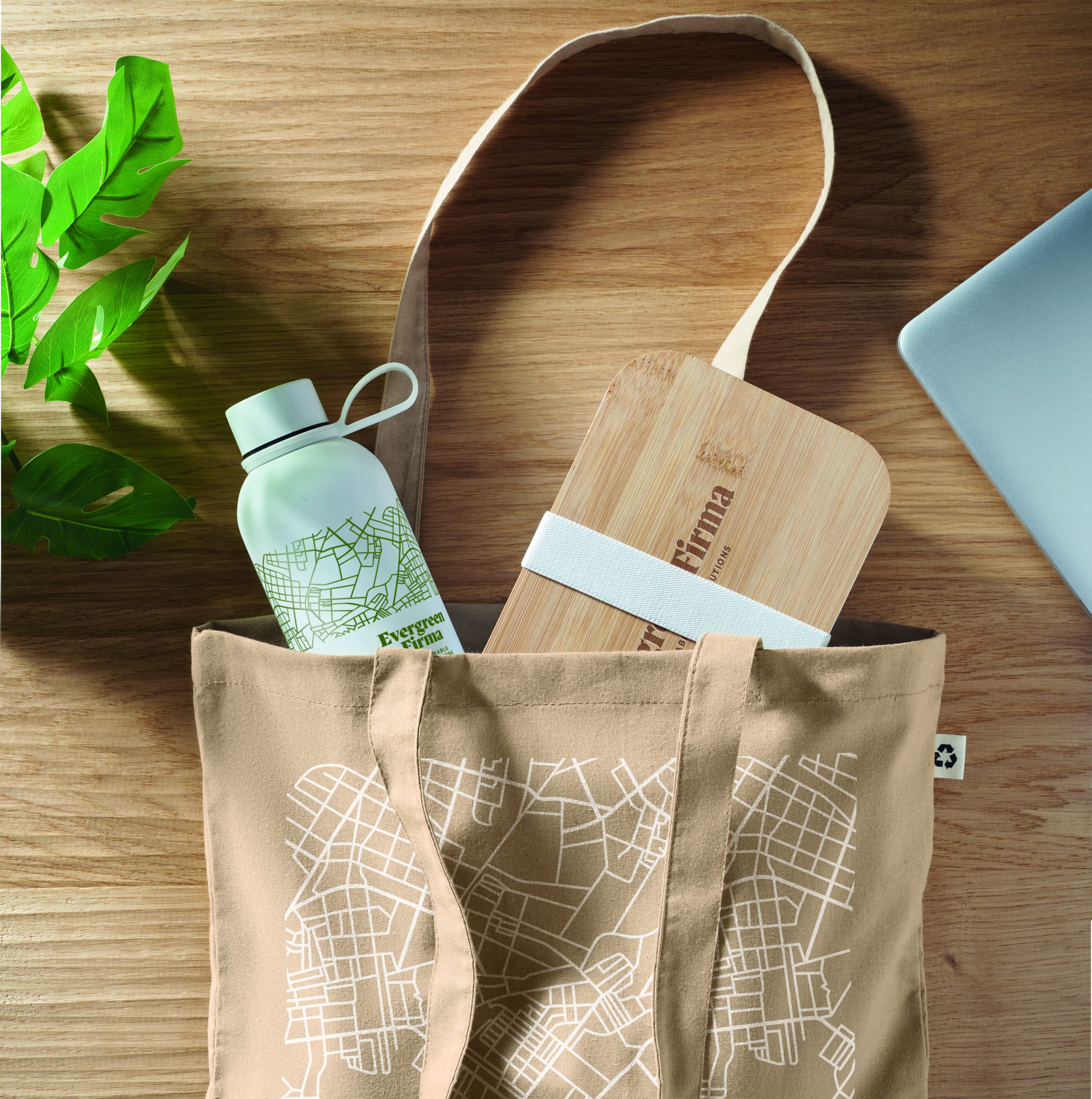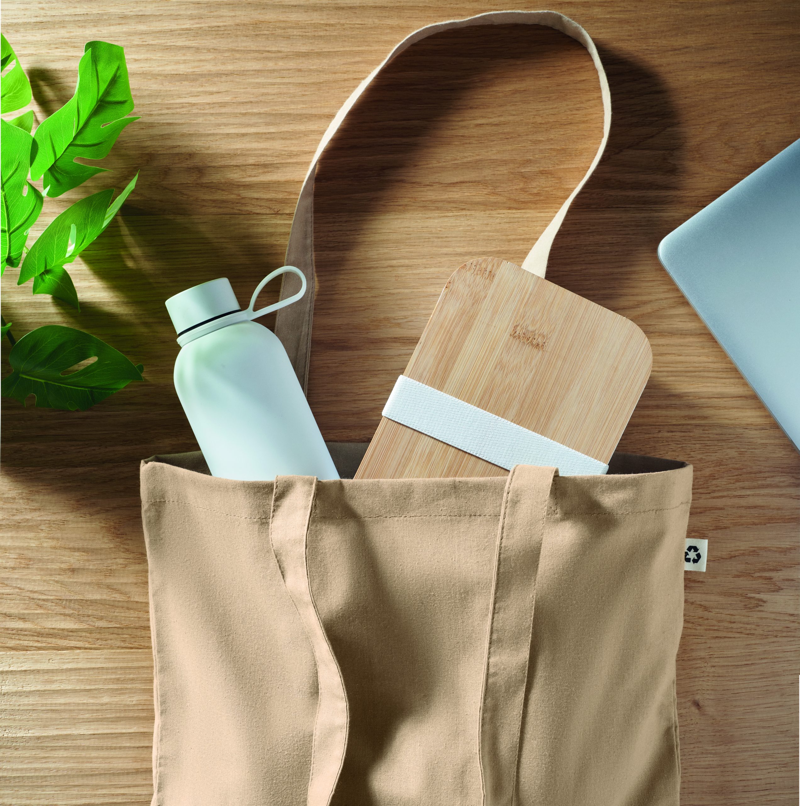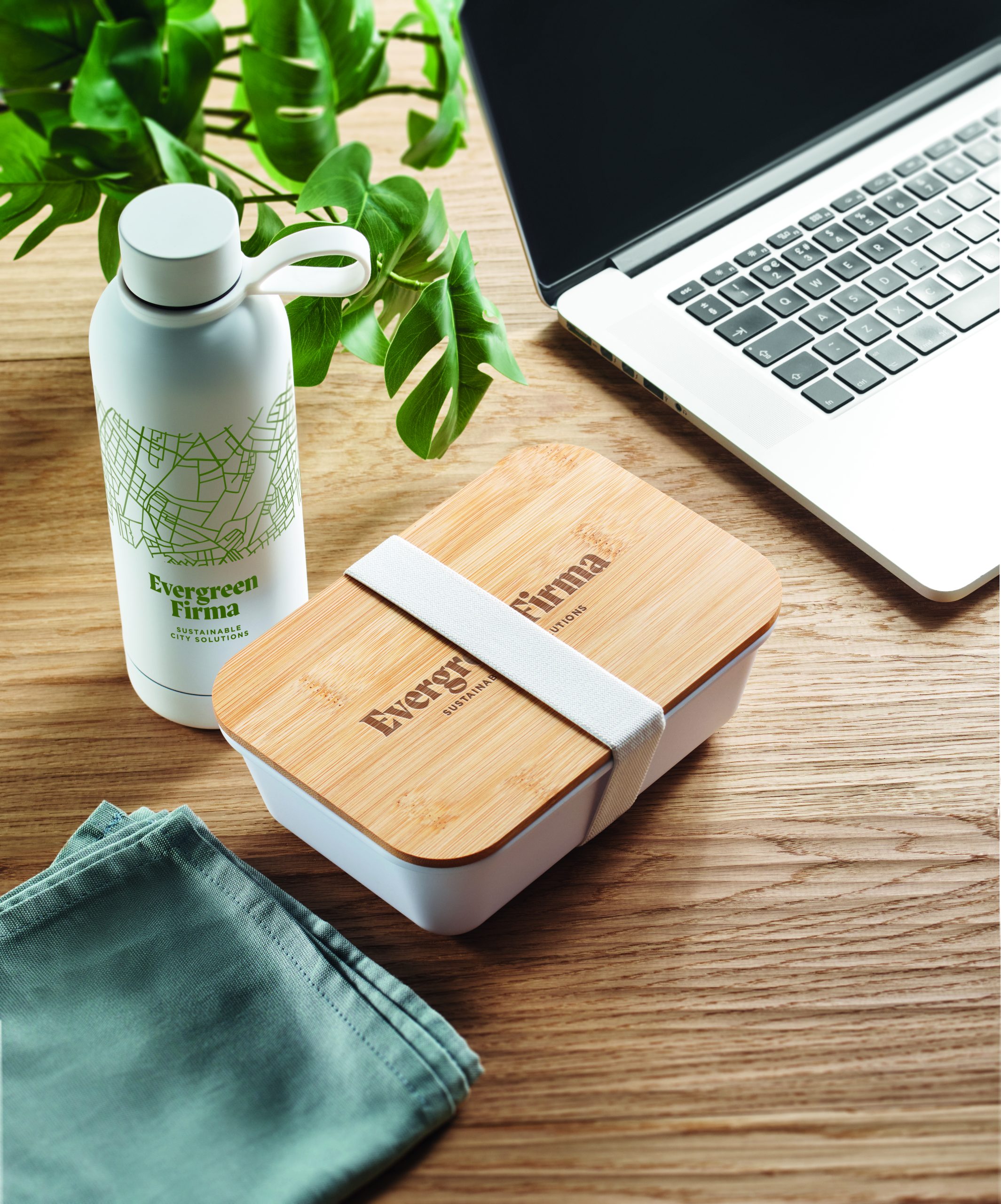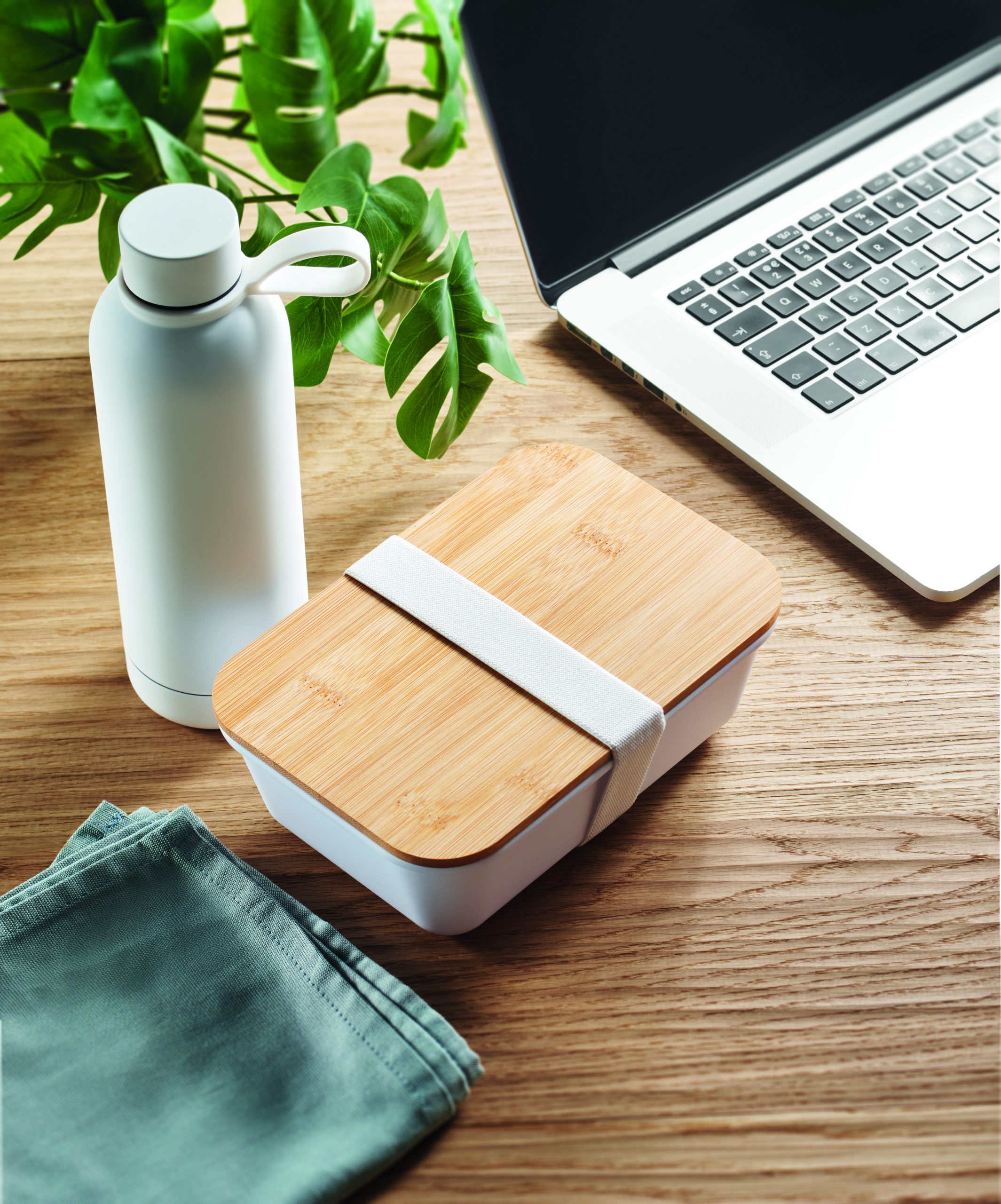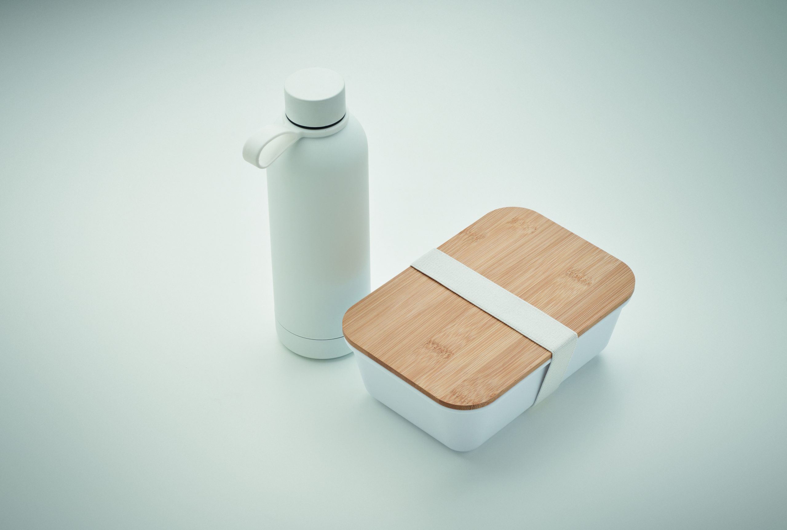 2-częściowy zestaw upominkowy na lunch z dwuścienną butelką z recyklingowanej stali nierdzewnej (90% z recyklingowanej stali nierdzewnej i 10% ze stali nierdzewnej) i lunch box z PP, z bambusową pokrywką i gumką z RPET. Pojemność 500 ml i 900 ml.