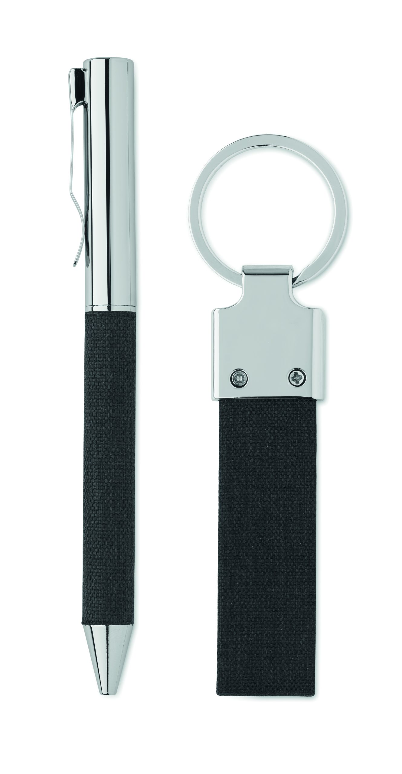 2-częściowy zestaw upominkowy w pudełku. Zawiera metalowy wykręcany długopis z detalami z poliestru RPET i brelok z poliestru RPET. Niebieski tusz.