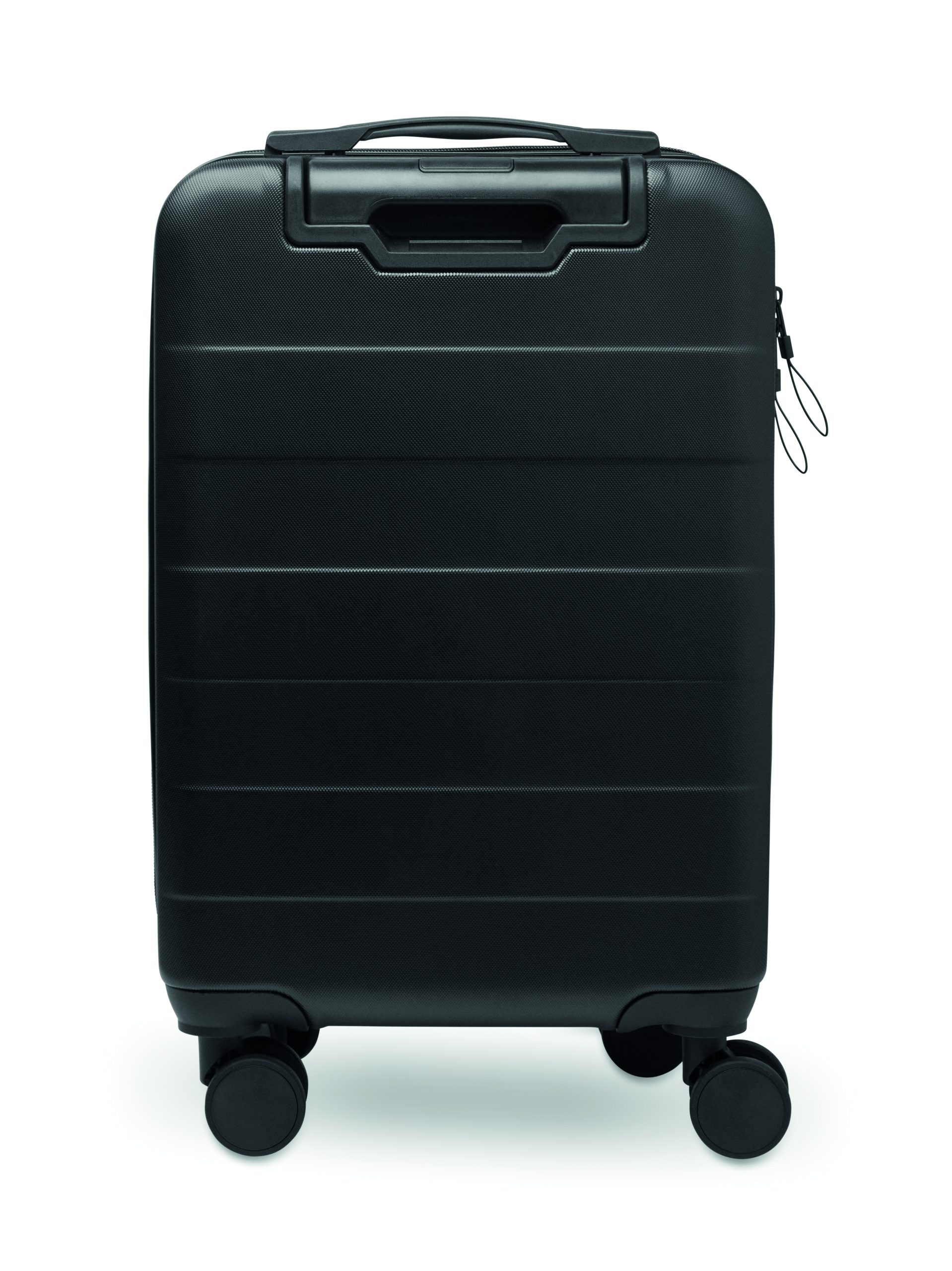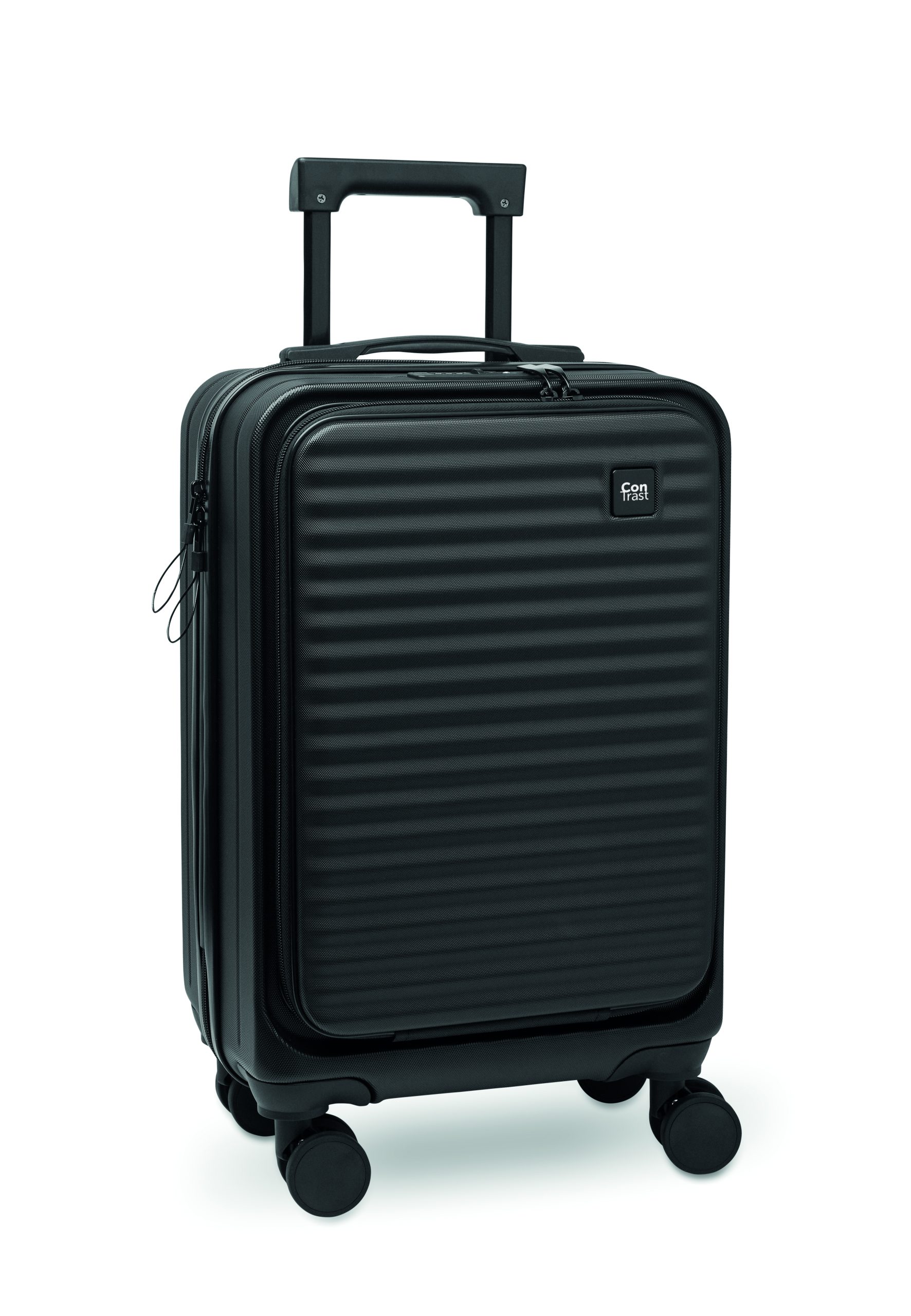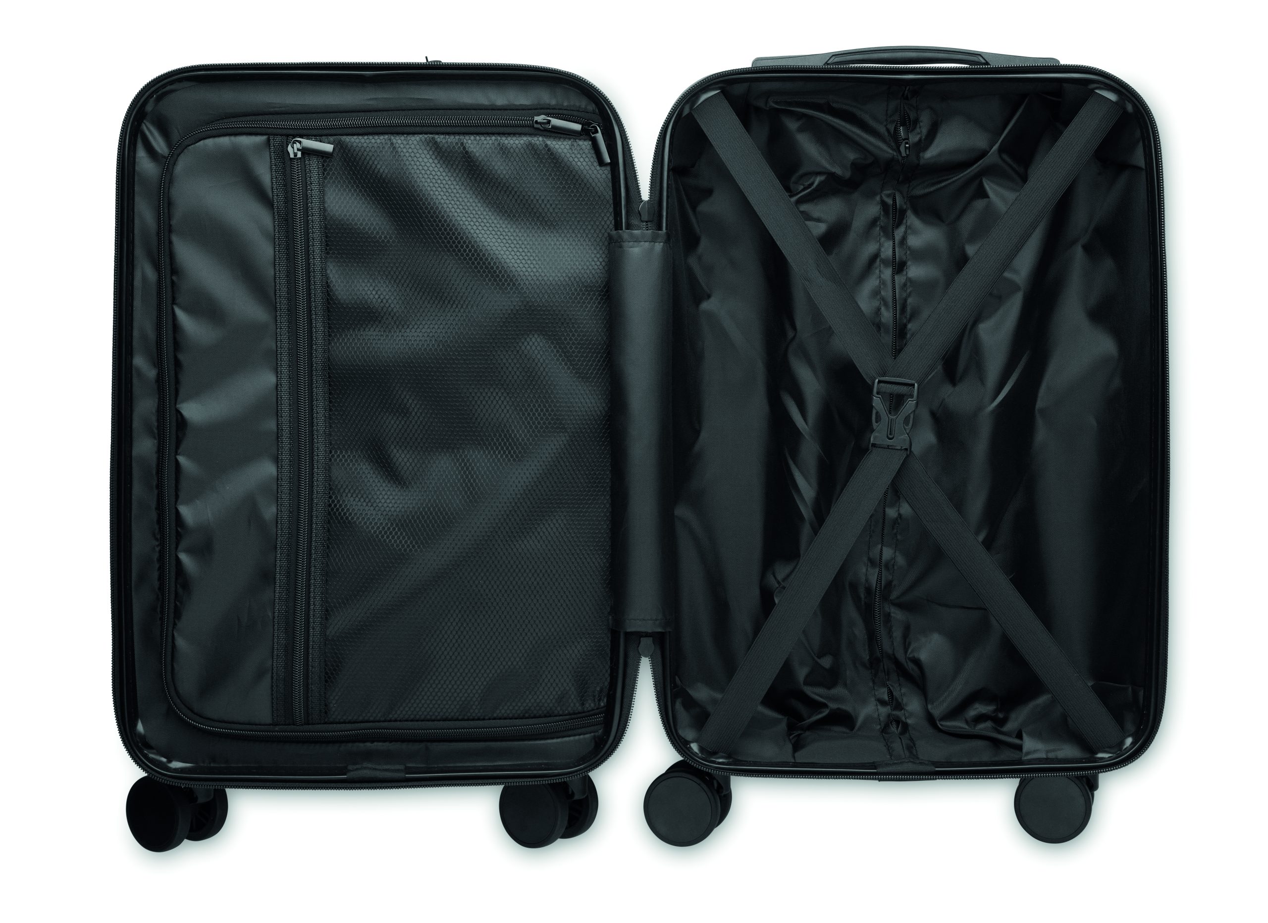 20-calowa twarda walizka z ABS. 1 komora główna z przegrodą wewnętrzną. Dodatkowa przednia przegroda na dokumenty zapinana na zamek i wyściełana przegroda na laptopa 15”. Zawiera zamek bezpieczeństwa (TSA). Jeździ na 4 kółkach.