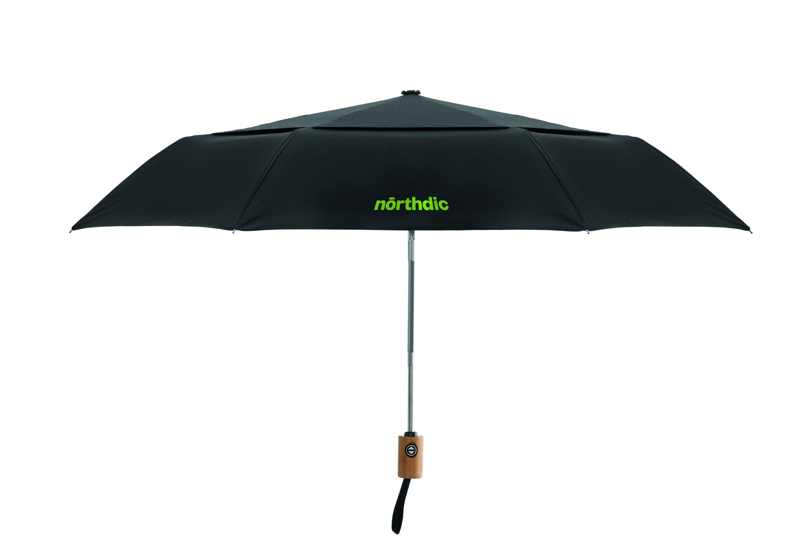 21-calowy, składany, automatycznie otwierany wiatroodporny parasol z materiału 190T polyctotton (70% poliester, 30% bawełna) z aluminiowym trzonem, końcówkami i bambusową rączką. Czarne żebra z włókna szklanego. Zawiera pasujące etui. Automatyczne zamknięcie.