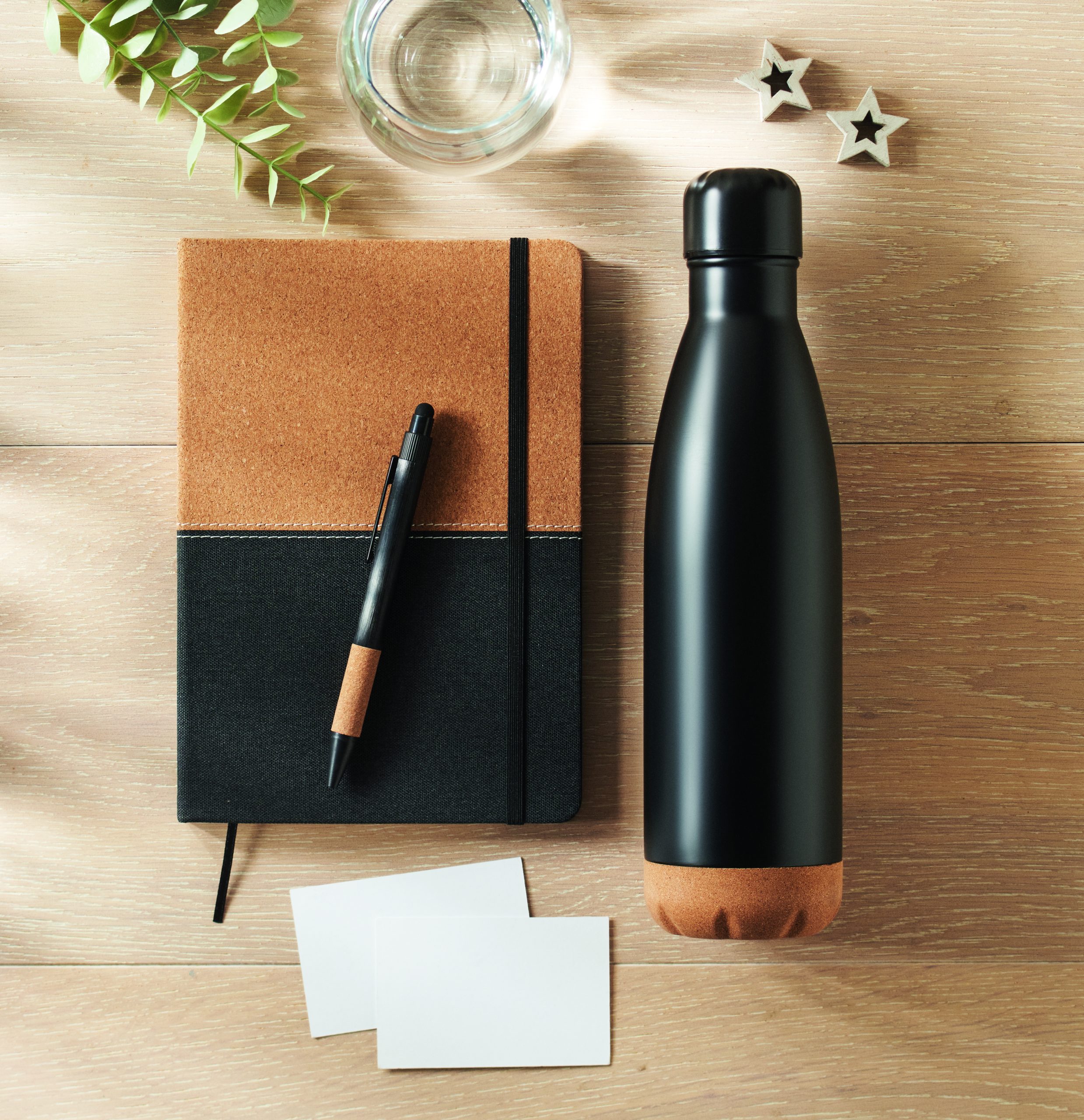 3-częściowy zestaw upominkowy zawierający izolowaną butelkę ze stali nierdzewnej o pojemności 500 ml, notatnik A5 z twardą okładką z RPET i korka, 160 stron w linie (80 kartek) i aluminiowy długopis. FSC®-certified | FSC MIX CREDIT, P7.1, N3.7, FSC-C213206