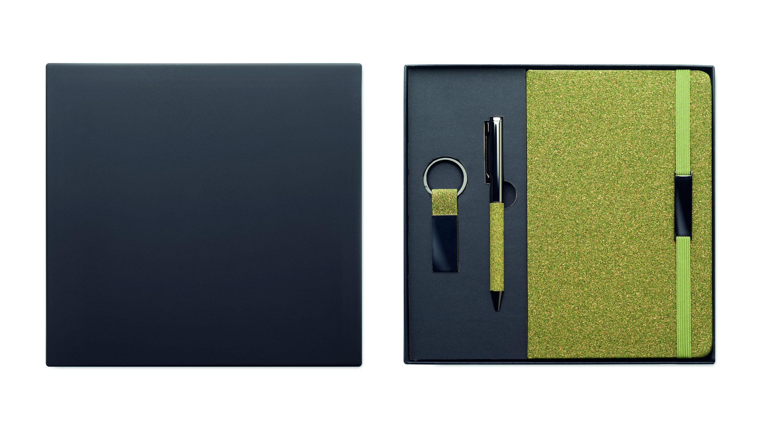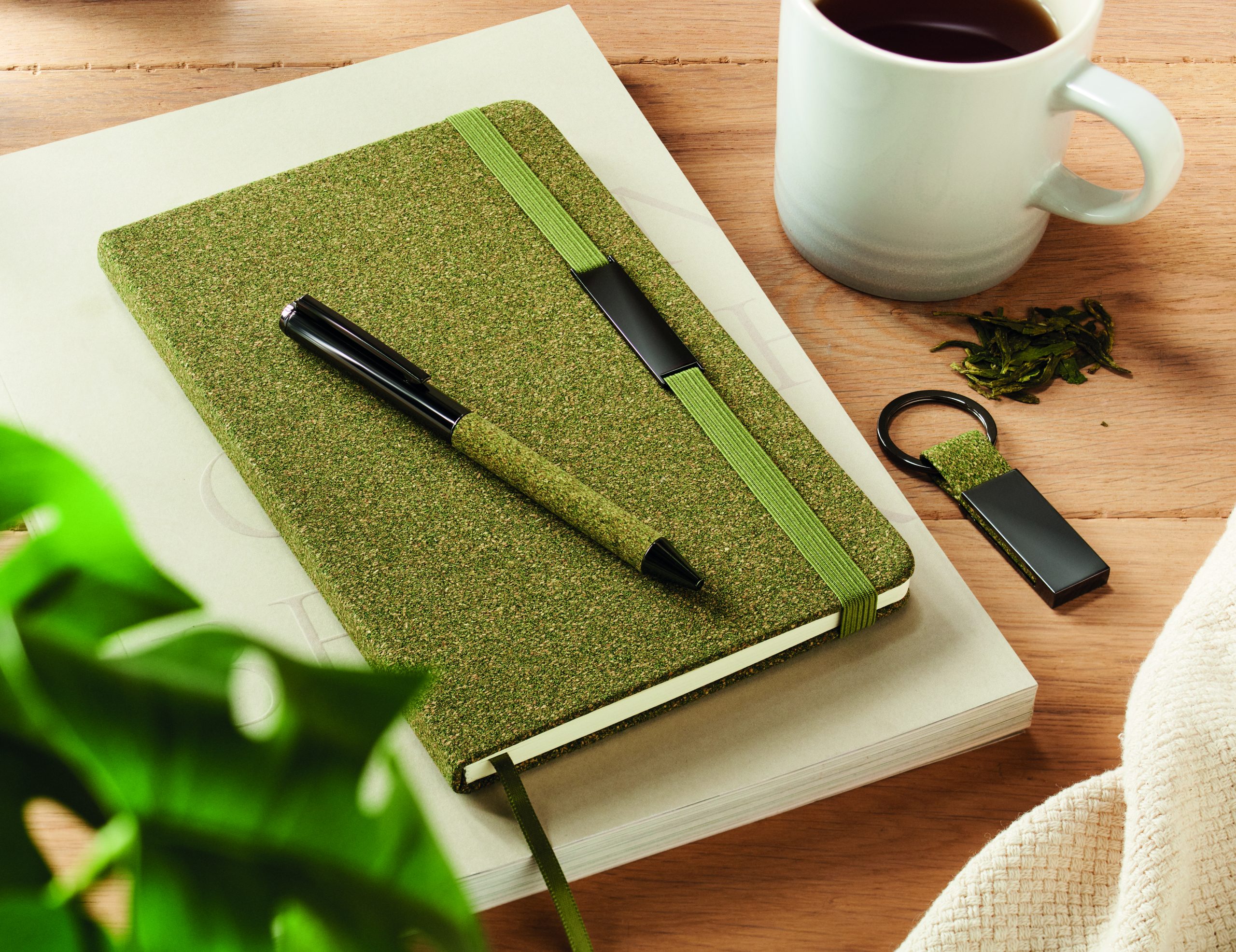 Zestaw składający się z notesu A5 w twardej okładce, 160 kartek w linie (80 kartek/70 g/m²), metalowego długopisu i breloka. Wykonany w 20% z fusów herbacianych, w 30% z korka i w 50% z tkaniny polycotton. Metalowy detal na elastycznym pasku. FSC®-certified | FSC MIX CREDIT, N7.1, FSC-C213206