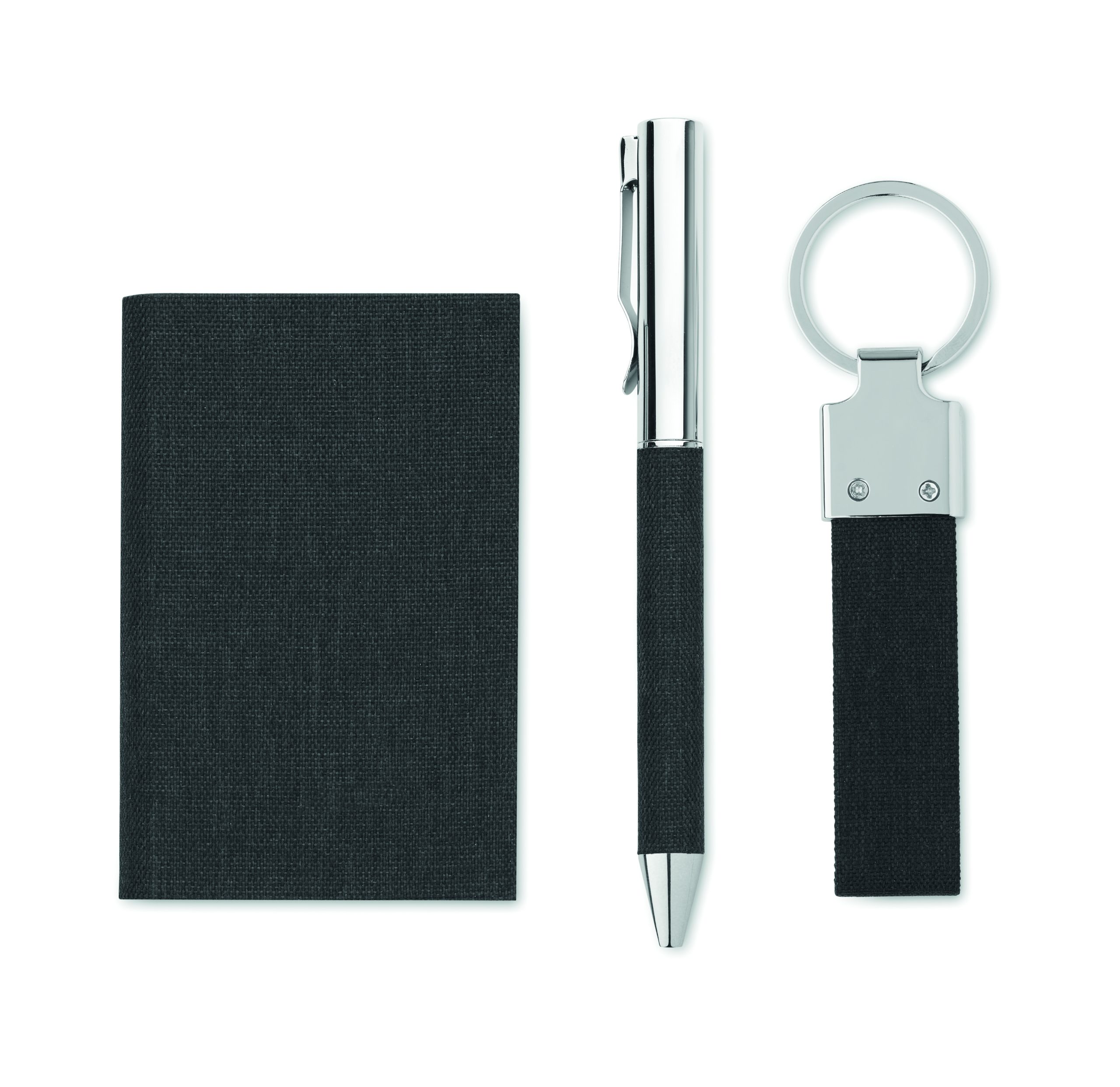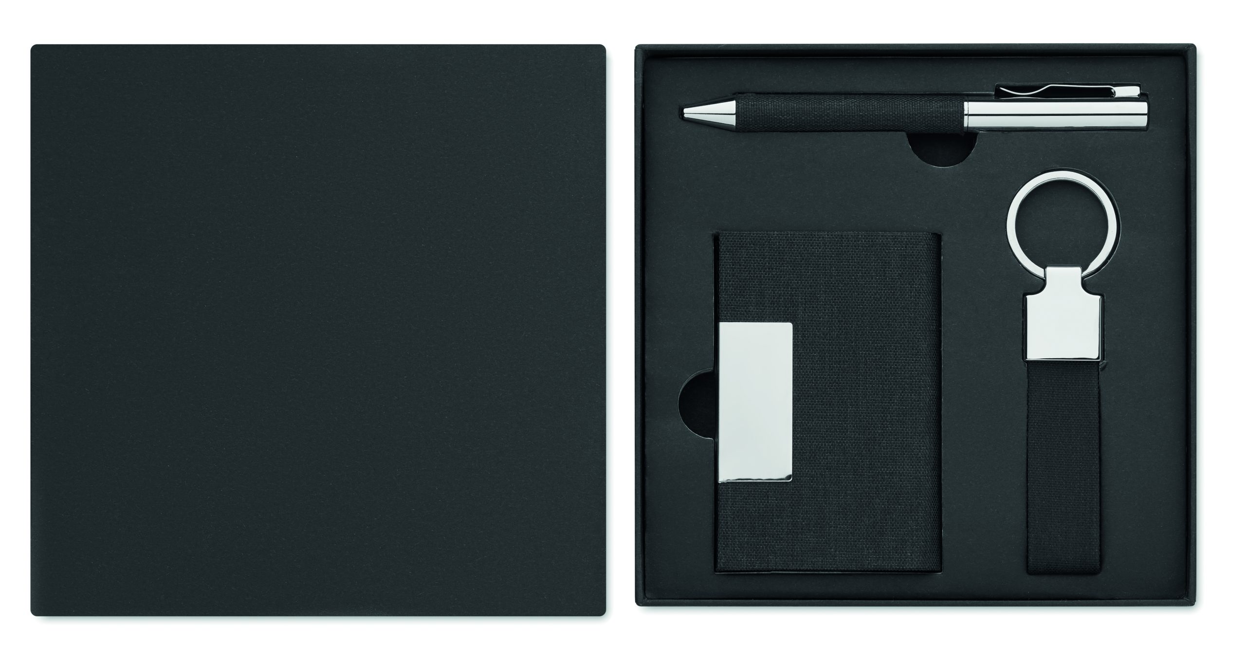 3-częściowy zestaw upominkowy w pudełku. Zawiera metalowy przekręcany długopis z detalami z poliestru RPET, brelok do kluczy z poliestru RPET i etui na karty z poliestru RPET z metalową płytką. Niebieski tusz.