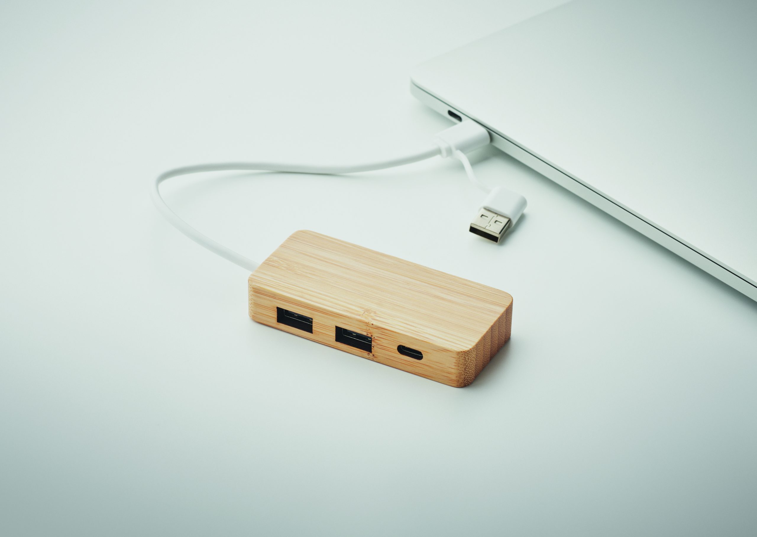 3-portowy hub USB-C/A w bambusowej obudowie. Wyjście: 2 x Type-A i 1 x Type-C. Wejście: 2 w 1 Typ-C i Typ-A. Długość kabla: 20 cm.