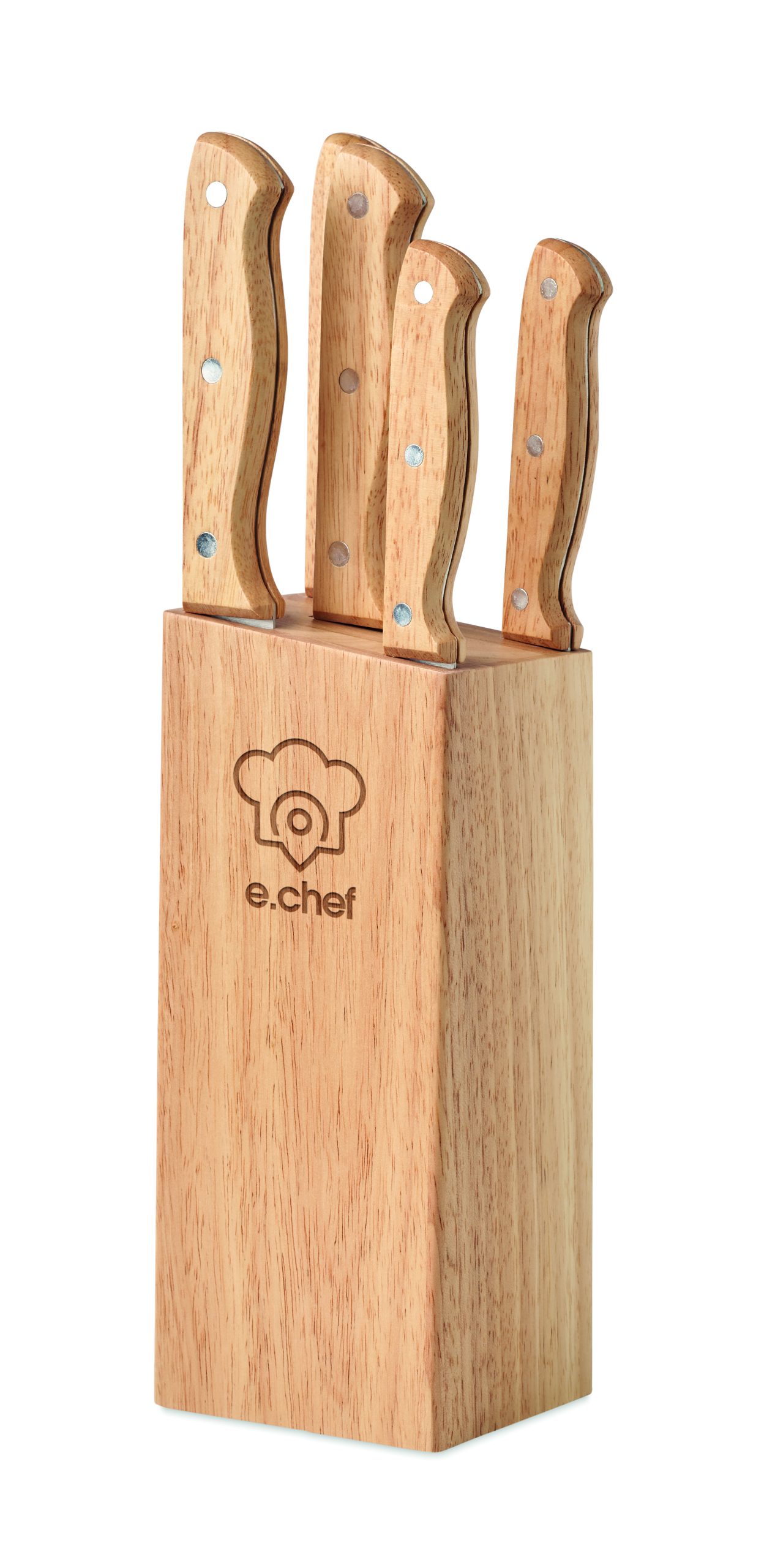 Drewniany zestaw noży ze stojakiem i 5 różnymi nożami: nóż szefa kuchni, nóż do chleba, do plastrowania, obieraczka i uniwersalny nóż kuchenny. Stal nierdzewna z drewnianą rączką.
