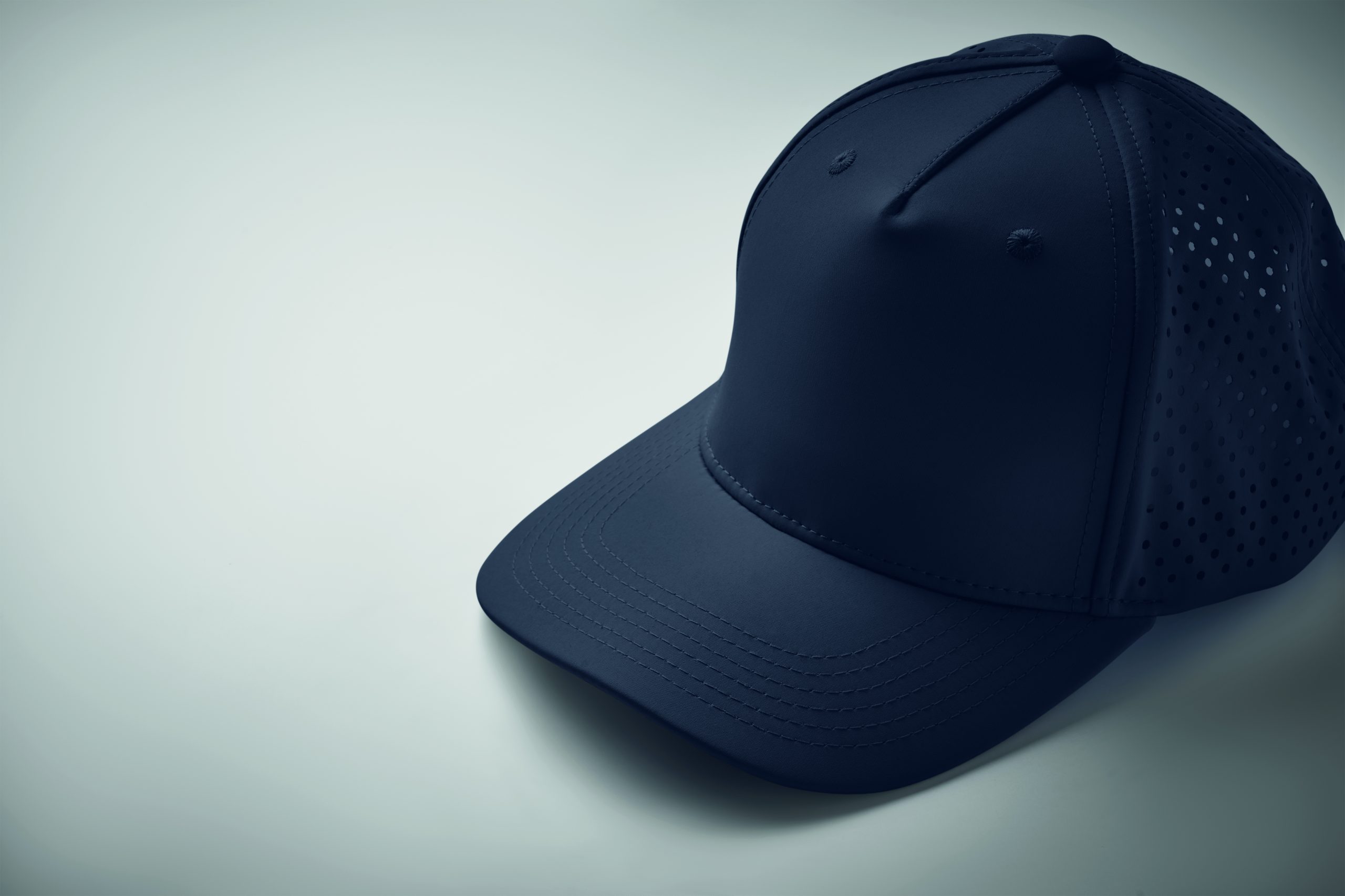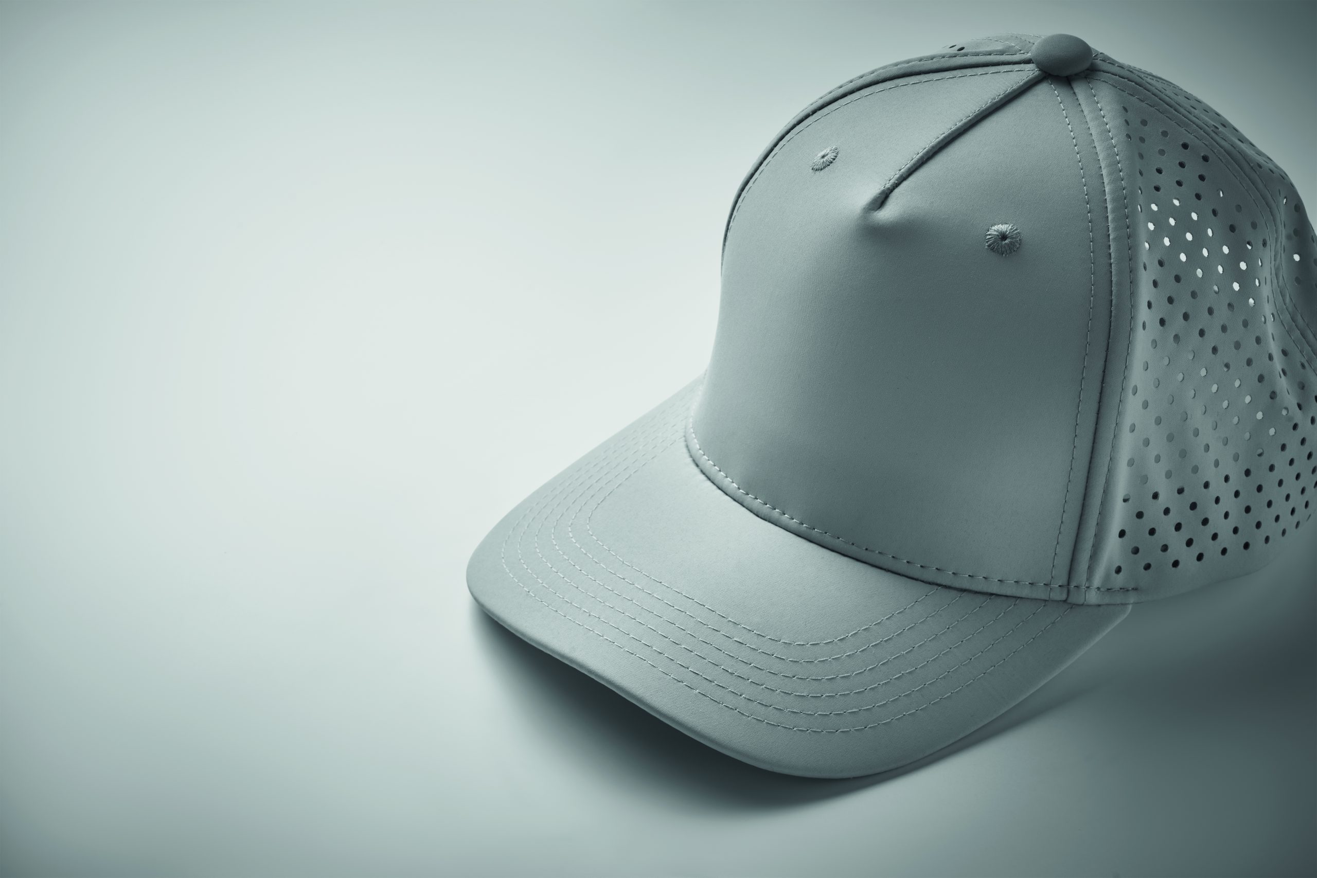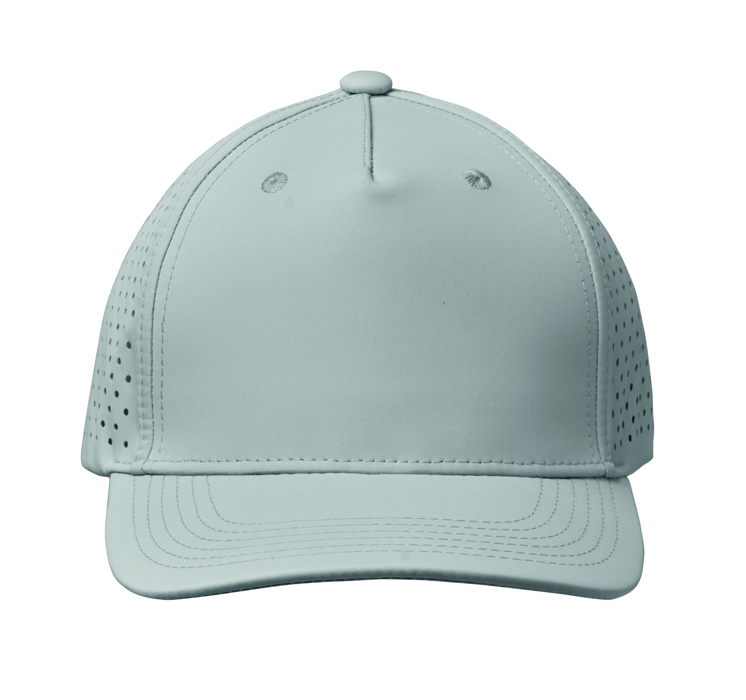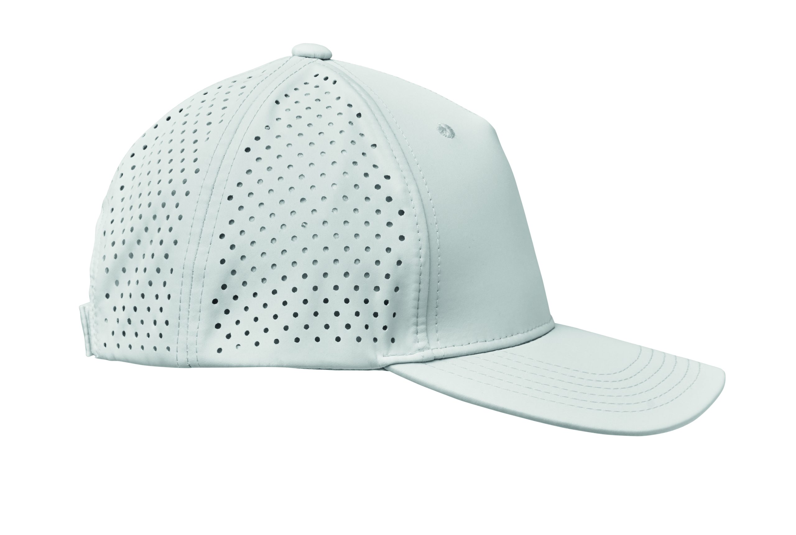 5-panelowa czapka z poliestru z regulowanym zapięciem na rzep i laserowo perforowanymi otworami z 2 obszytymi oczkami w dopasowanym kolorze. Produkt jest szybkoschnący, odporny na pot i wodę. 130 gr/m²