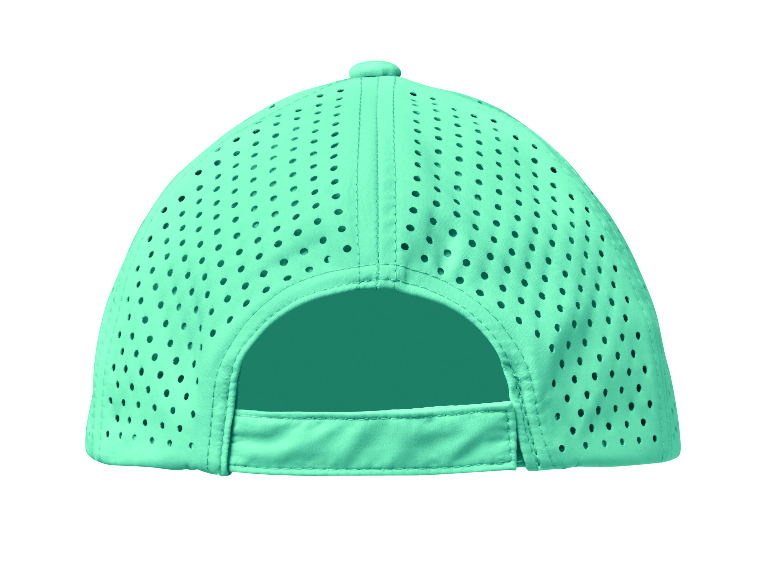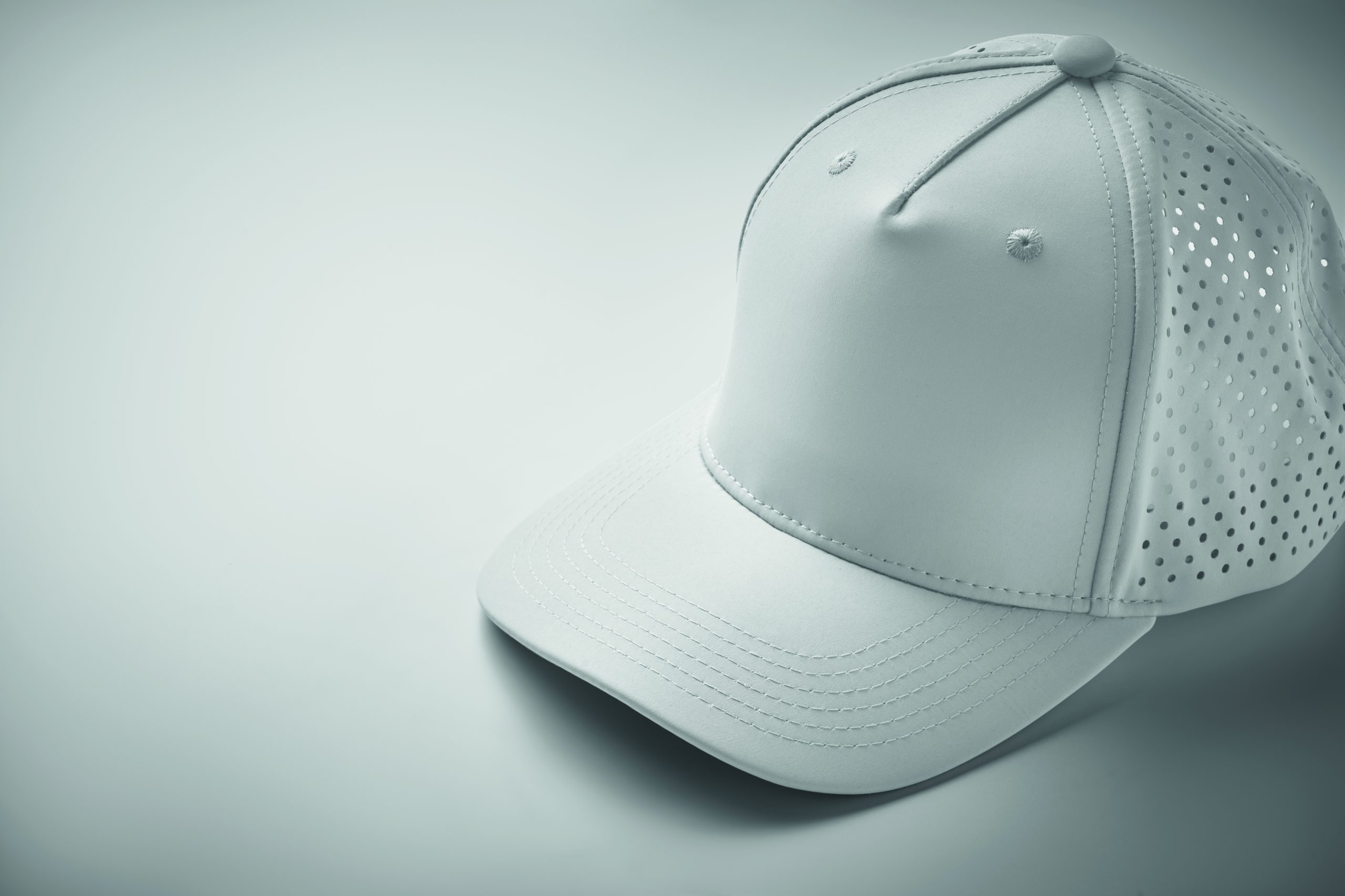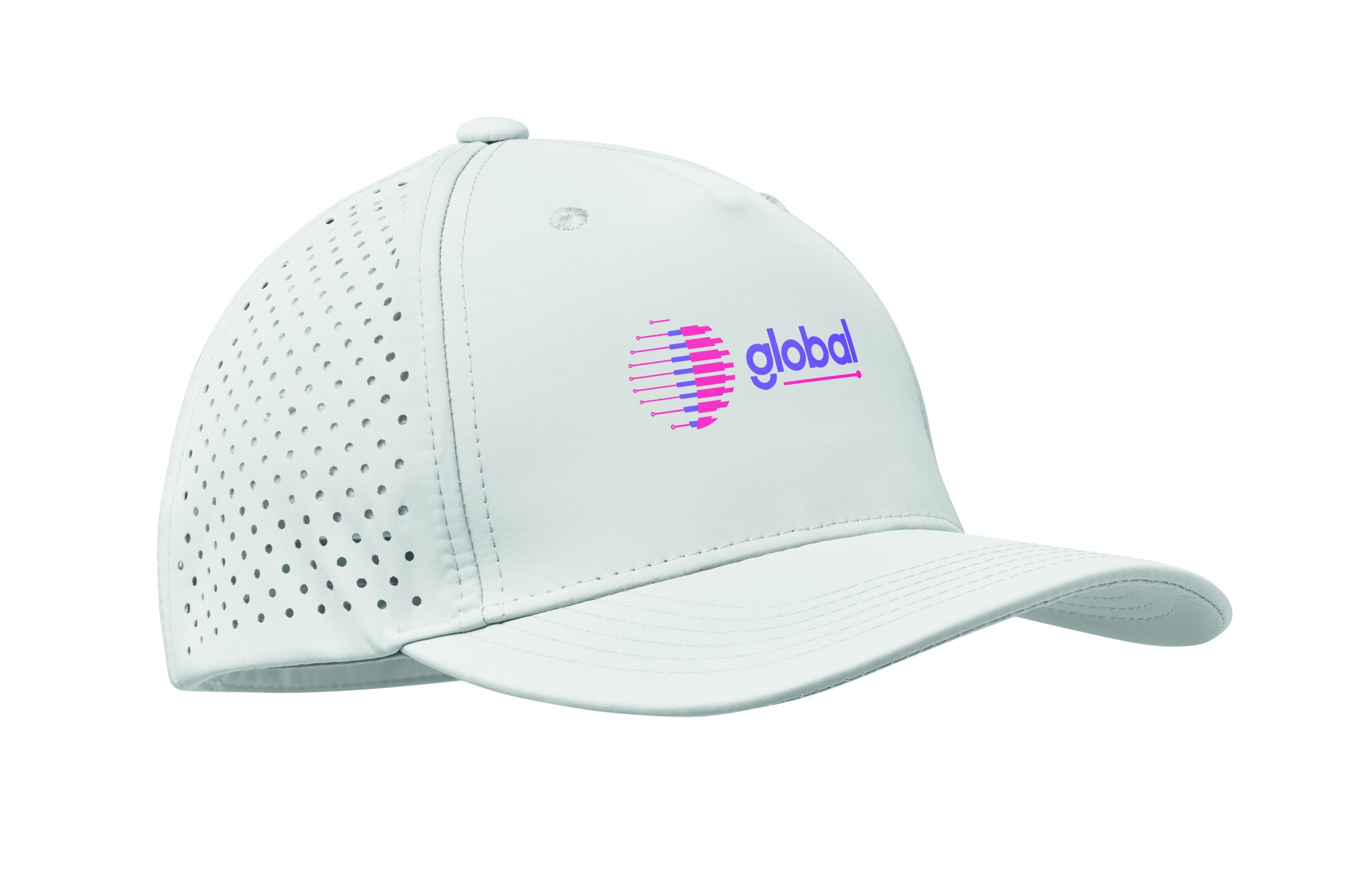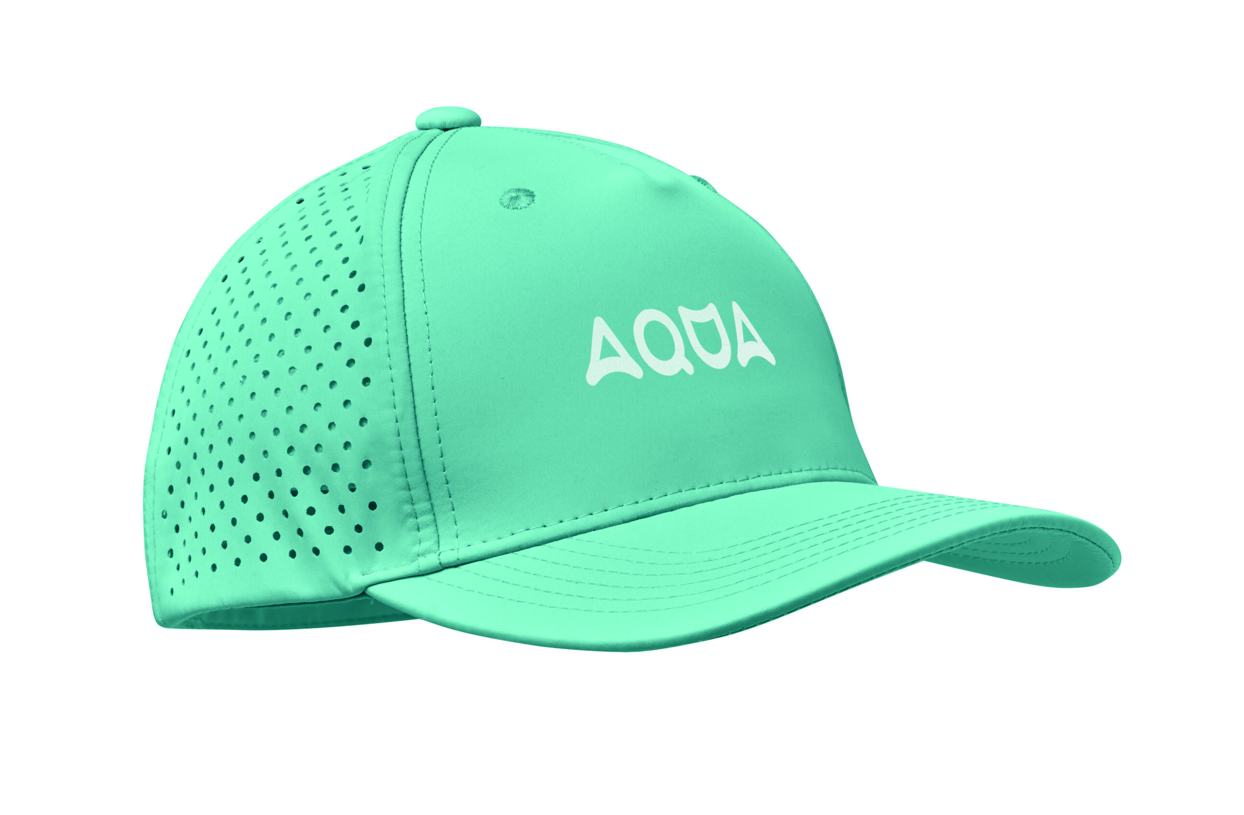 5-panelowa czapka z poliestru z regulowanym zapięciem na rzep i laserowo perforowanymi otworami z 2 obszytymi oczkami w dopasowanym kolorze. Produkt jest szybkoschnący, odporny na pot i wodę. 130 gr/m²