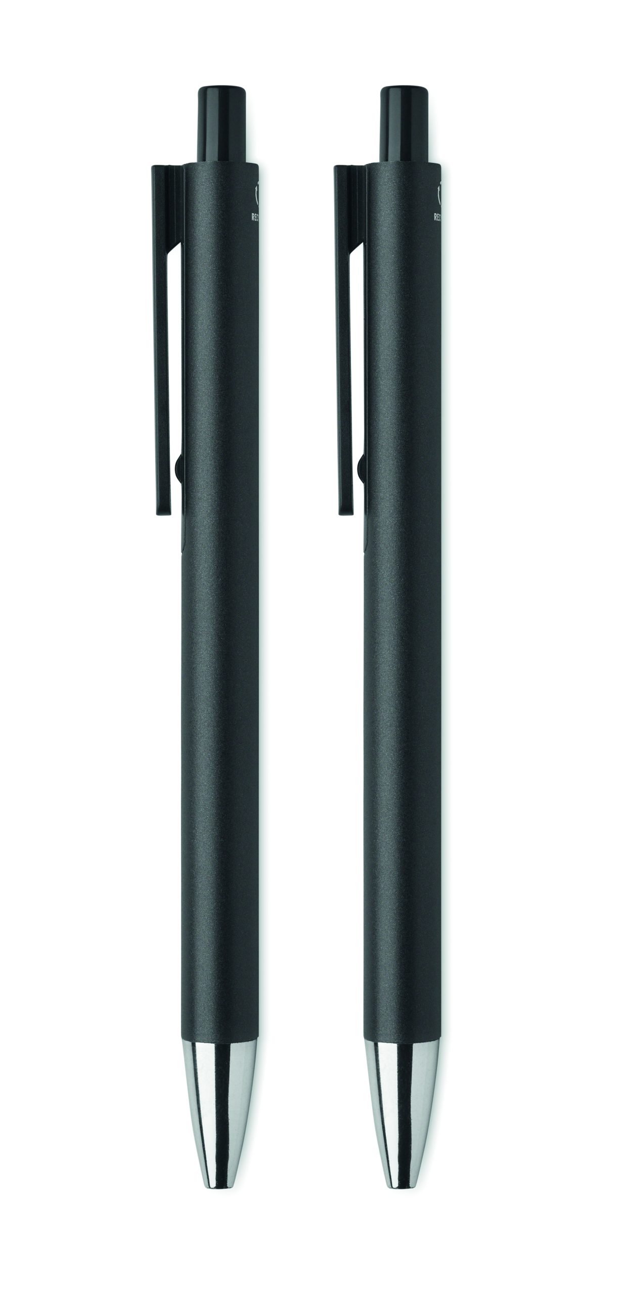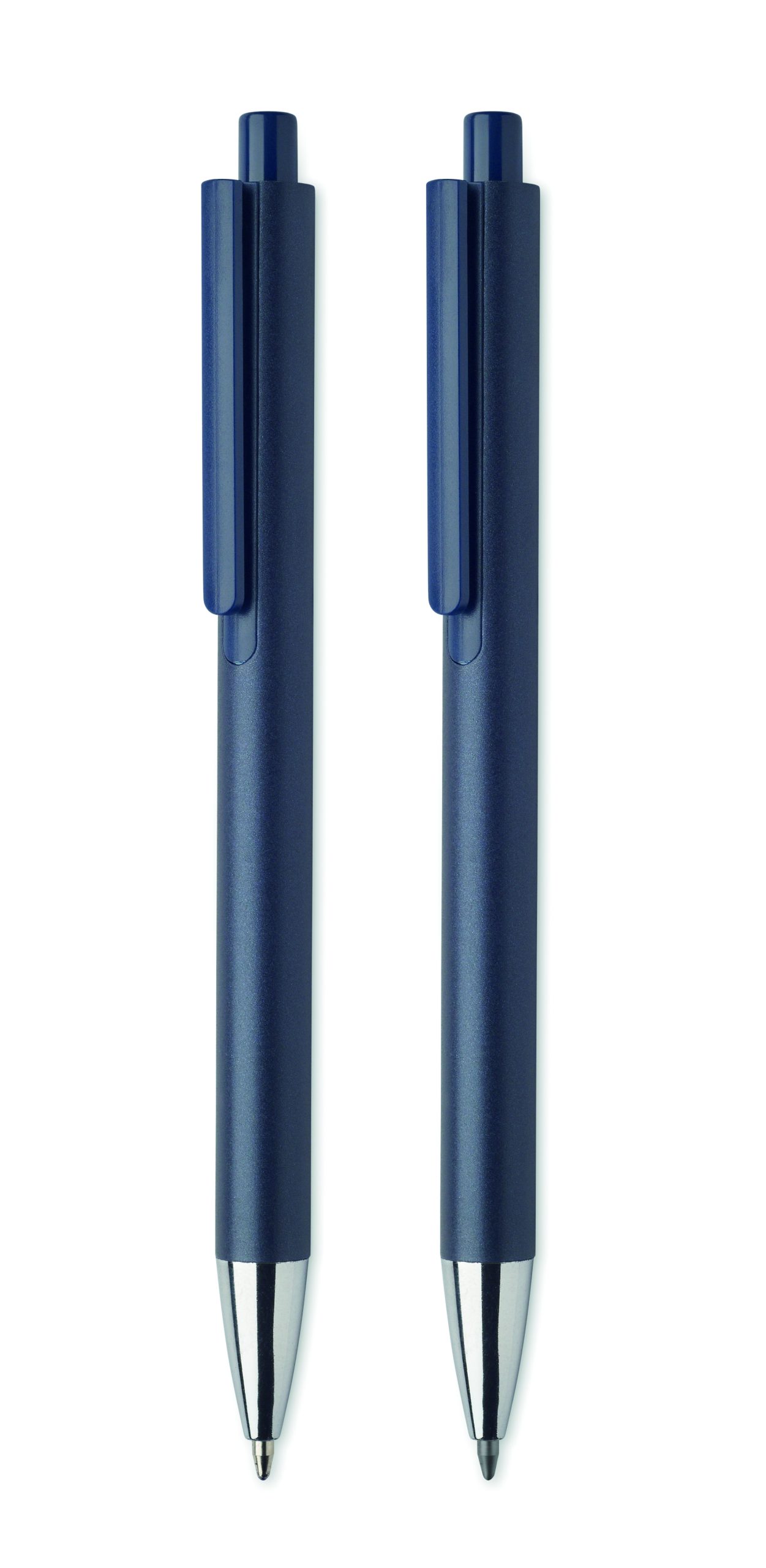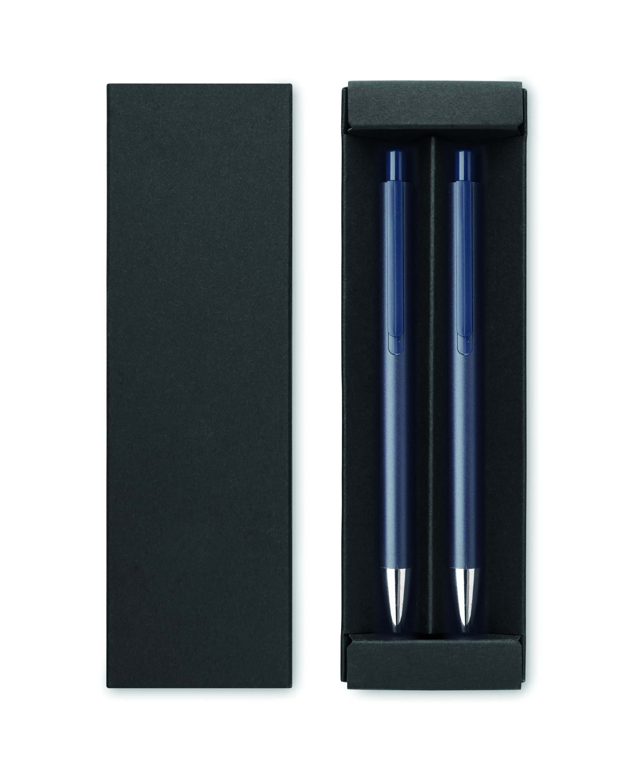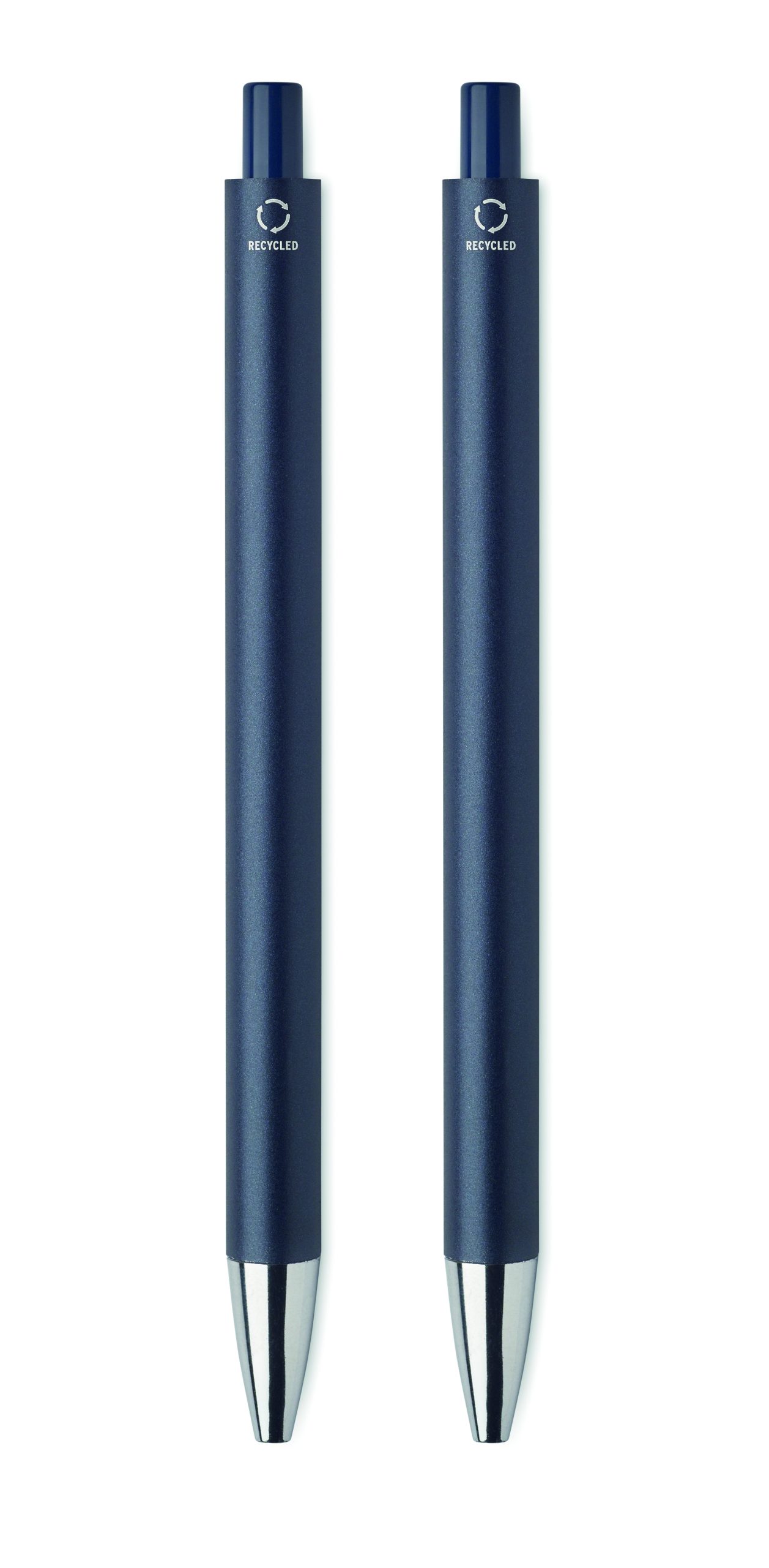 Zestaw długopisów z recyklingowanego aluminium z 1 długopisem i 1 grafitowym ołówkiem wiecznym. Niebieski tusz długopisu. Prezentowany w pudełku z papieru z recyklingu.