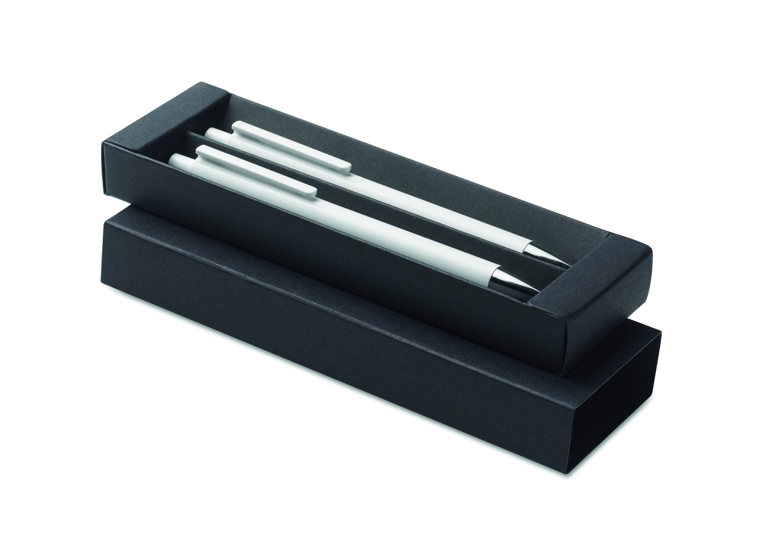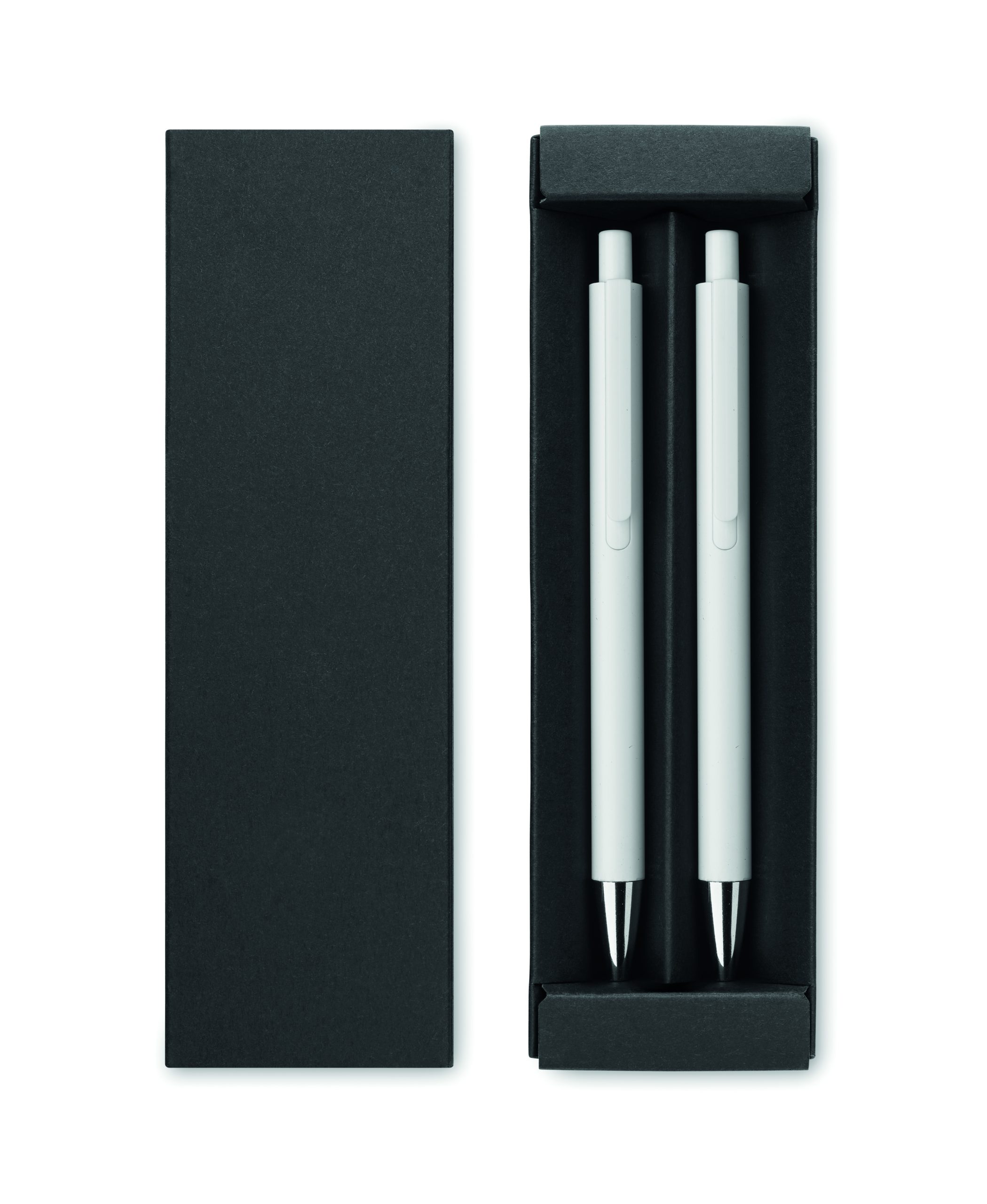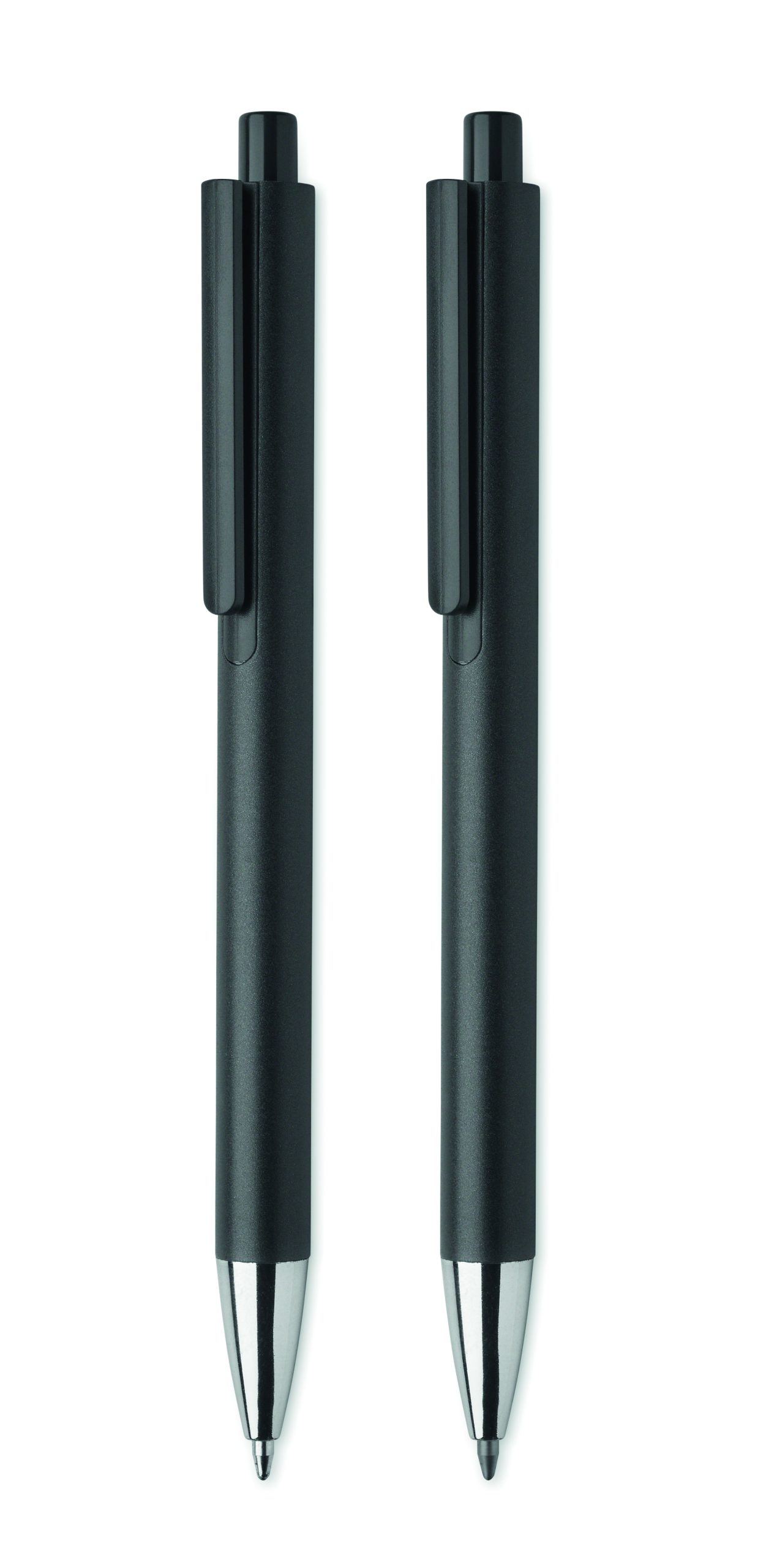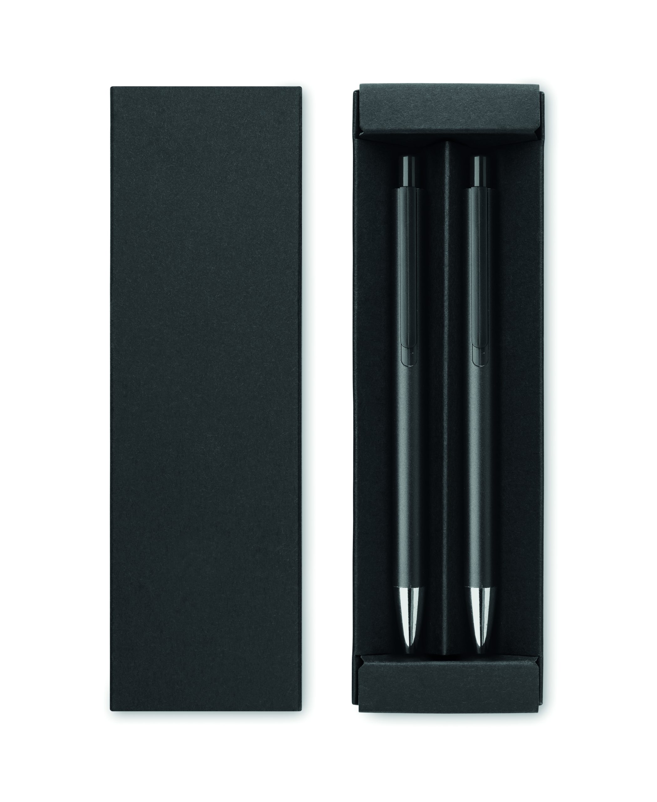 Zestaw długopisów z recyklingowanego aluminium z 1 długopisem i 1 grafitowym ołówkiem wiecznym. Niebieski tusz długopisu. Prezentowany w pudełku z papieru z recyklingu.