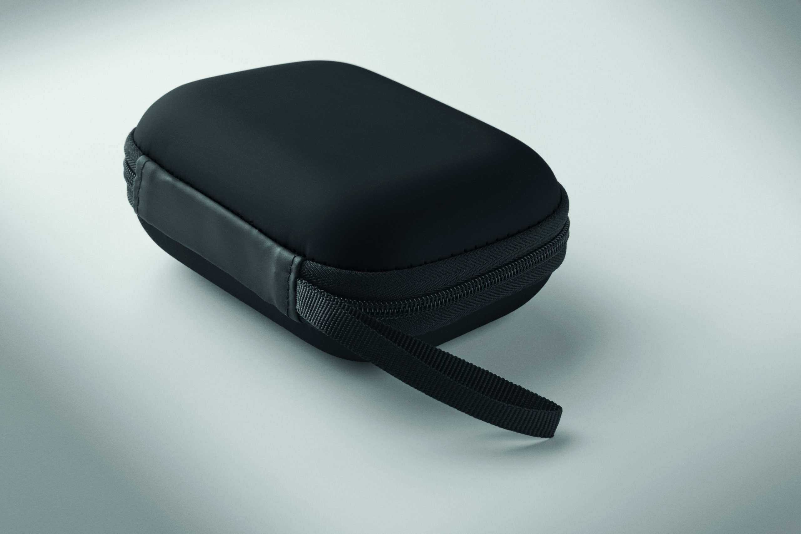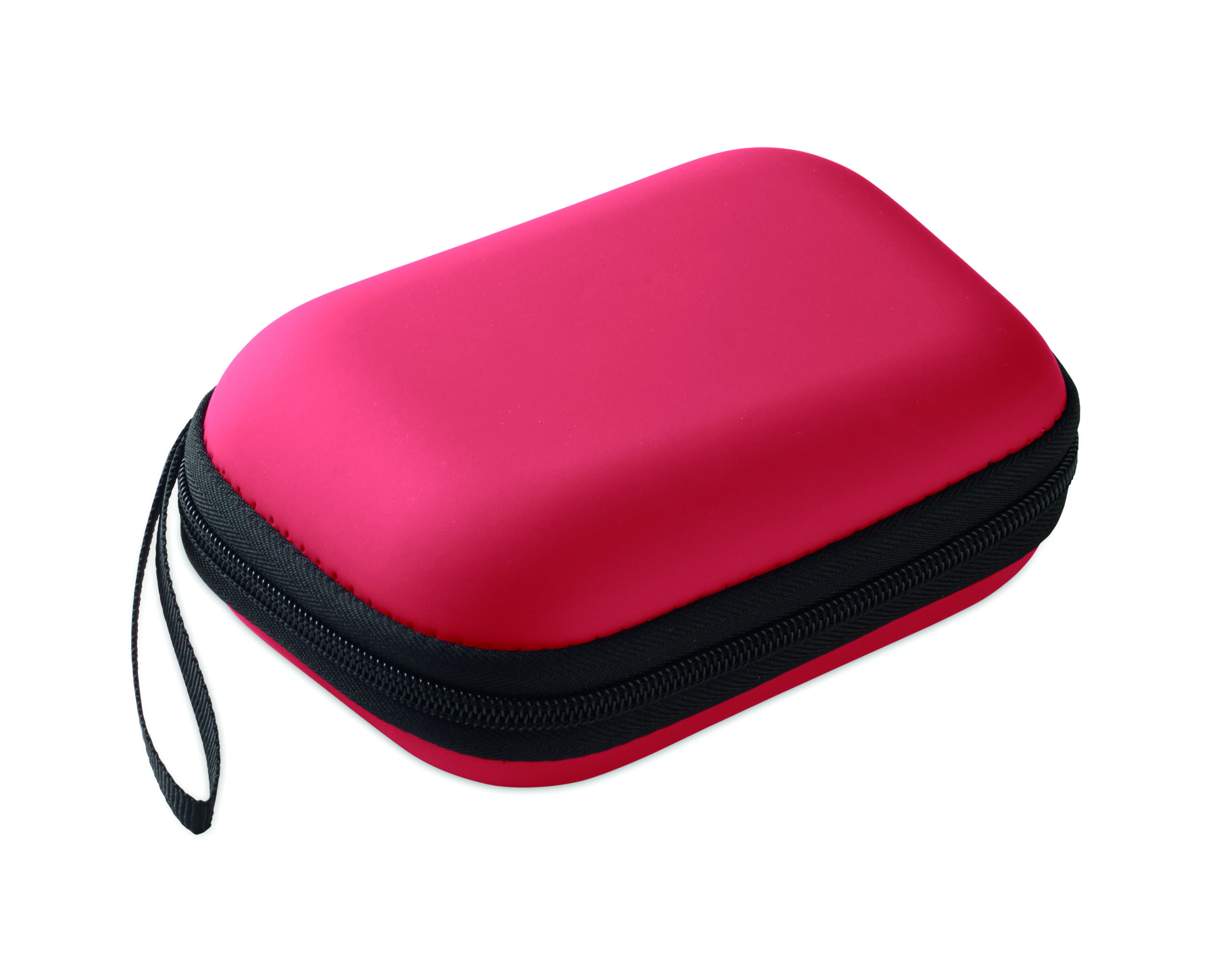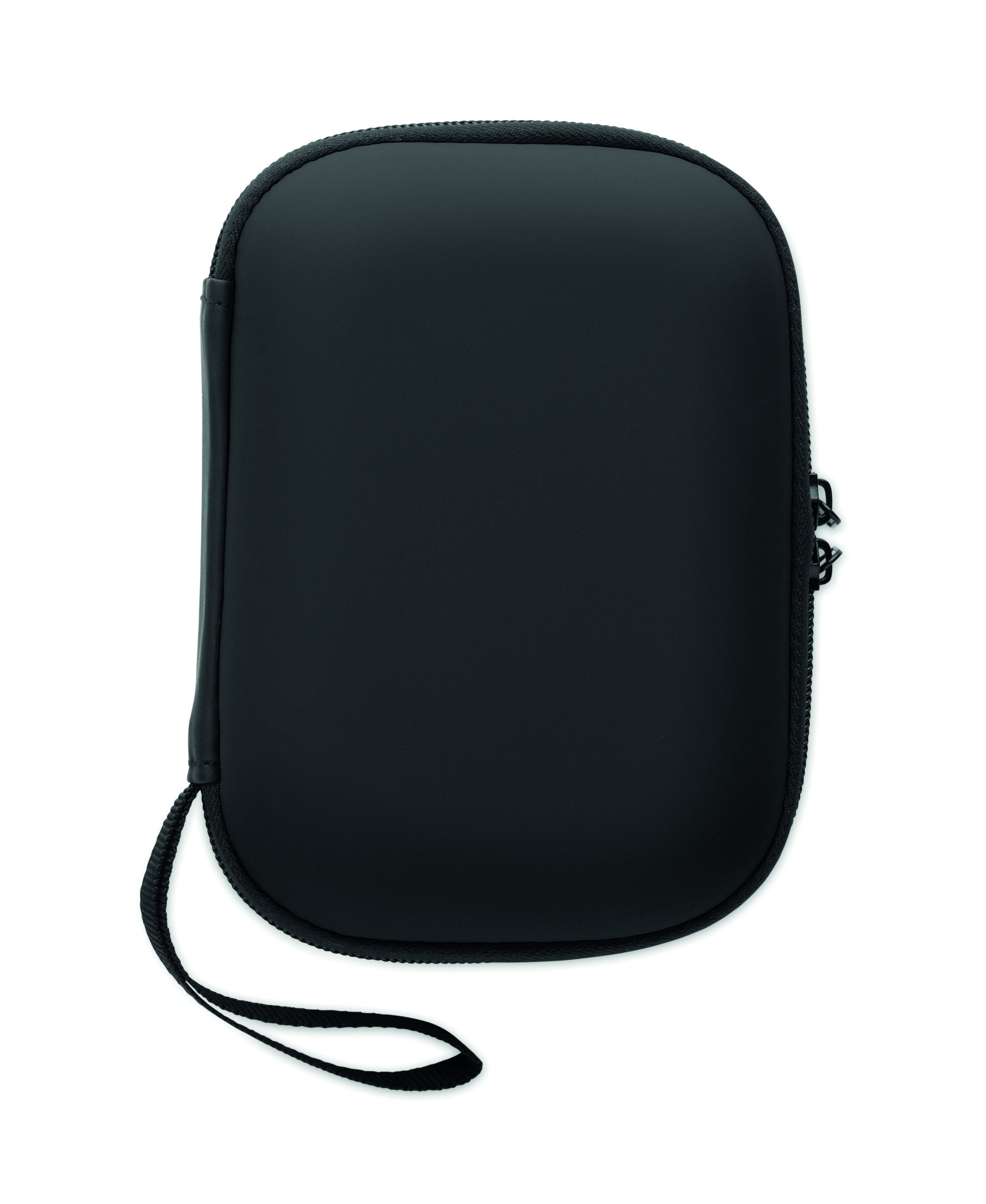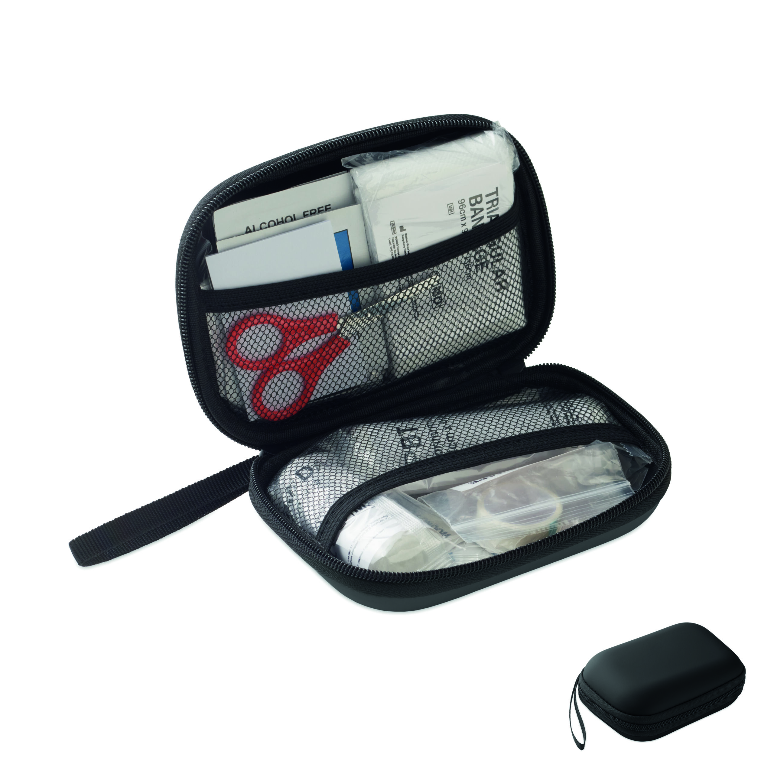 Apteczka pierwszej pomocy w twardym etui z PU. Zawiera 2 rękawiczki, 1 koc, 1 taśmę, 2 bandaże, 1 nożyczki, 4 waciki, 10 plastrów i 6 chusteczek czyszczących. Niedostępna w sprzedaży poza UE.