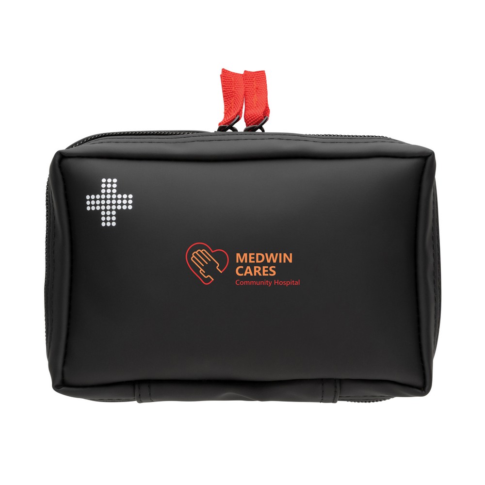 Apteczka 24 el., w pokrowcu z materiałów z recyklingu na zamek błyskawiczny, spełnia wymagania normy EN ISO 13485:2016, 93/42/EWG i UE (2017/745), całkowita zawartość materiałów z recyklingu obliczona na podstawie wagi całkowitej produktu: 46%