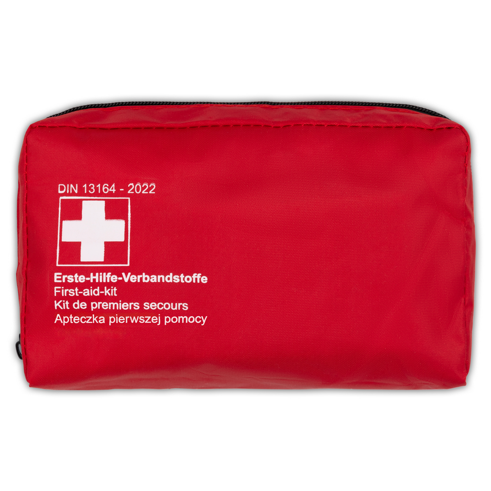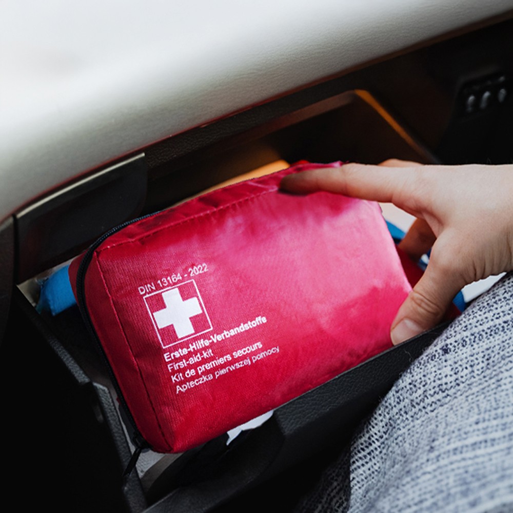 Apteczka samochodowa w pokrowcu, 30 el., główna przegroda na zamek błyskawiczny, wewnątrz: kompres ratunkowy 60 cm x 80 m, bandaż trójkątny, jednorazowe winylowe rękawiczki diagnostyczne 4 szt., plastry samoprzylepne o różnych wymiarach 14 szt., foliowy koc termiczny 160 cm x 210 cm, nożyczki do opatrunków, taśma klejąca 5 m x 2,5 cm, bandaż opatrunkowy o wymiarach 6 cm x 8 cm, bandaż o wymiarach 8 cm x 10 cm 2 szt., bandaż opatrunkowy o wymiarach 10 cm x 12 cm, kompres chłonny z włókniny 10 cm x 10 cm 6 szt., bandaż elastyczny 6 cm x 4 m 2 szt., bandaż elastyczny 8 cm x 4 m 3 szt., jednorazowa maska medyczna 2 szt., chusteczka oczyszczająca 2 szt., instrukcja pierwszej pomocy, produkt wykonany między innymi z poliestru. Spełnia wymagania normy DIN 13164 – 2022.