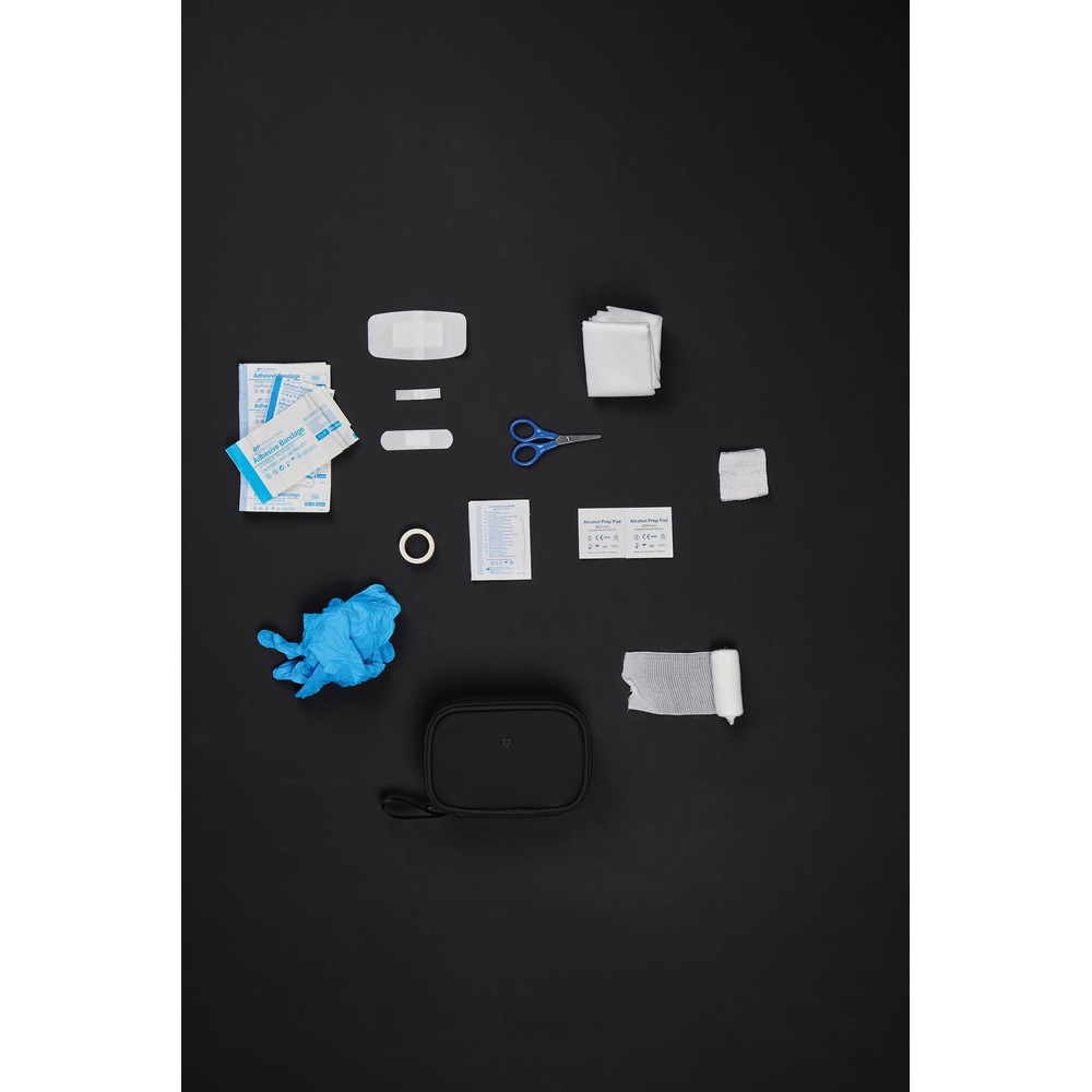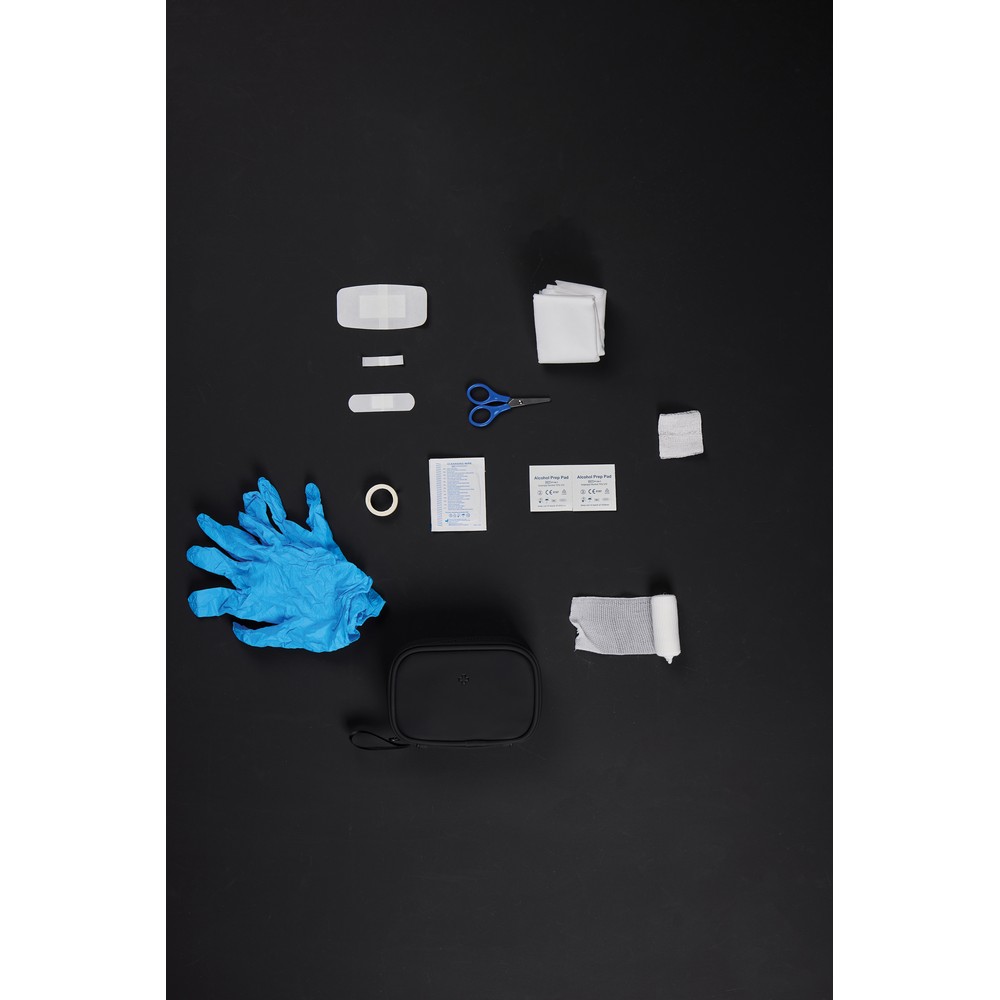 Apteczka, kompaktowa konstrukcja, zamykana na zamek błyskawiczny, wykonana z materiałów pochodzących z recyklingu z certyfikatem RCS, całkowita zawartość materiałów z recyklingu obliczona na podstawie wagi całkowitej przedmiotu: 23%