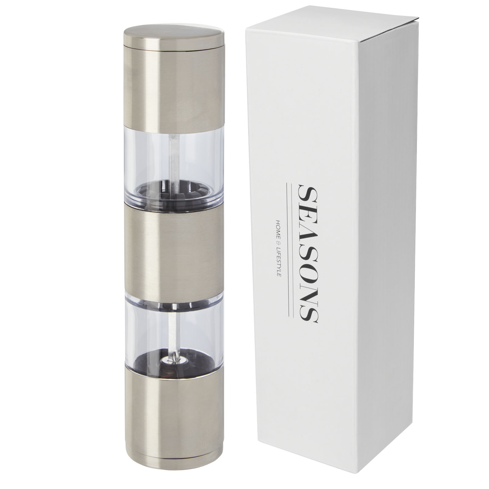 2-stronny młynek z jedną końcówką do soli i drugą do pieprzu. Pieprz i sól nie wchodzą w skład zestawu. Może pomieścić 50 g soli i 36 g pieprzu. Pojemność: 80 ml.