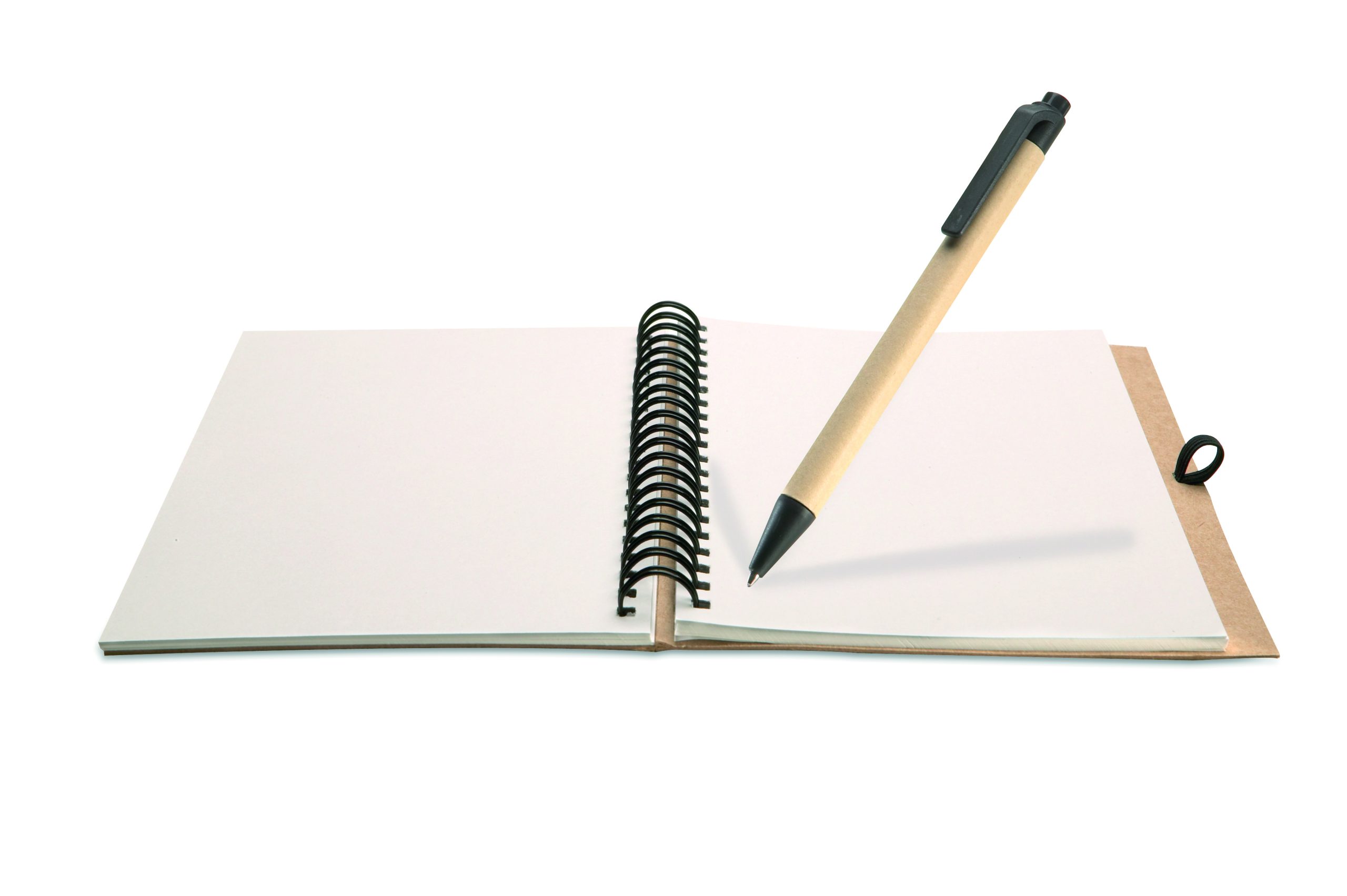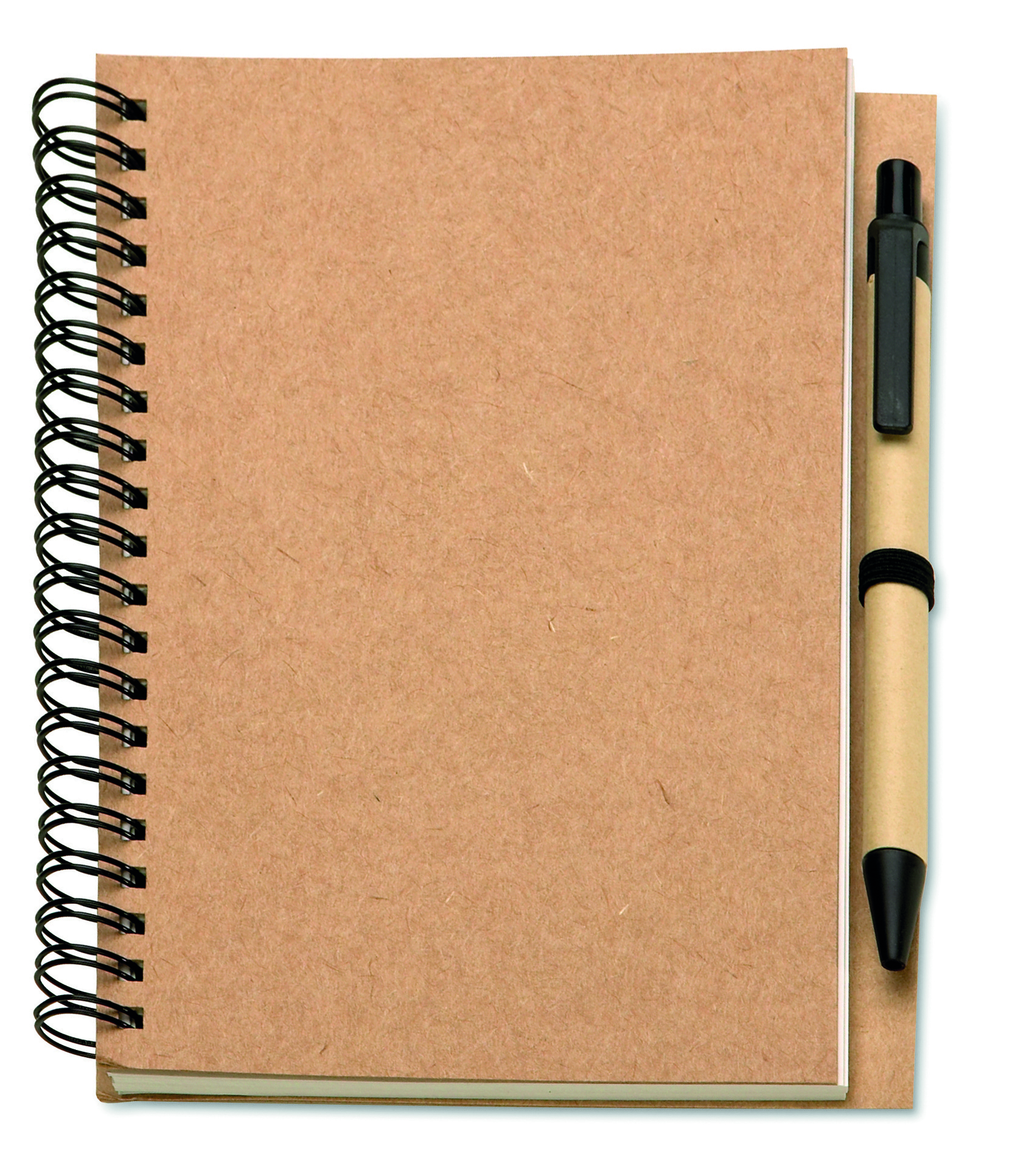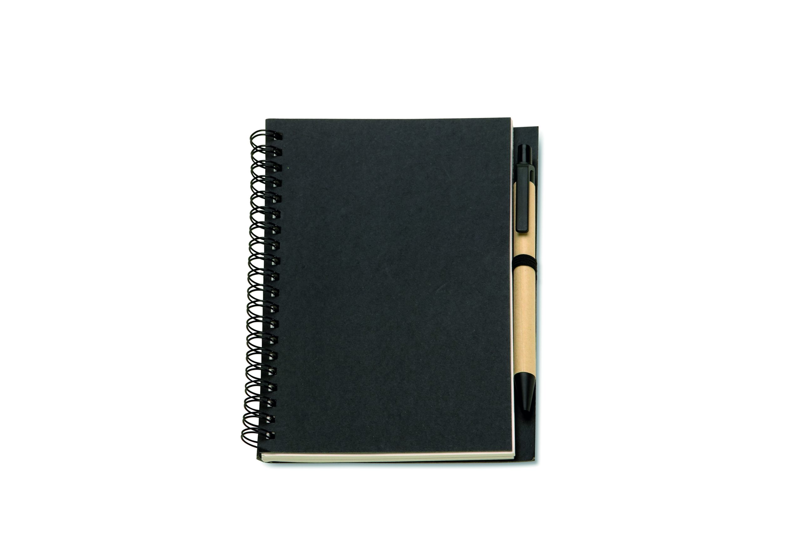 Notes z papieru z recyklingu z długopisem. Podwójna spirala. 140 czystych stron z papieru z recyklingu (70 kartek). Wciskany długopis z kartonu pochodzącego z recyklingu i biodegradowalnego plastiku. Niebieski tusz. Czarny, elastyczny uchwyt na długopis. FSC MIX CREDIT | P7.1 | FSC-C213206