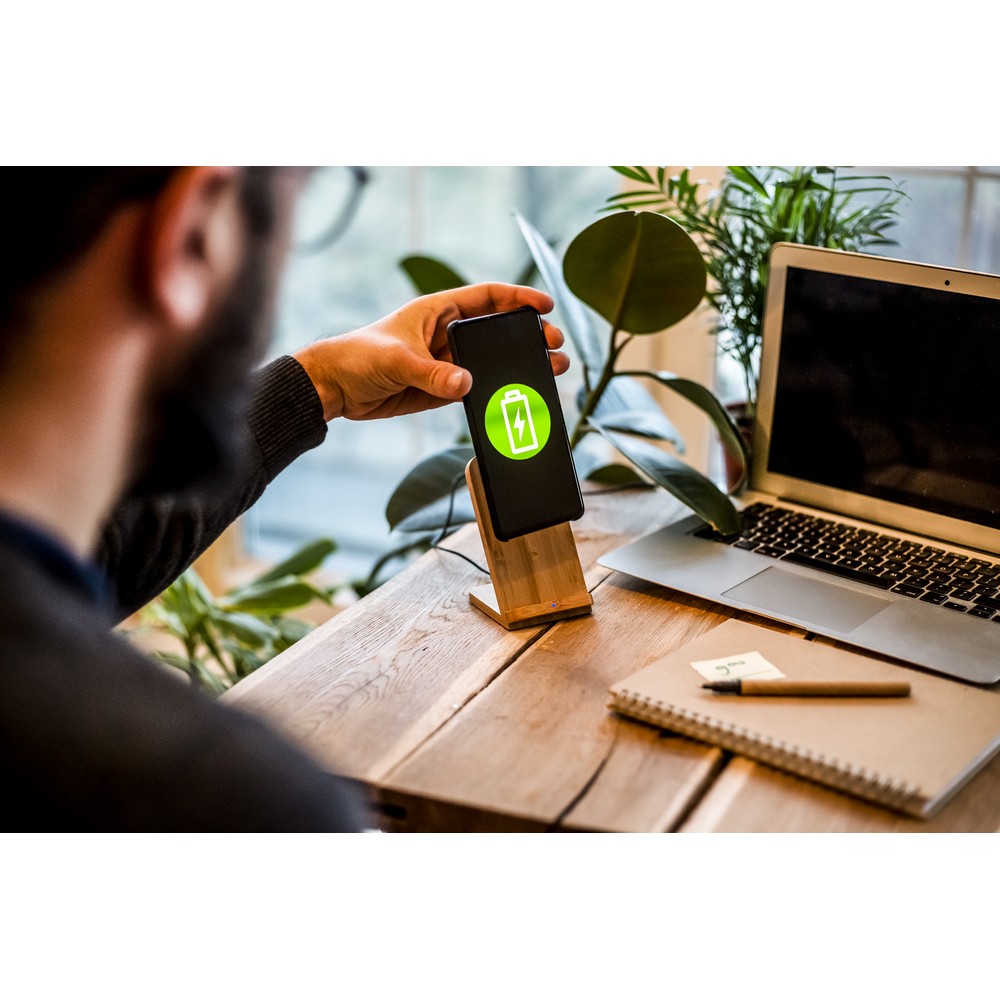 Bambusowa ładowarka bezprzewodowa B’RIGHT 10W, stojak na telefon, działa z urządzeniami posiadającymi możliwość ładowania indukcyjnego, wejście USB-C 5V/2A, 9V/1.67A, wyjście bezprzewodowe 5V/1A, 9V/1.2A, zasięg ładowania bezprzewodowego do 8 mm, kabel USB-C w komplecie