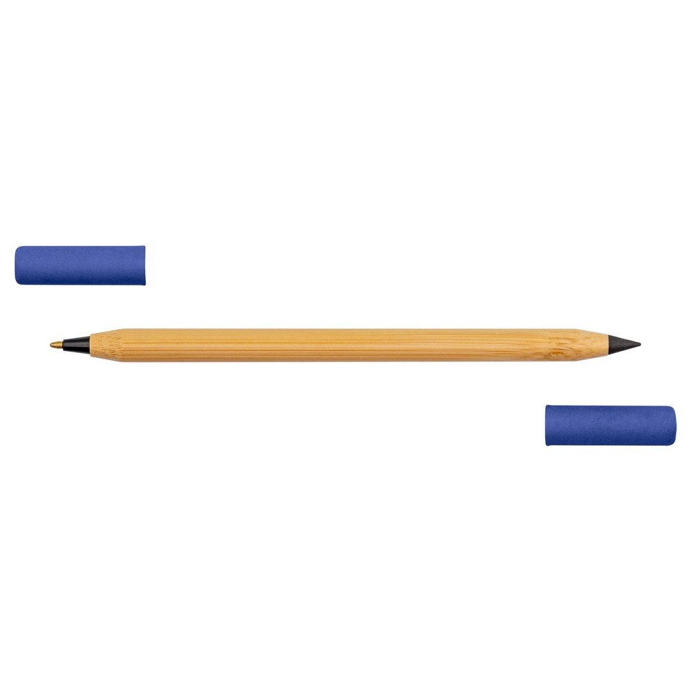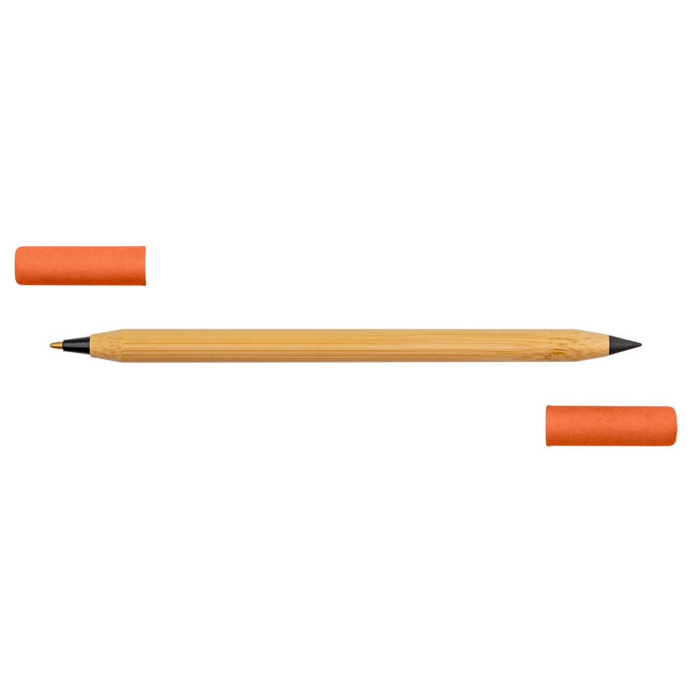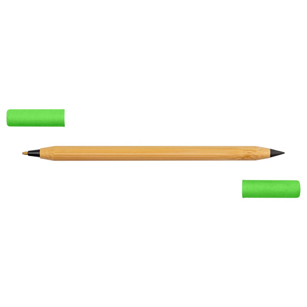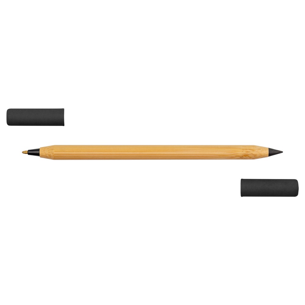 Długopis 2 w 1, „wieczny” ołówek, dzięki wykorzystaniu specjalnej wolnościerającej się końcówki długość pisania ołówka to około 1500 metrów, naostrzony, bambusowy trzon, dwie kolorowe zatyczki wykonane z papieru