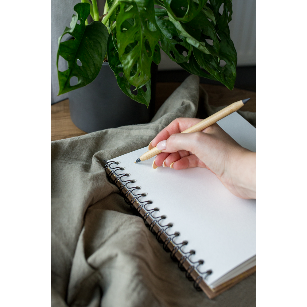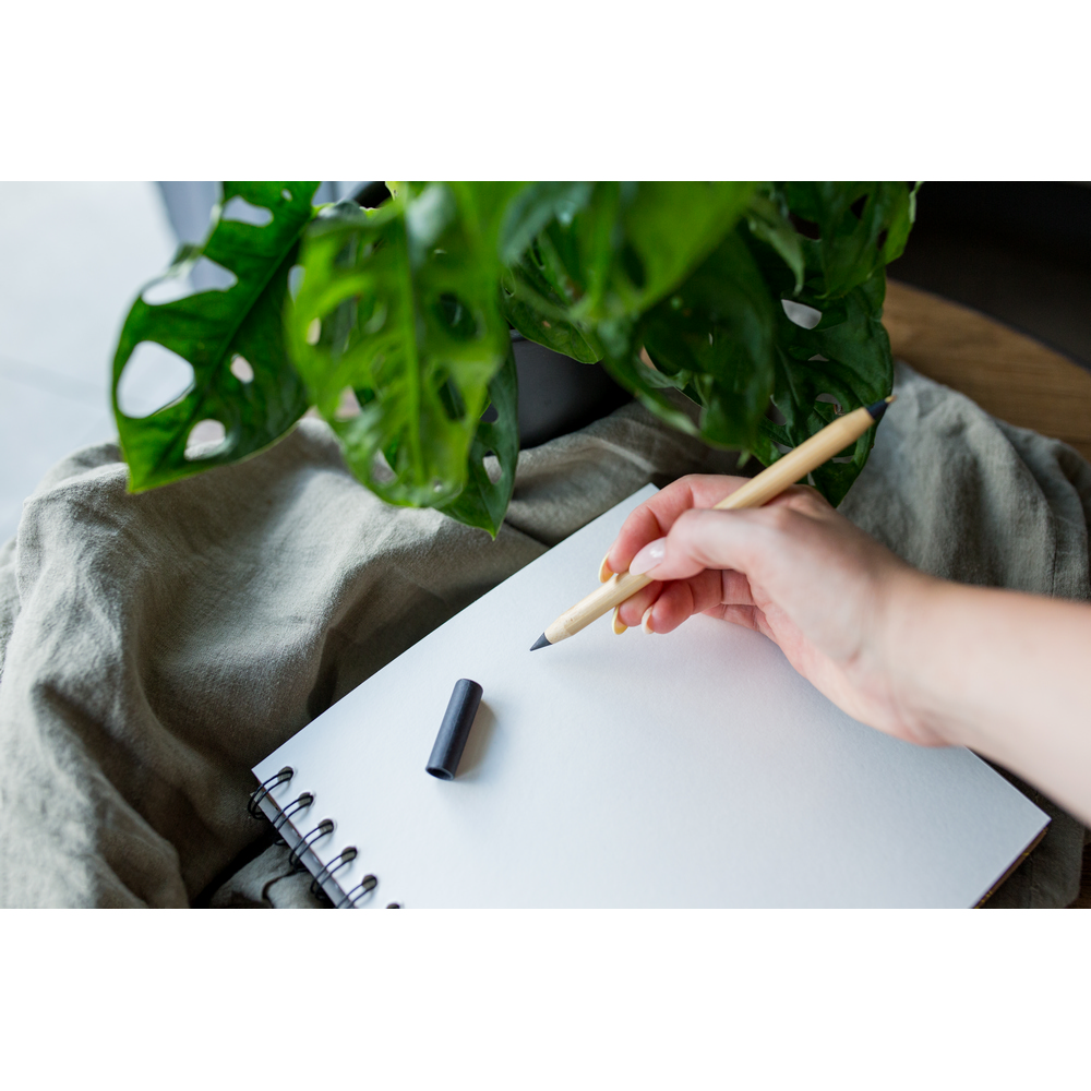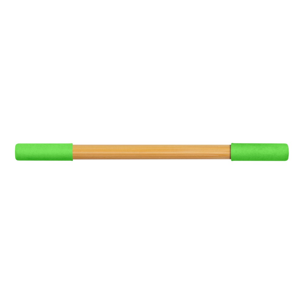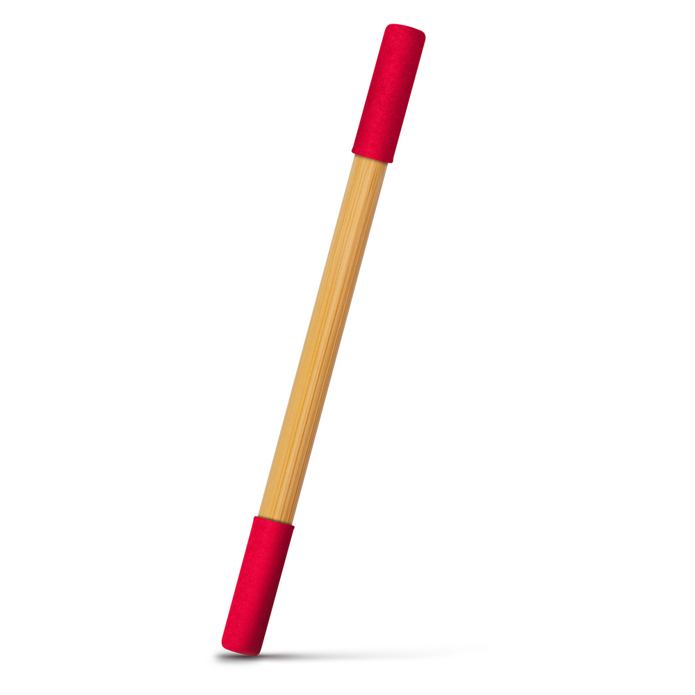 Długopis 2 w 1, „wieczny” ołówek, dzięki wykorzystaniu specjalnej wolnościerającej się końcówki długość pisania ołówka to około 1500 metrów, naostrzony, bambusowy trzon, dwie kolorowe zatyczki wykonane z papieru