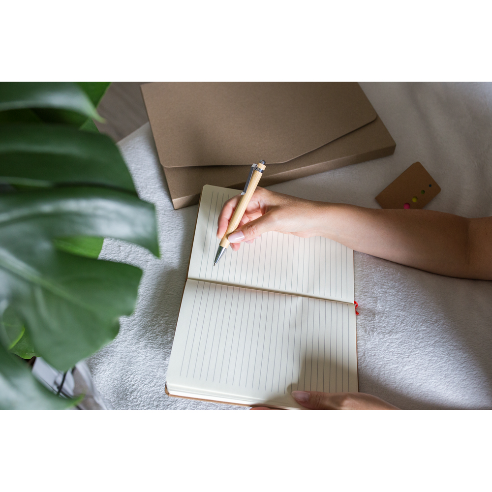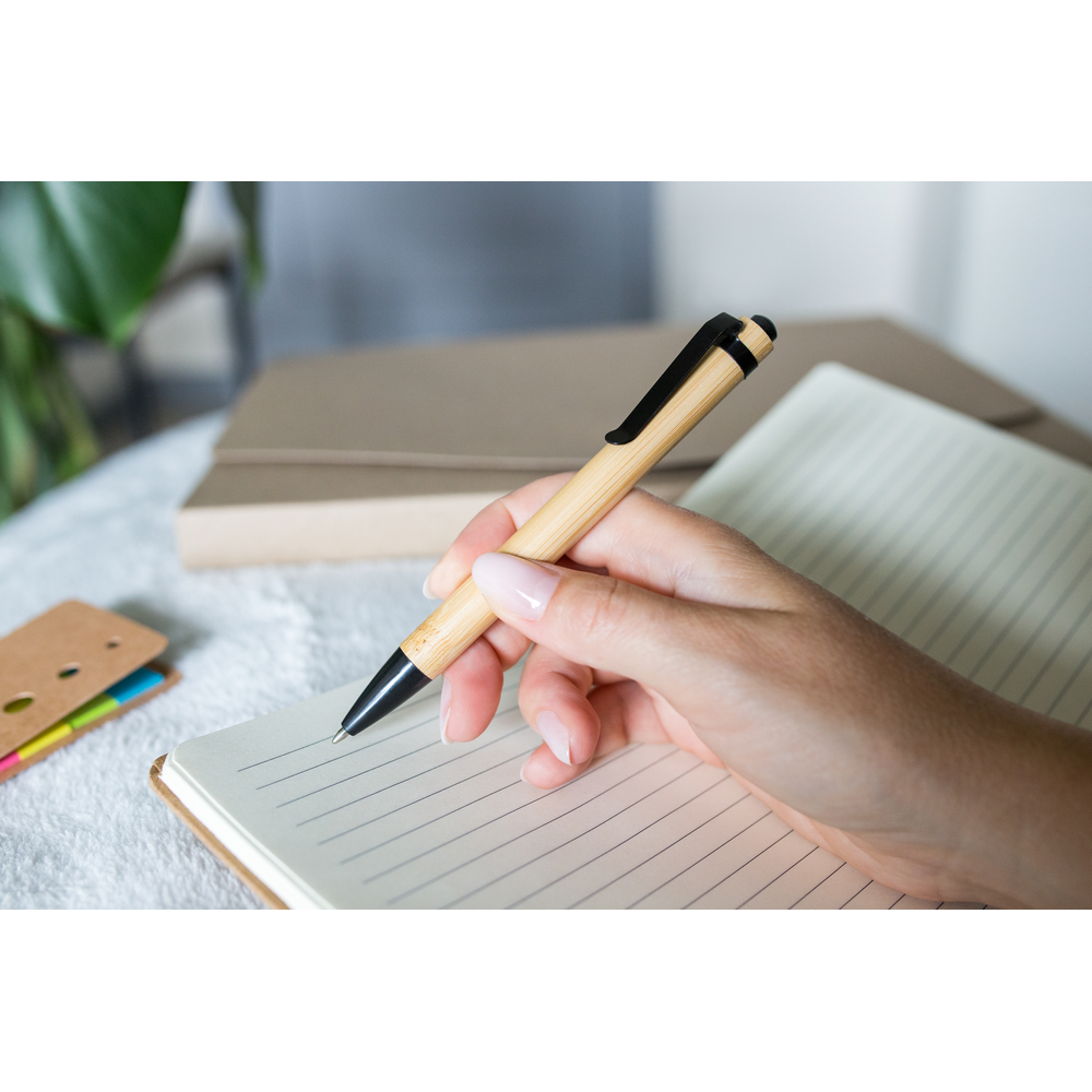Długopis z trzonem wykonanym z bambusa, metalowe elementy, wkład w niebieskim kolorze, produkt wykonany z bambusa, metalu i plastiku