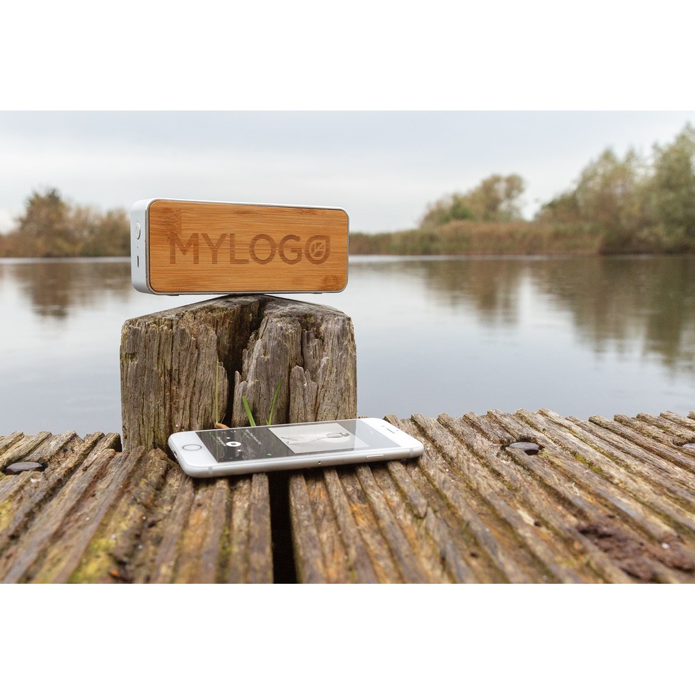 Głośnik bezprzewodowy 3W, BT 5.0, wykonany z bambusa, aluminium i tkaniny, wbudowany subwoofer poprawiający wydajność basów, akumulator o pojemności 400 mAh umożliwia odtwarzanie muzyki do 4 godzin, ponowne naładowanie w 1,5 godziny, zasięg do 10 m, kabel micro USB wykonany z TPE bez dodatku PVC w komplecie, ślad węglowy produktu: 2,32 kg CO2