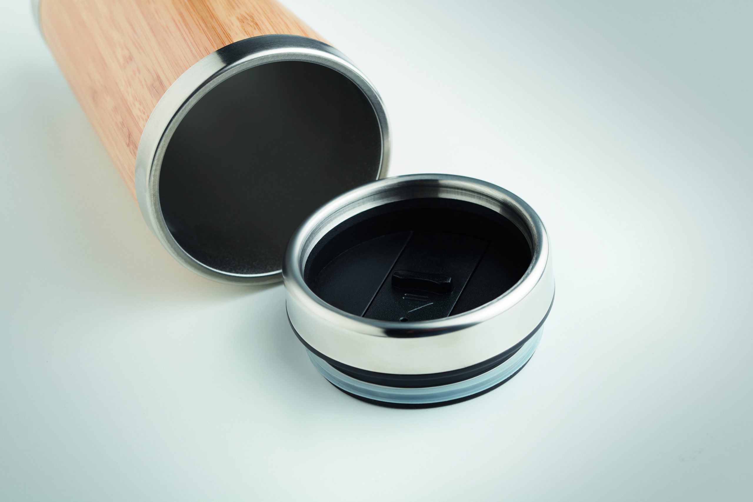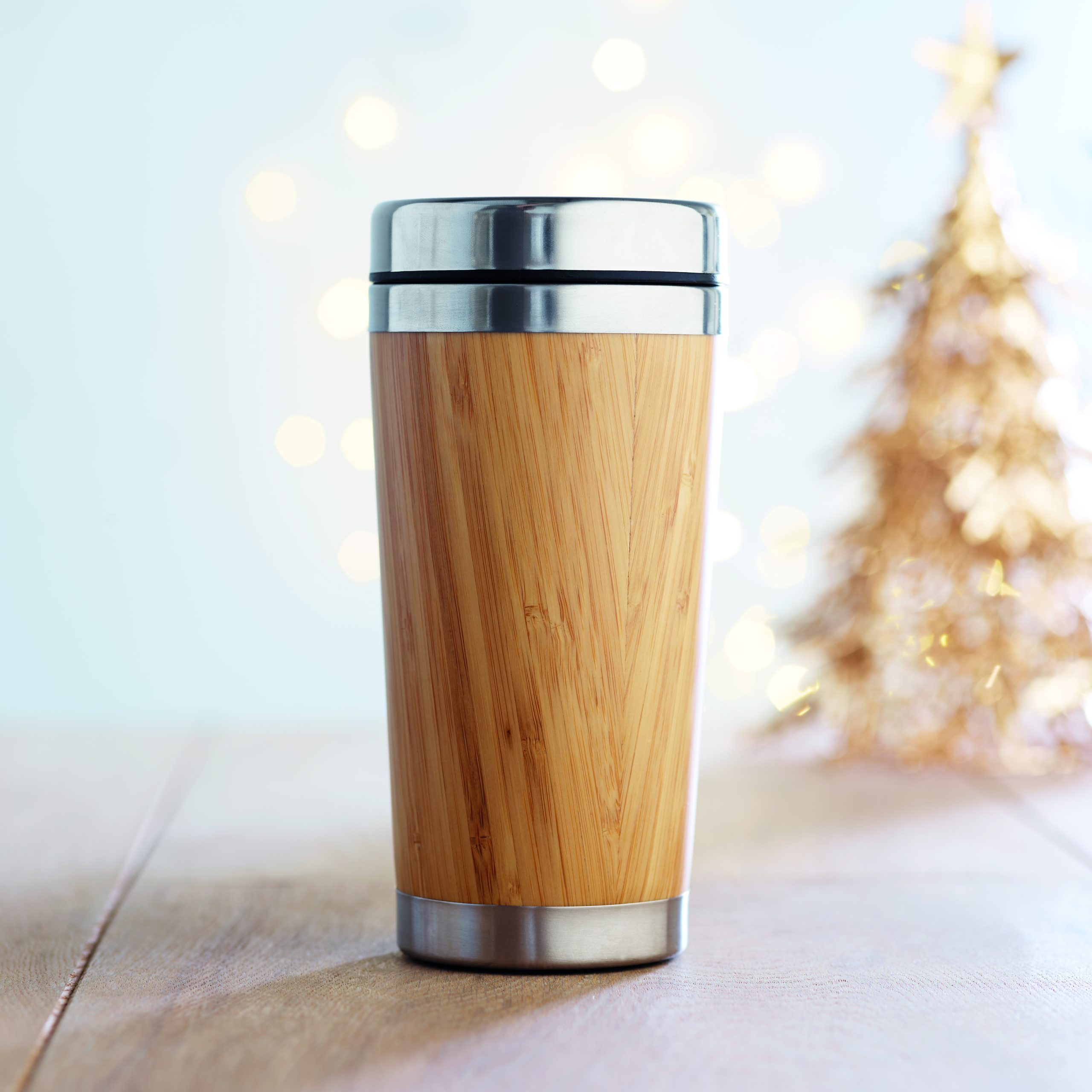 Kubek ze stali nierdzewnej, podwójne ścianki, z pokrywką z PP i obudową z bambusa. Pojemność 400 ml. Bambus jest produktem naturalnym, dlatego mogą wystąpić nieznaczne różnice w kolorze, wzorze i rozmiarze.