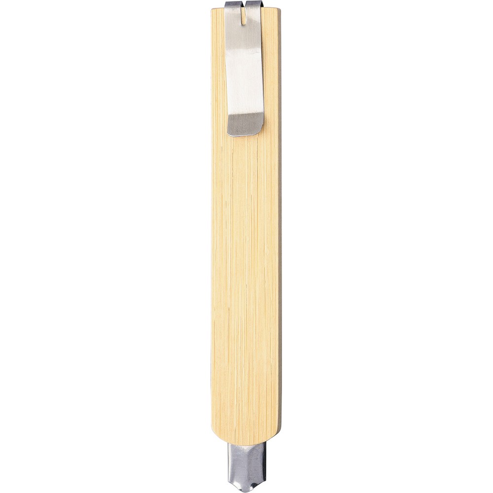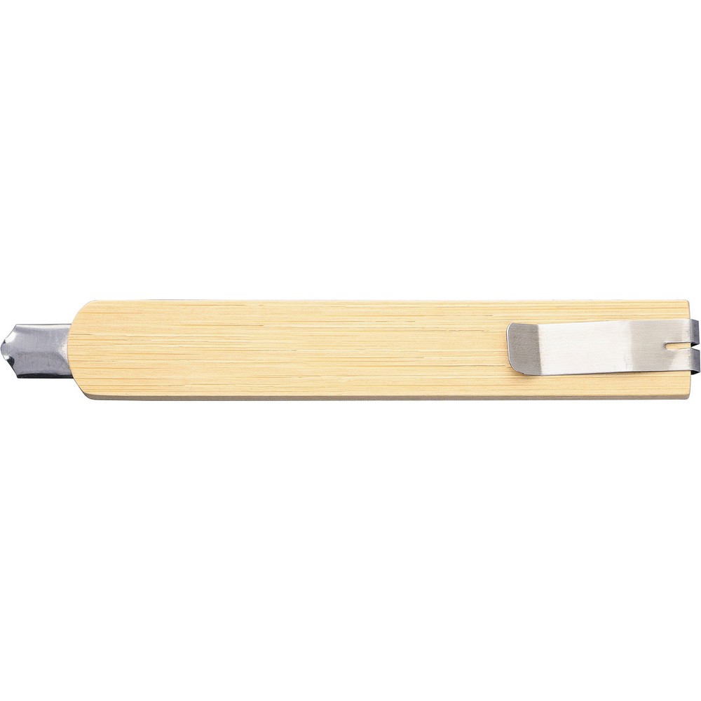 Bambusowy nóż do tapet, klips za pomocą którego chowa się ostrze, produkt wykonany ze stali nierdzewnej (ostrze) i bambusa (trzon)