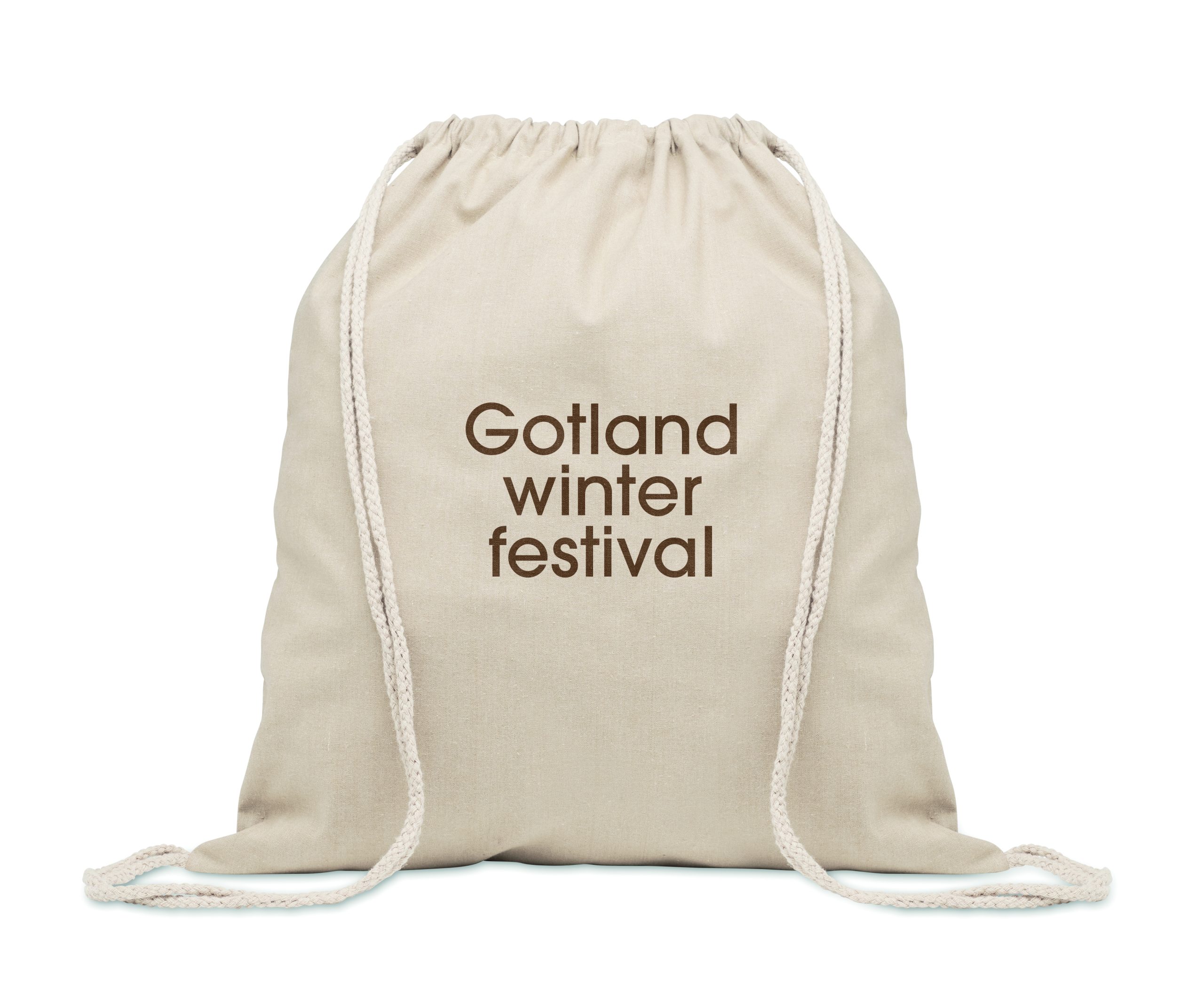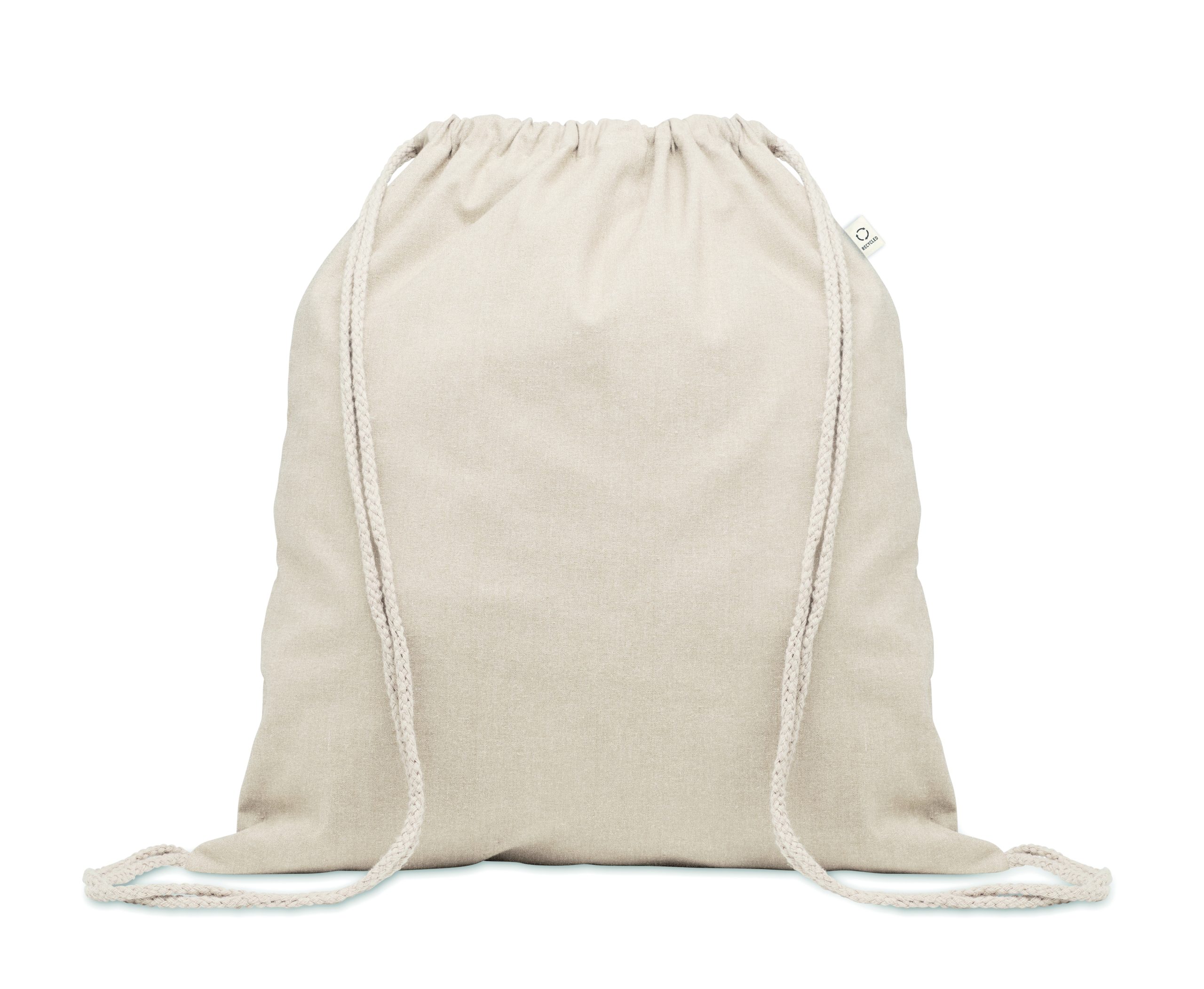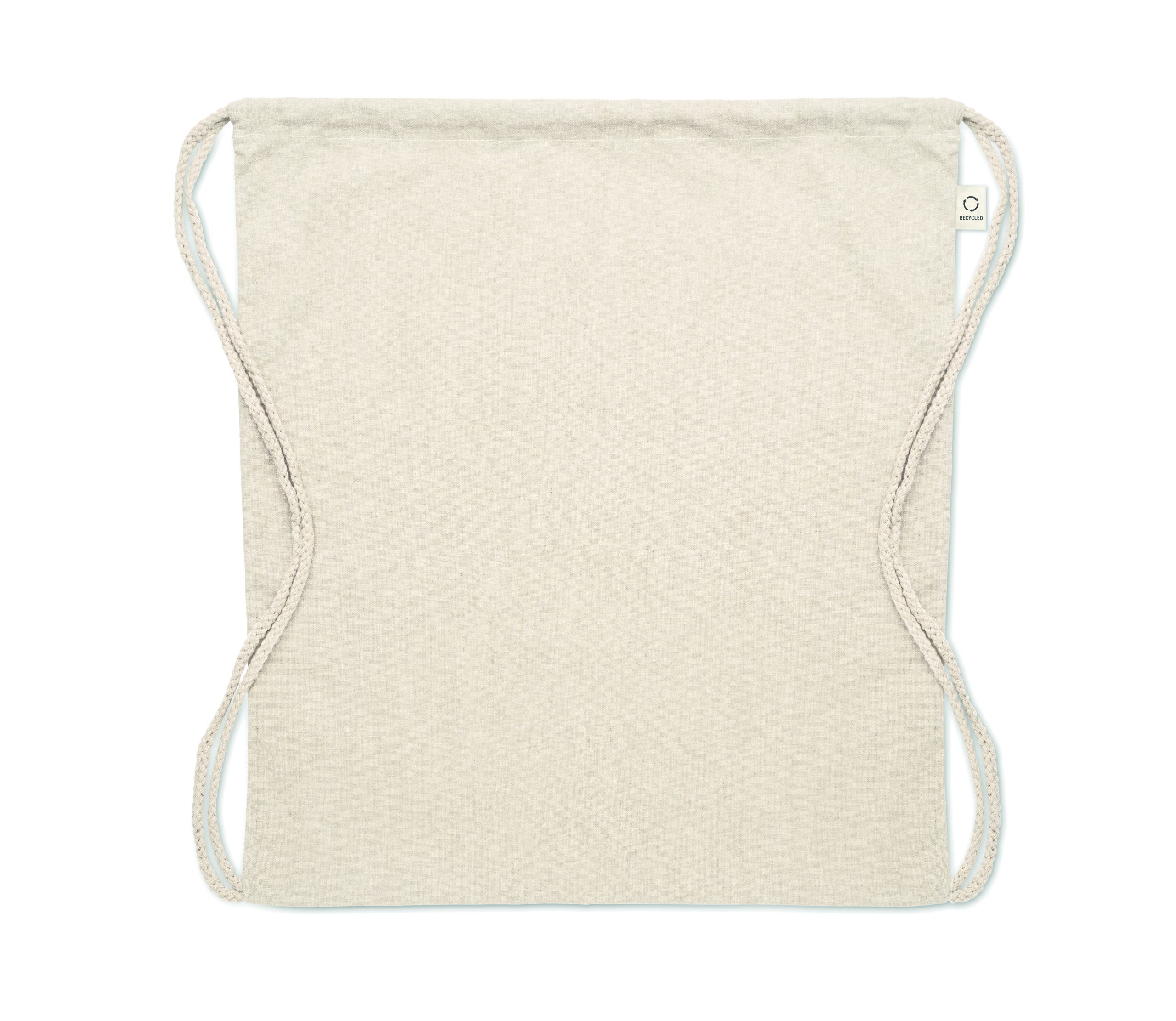 Worek ze sznurkiem wykonany z przetworzonej bawełny (70%) i RPET (30%). 140 gr/m². Ten produkt może się kurczyć po zadrukowaniu.