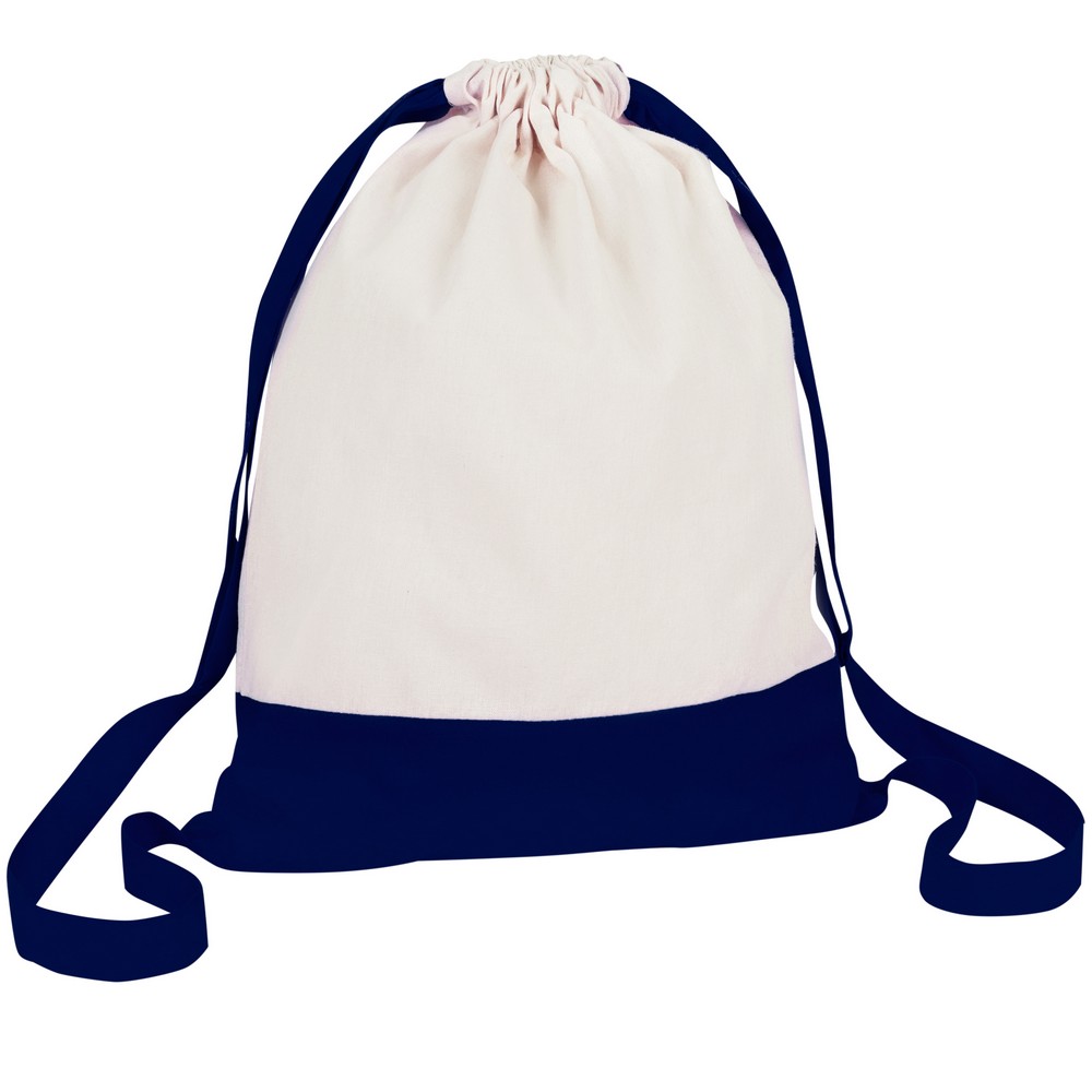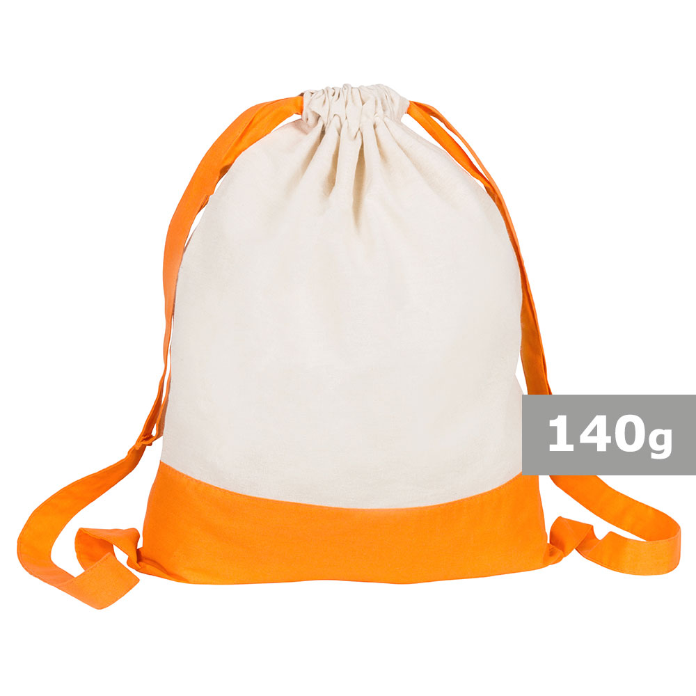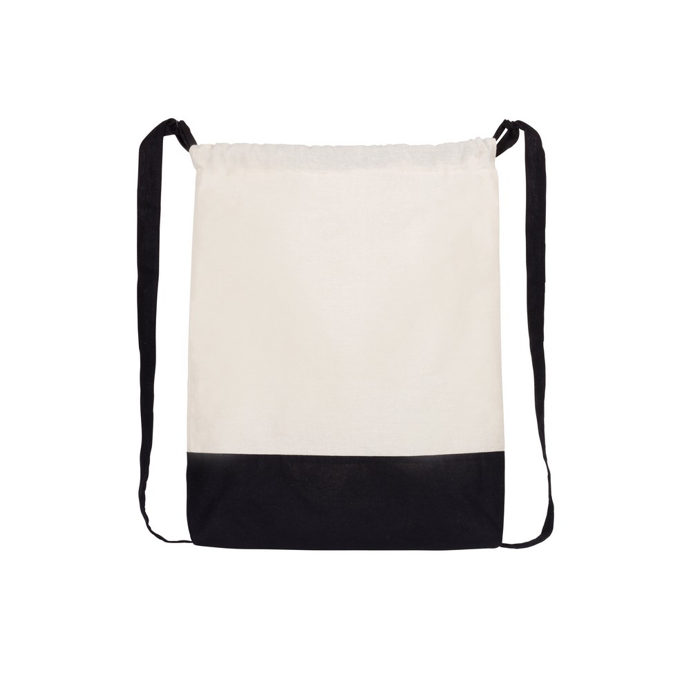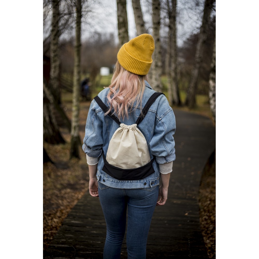 Dwukolorowy worek, posiada szerokie paski na ramię umożliwiające noszenie na plecach, pomieści drobne zakupy lub strój sportowy na siłownię, produkt wykonany z bawełny o gramaturze 140 g/m2