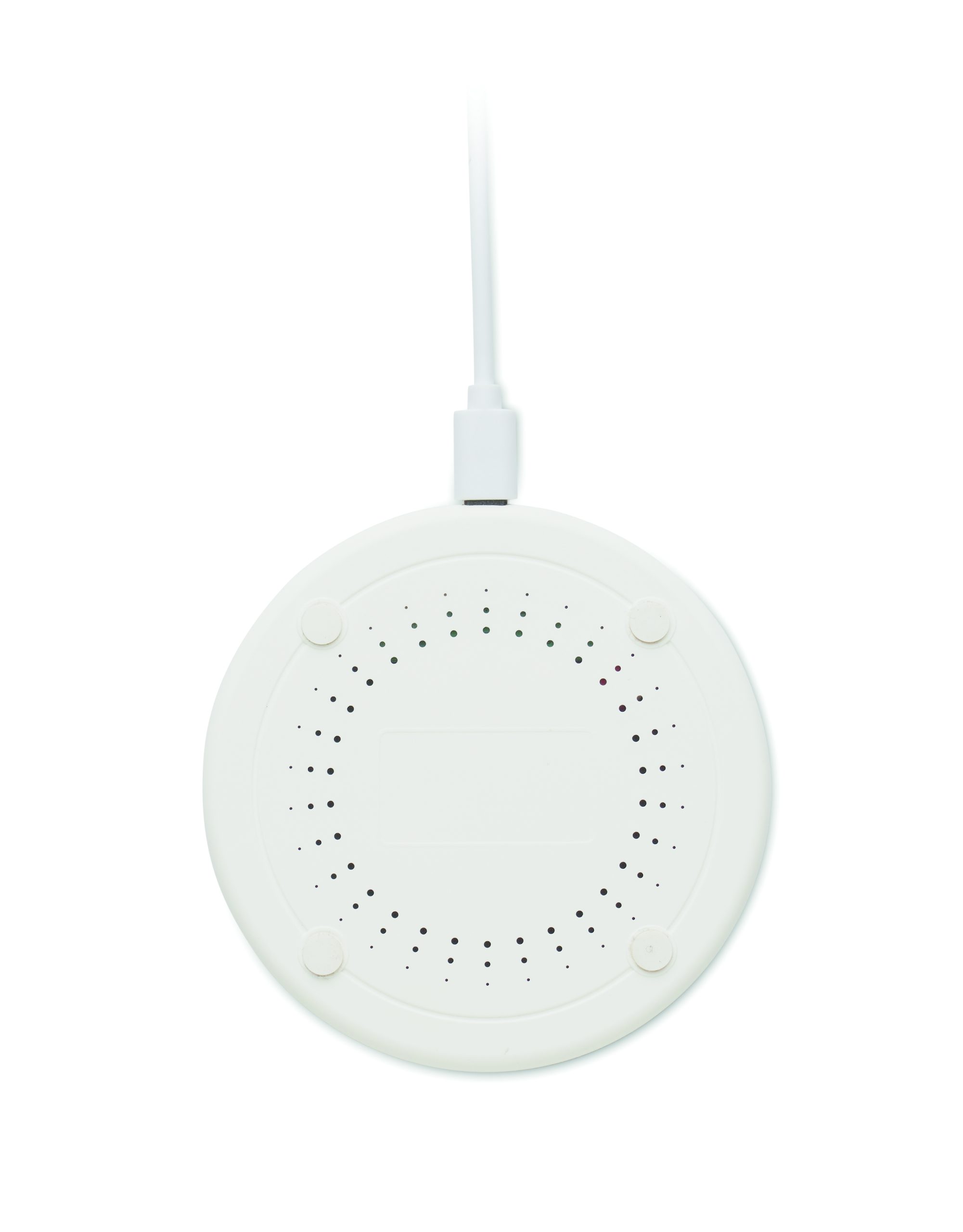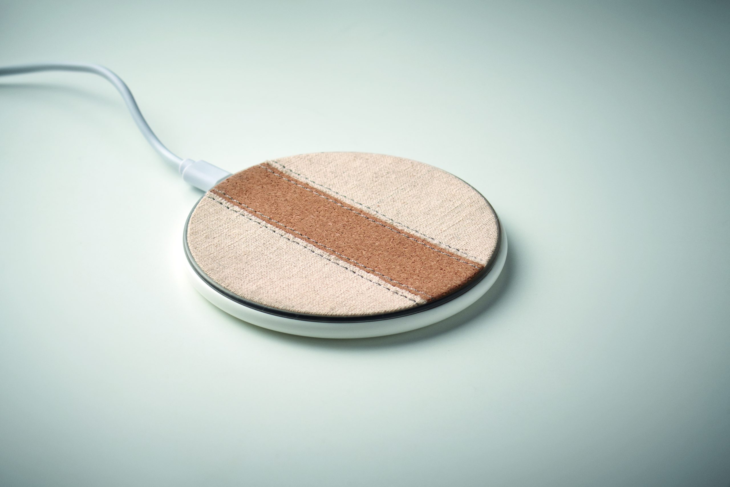 Bezprzewodowa ładowarka z recyklingowanego ABS z detalami z bawełny i korka. Podłącz do komputera, umieść na niej smartfon i pozwól mu się naładować. Wyjście: DC 9V/1.67A (15W).