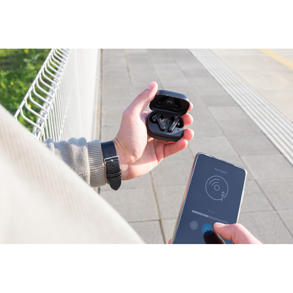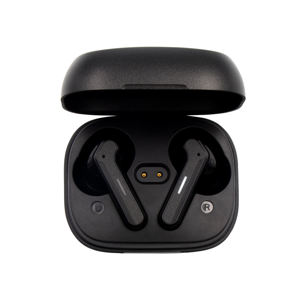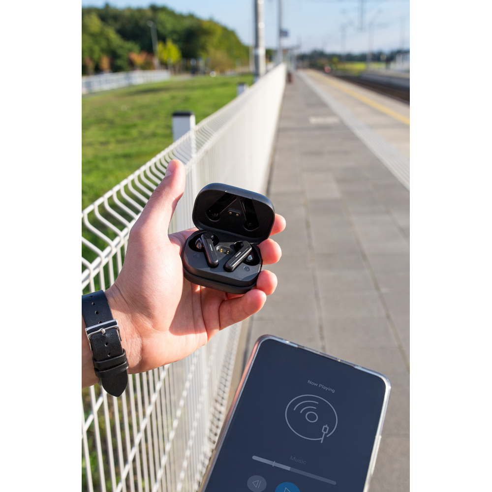 Słuchawki bezprzewodowe Exclusive Collection, BT 5.3, douszne, w etui ze stacją ładującą słuchawki 300 mAh, bateria słuchawek 2x 40 mAh, etui ładujące posiada 4 diody wskazujące poziom naładowania etui, grawer ukazuje podświetlaną powierzchnię, funkcja odbierania połączeń, czas pracy: ok. 7h (odtwarzanie muzyki), zasięg do 10 m, wejście USB-C, kabel USB-C do USB-C w komplecie, produkt wykonany z RABS