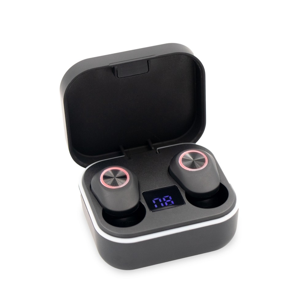 Słuchawki bezprzewodowe 2×40 mAh w etui ze stacją ładującą słuchawki 300 mAh, douszne, BT 5.1, etui ładujące z cyfrowym wskaźnikiem poziomu naładowania etui, funkcja odbierania połączeń, wbudowany mikrofon, ładowane przez USB, czas pracy: >2h, zasięg do 10 m, kabel USB-C w komplecie