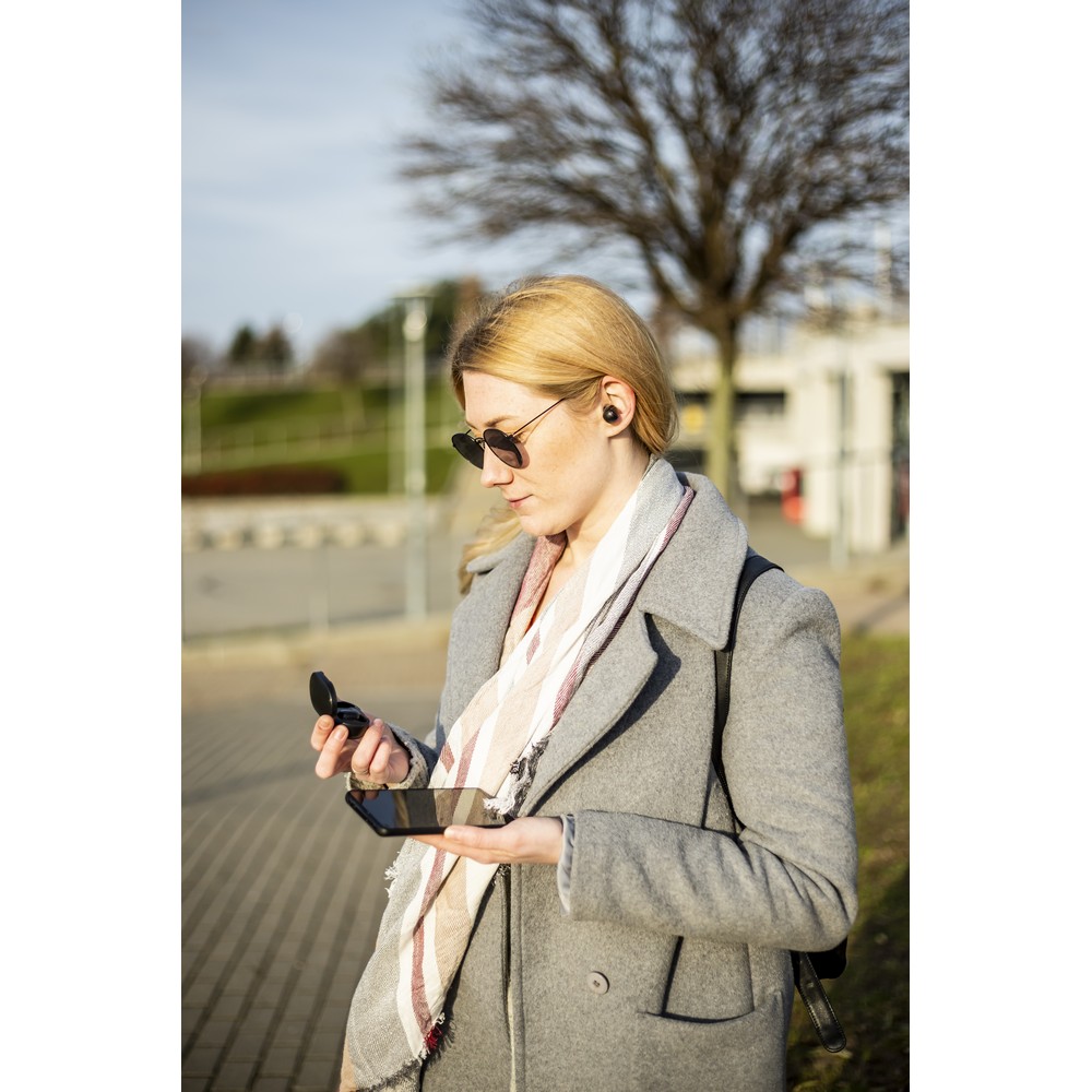 Słuchawki bezprzewodowe 2×40 mAh w etui ze stacją ładującą słuchawki 200 mAh, douszne, BT 5.0, funkcja odbierania połączeń i odtwarzania muzyki, ładowane przez USB, czas pracy: ok. 5h, zasięg do 10 m, wejście USB-C, kabel USB-C w komplecie