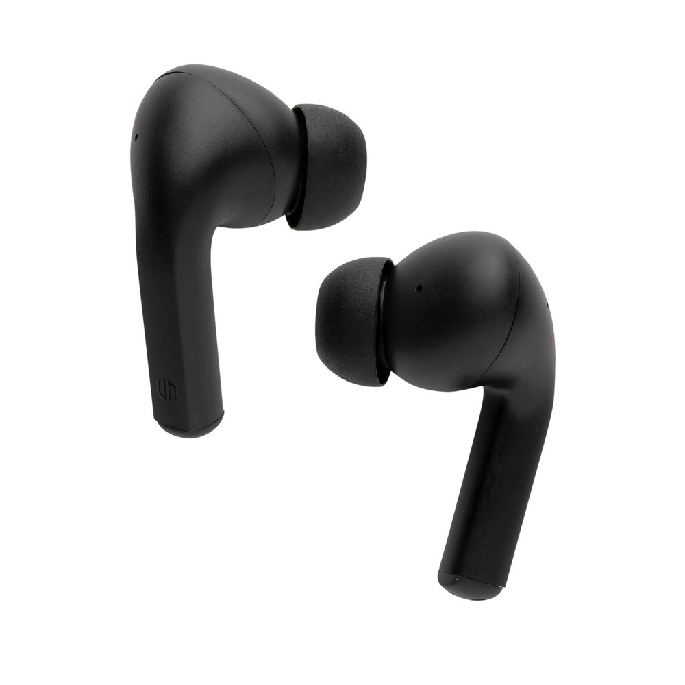 Bezprzewodowe słuchawki douszne z systemem aktywnej redukcji szumów (ANC), mocny i czysty dźwięk, poziom redukcji szumów do 25 dB, wodoodporne IPX4 (całkowita ochrona przed spryskiwaniem i zachlapaniem wodą z różnych kierunków z natężeniem do 10 litrów na minutę), dotykowy panel sterowania, wbudowany mikrofon, funkcja odbierania połączeń, do 5 godzin odtwarzania na jednym ładowaniu, etui ładujące zapewnia 20 godzin odtwarzania, nie zawiera PVC, opakowanie nie zawiera plastiku, ślad węglowy produktu: 0,98 kg CO2