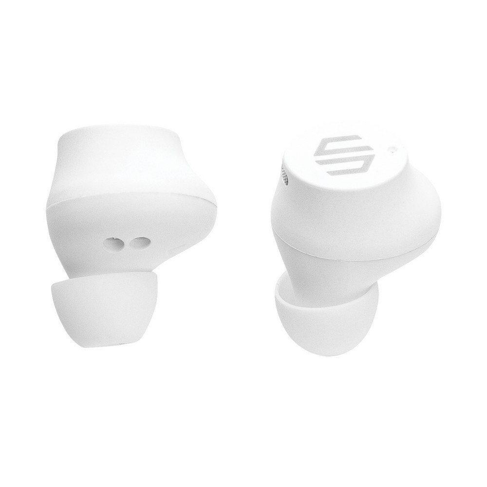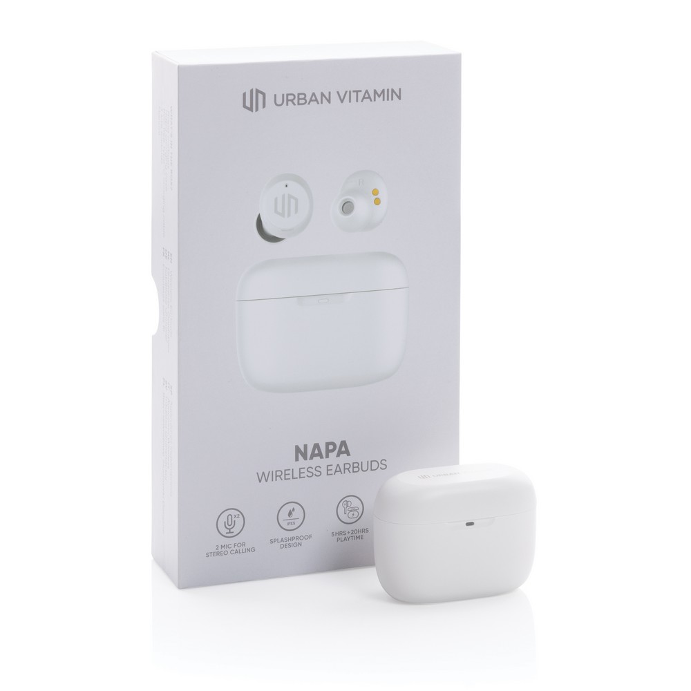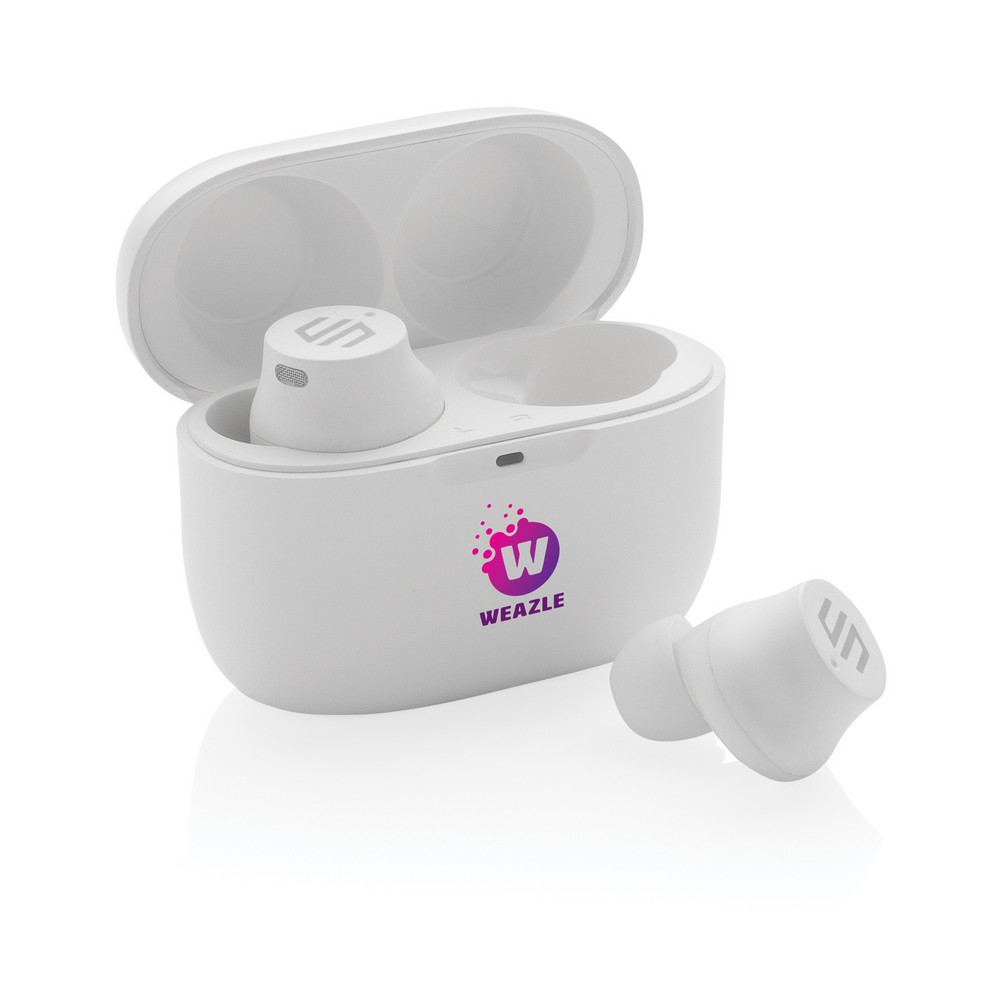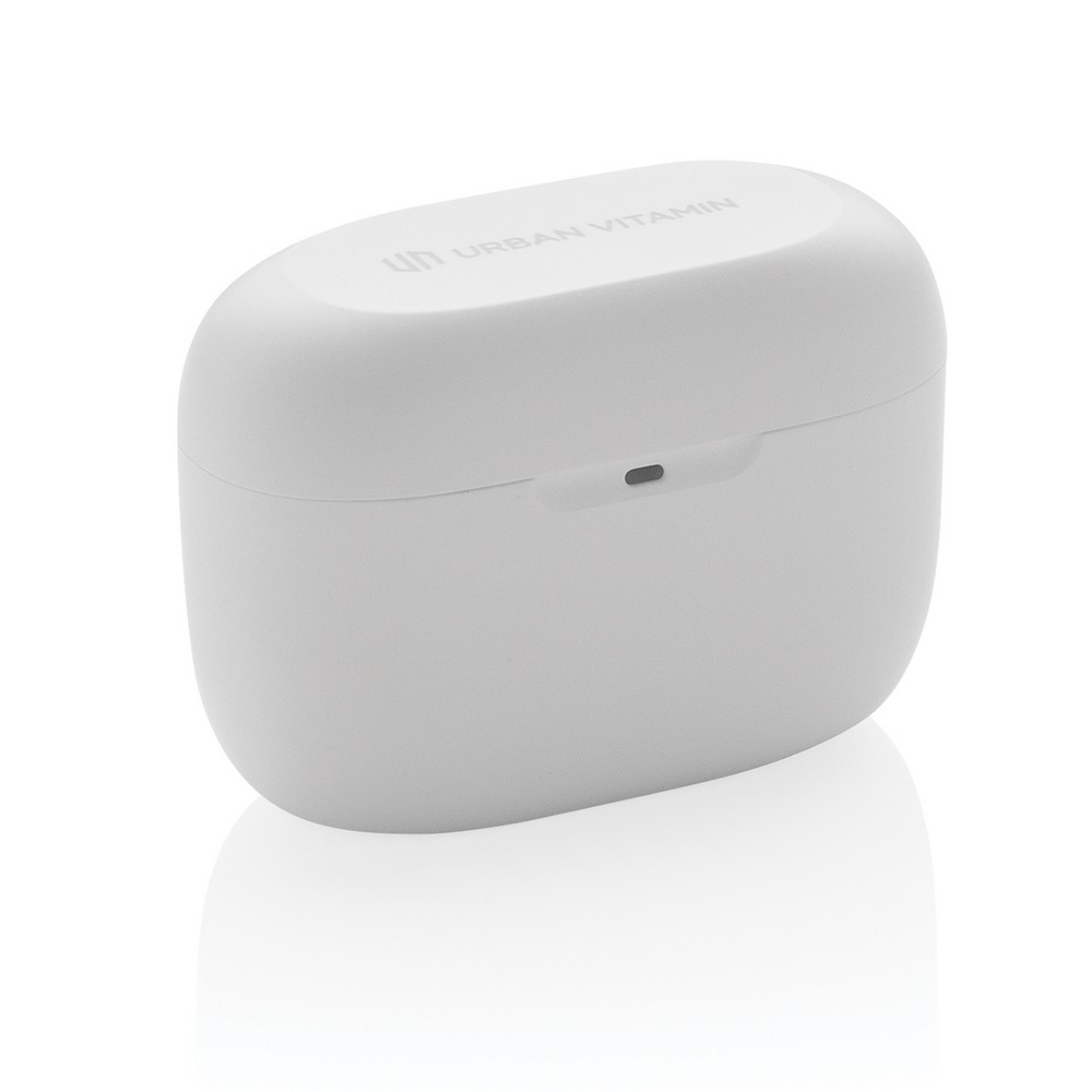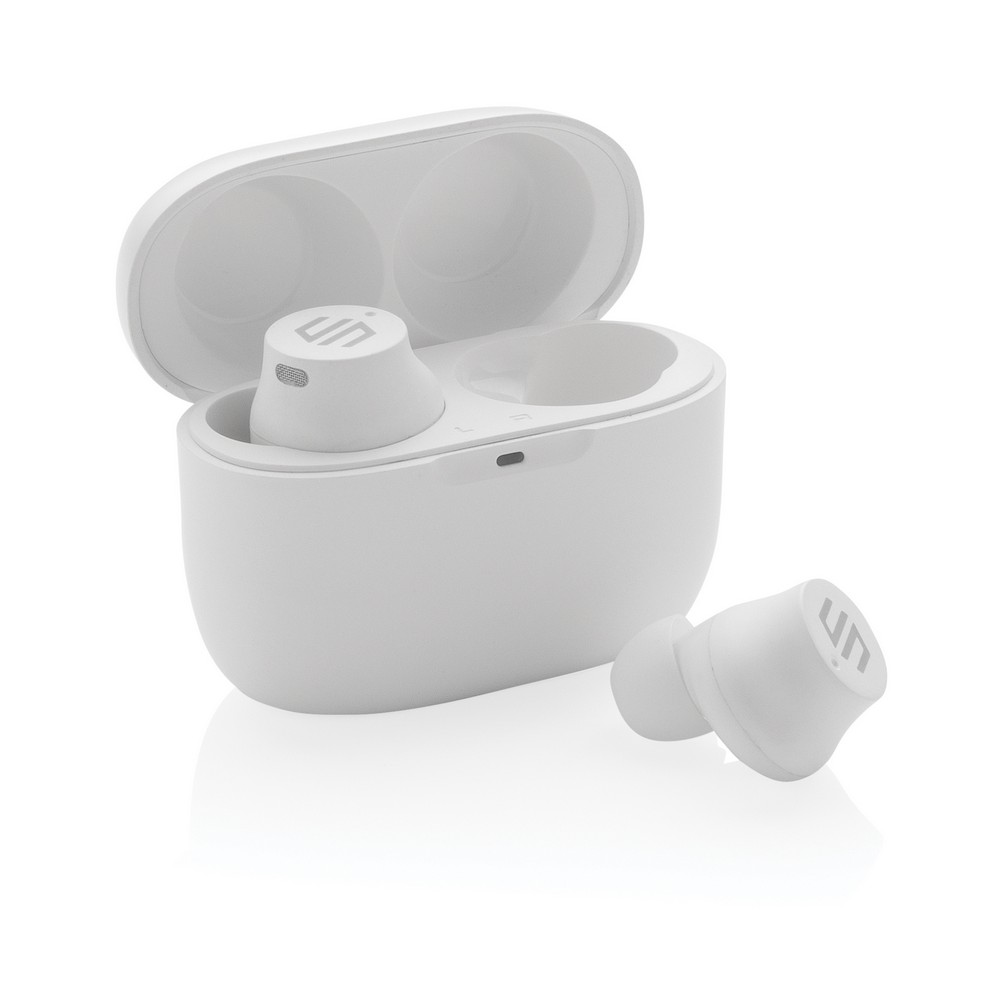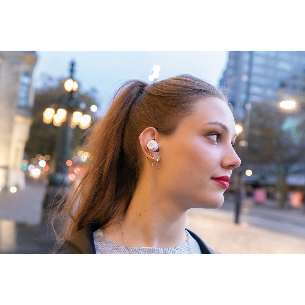 Bezprzewodowe słuchawki douszne, mocny i głęboki dźwięk, poziom redukcji szumów do 25 dB, wodoodporne IPX5 (całkowita ochrona przed strumieniem wody płynącej z różnych kierunków z wydajnością do 12,5 litra na minutę), dotykowy panel sterowania, wbudowany mikrofon, funkcja odbierania połączeń, do 5 godzin odtwarzania na jednym ładowaniu, etui ładujące zapewnia 18 godzin odtwarzania, nie zawiera PVC, opakowanie nie zawiera plastiku, ślad węglowy produktu: 1,02 kg CO2