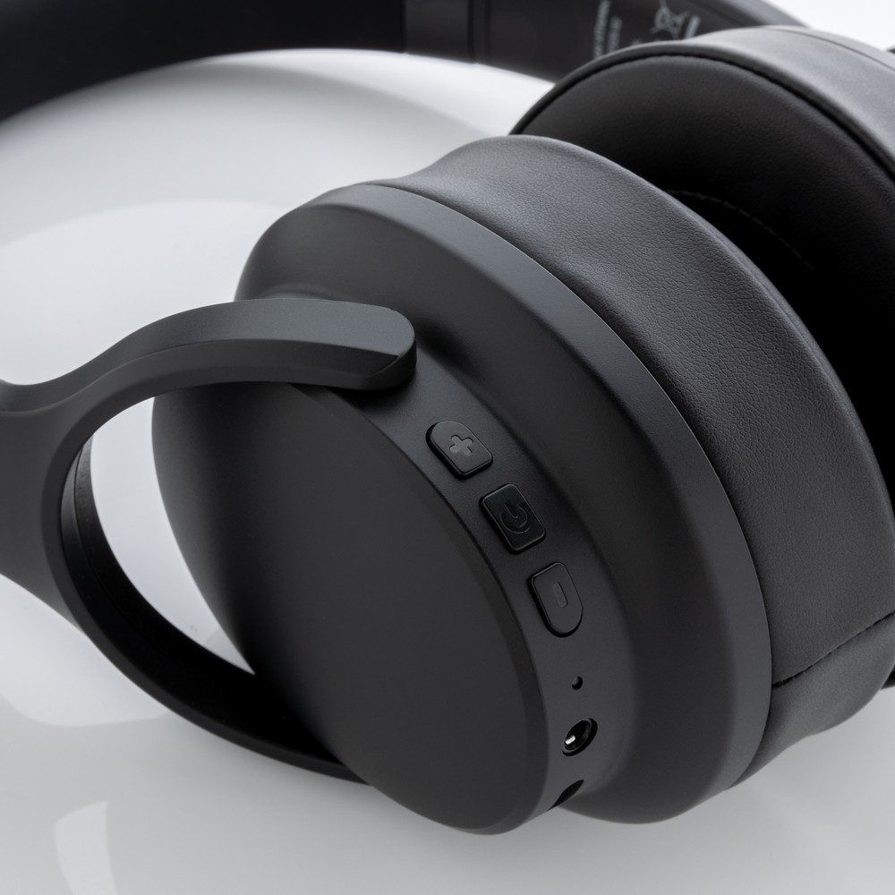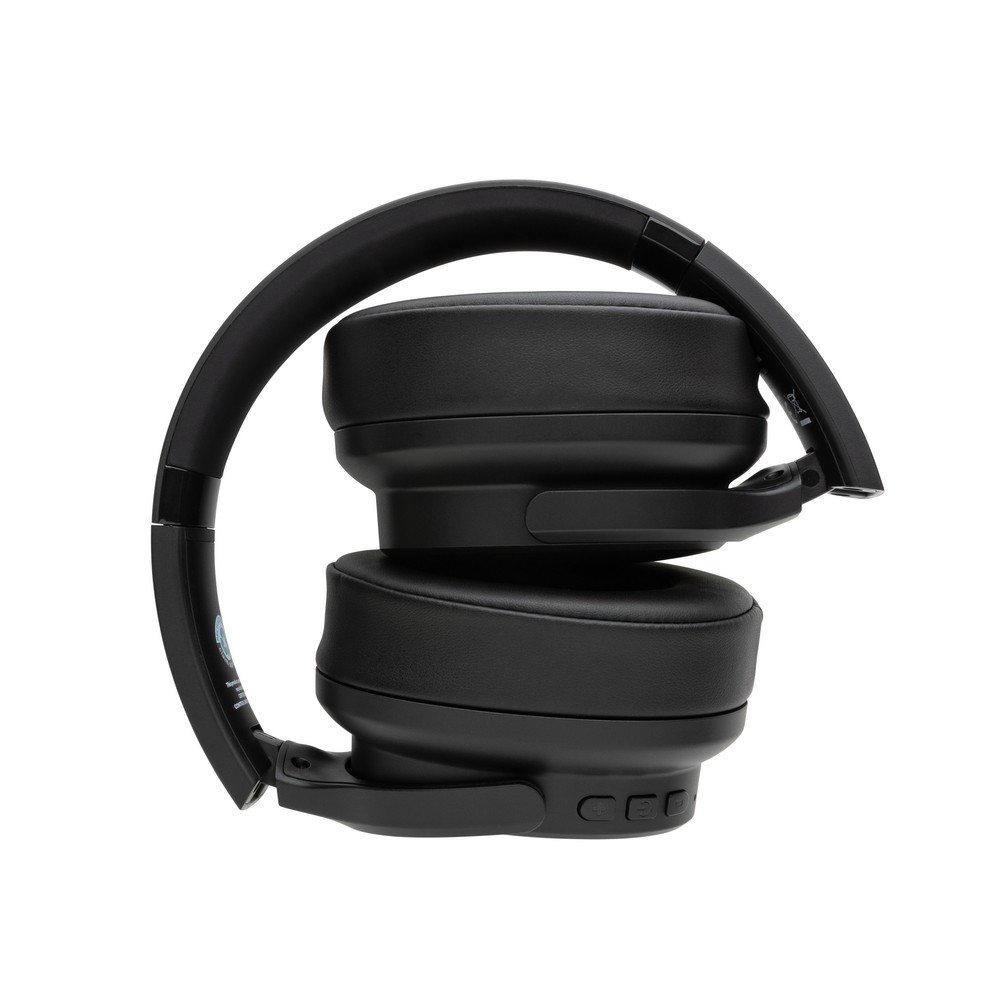 Bezprzewodowe słuchawki nauszne, składane, wykonane z ABS z recyklingu z certyfikatem RCS, całkowita zawartość materiałów z recyklingu obliczona na podstawie wagi całkowitej przedmiotu: 63%, wbudowany mikrofon, funkcja odbierania połączeń, do 48 godzin odtwarzania na jednym ładowaniu, nie zawiera PVC, opakowanie o zmniejszonej zawartości plastiku, nie zawiera PVC, ślad węglowy produktu: 1,95 kg CO2