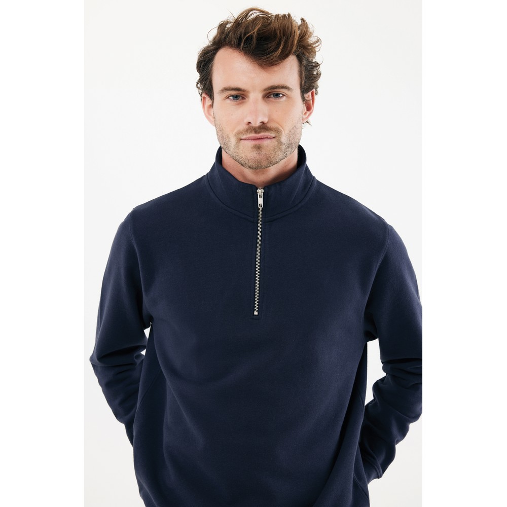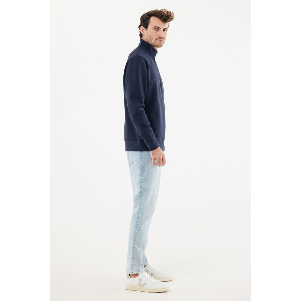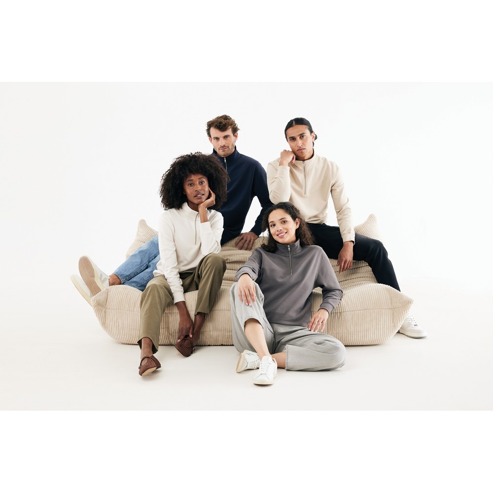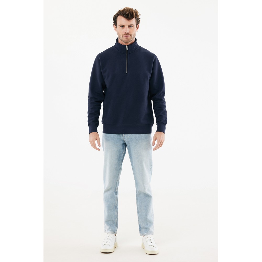 Bluza, unisex, długie rękawy, nowoczesny krój, kołnierz zapinany na zamek błyskawiczy, wykonana w 30% z bawełny z recyklingu i w 70% z bawełny organicznej o gramaturze 300 g/m2, posiada wbudowany znacznik AWARE™, który potwierdza wykorzystanie materiałów z recyklingu, posiada kod QR na metce, który prowadzi do cyfrowego paszportu produktu, 2% wpływów z każdego sprzedanego produktu jest przekazywane na rzecz Water.org