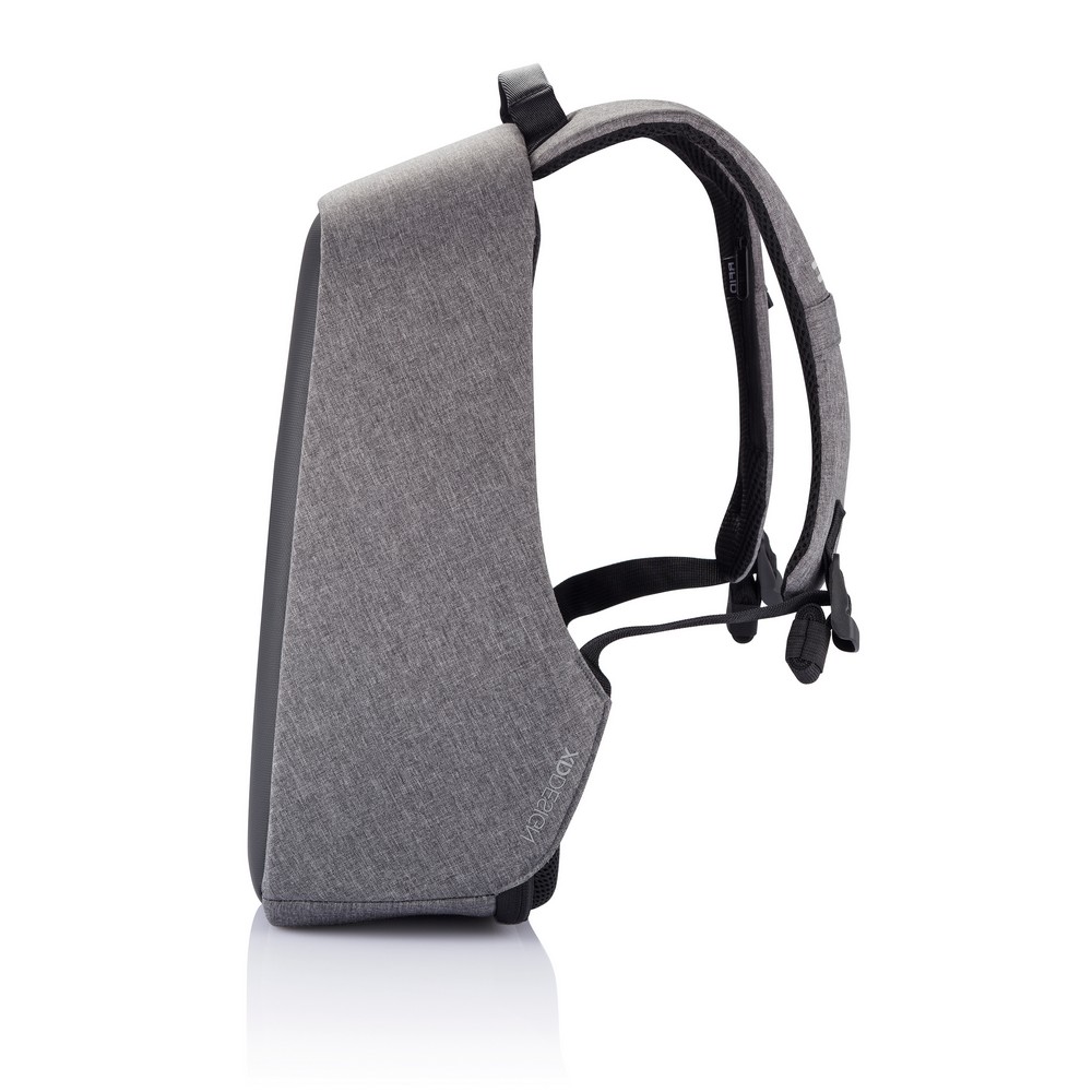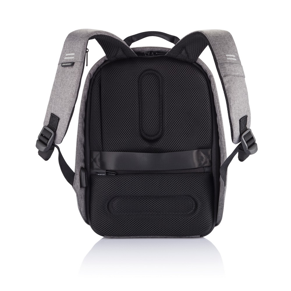 Plecak chroniący przed kieszonkowcami Bobby Hero Small, wodoodporny i odporny na przecięcia materiał, wykonany z przyjaznego środowisku materiału RPET, ukryte zamki i kieszenie, wewnątrz miękkie przegrody na laptopa do 13,3″ i tablet do 12,9″, zintegrowany port USB do ładowania telefonów (power-bank nie jest dołączony), odblaskowe paski zwiększające widoczność, pasek do zamocowania na walizce, wzór zastrzeżony®, ślad węglowy produktu: 6,28 kg CO2