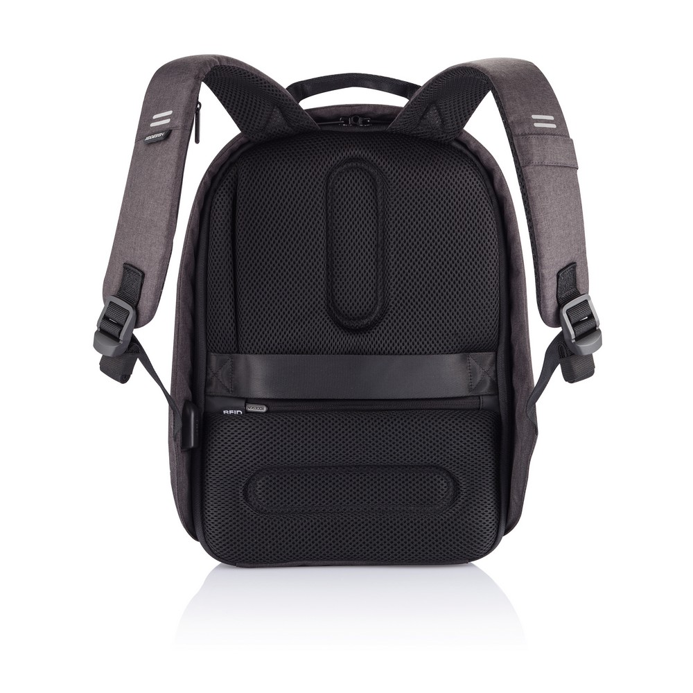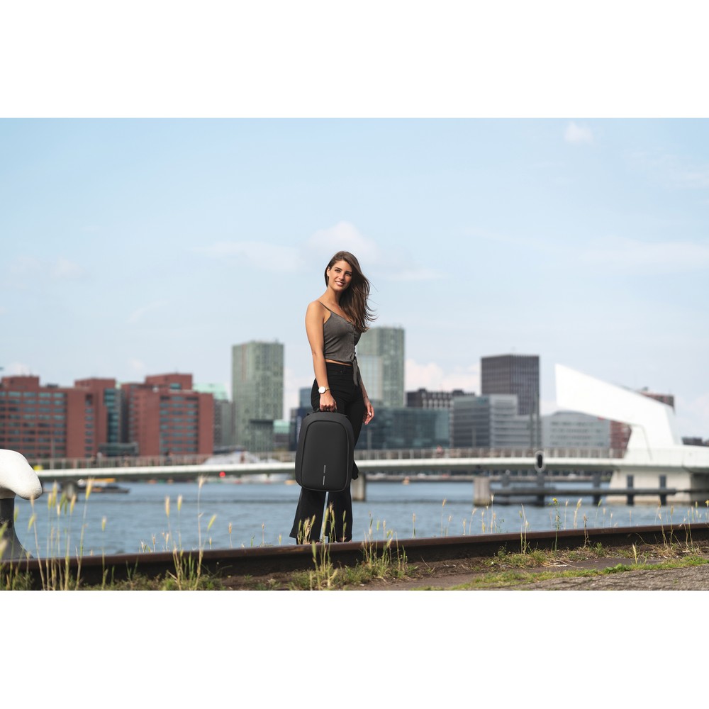 Plecak chroniący przed kieszonkowcami Bobby Hero Small, wodoodporny i odporny na przecięcia materiał, wykonany z przyjaznego środowisku materiału RPET, ukryte zamki i kieszenie, wewnątrz miękkie przegrody na laptopa do 13,3″ i tablet do 12,9″, zintegrowany port USB do ładowania telefonów (power-bank nie jest dołączony), odblaskowe paski zwiększające widoczność, pasek do zamocowania na walizce, wzór zastrzeżony®, ślad węglowy produktu: 6,28 kg CO2
