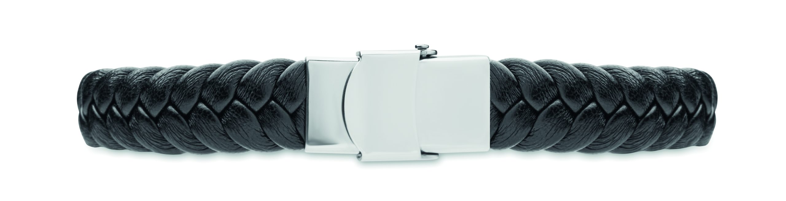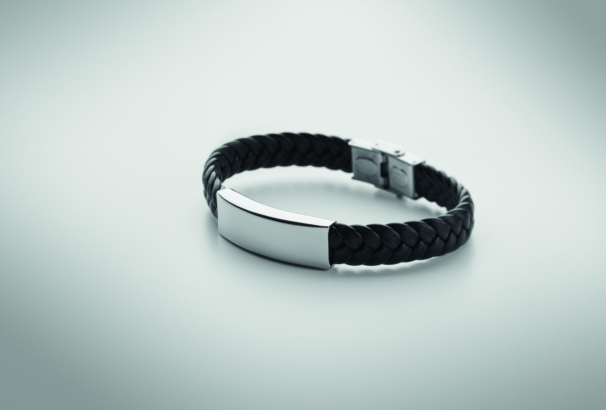 Pleciona bransoletka ze sztucznej skóry z okuciami z polerowanej stali. Zapięcie na zatrzask. Obwód nadgarstka: 21 cm.