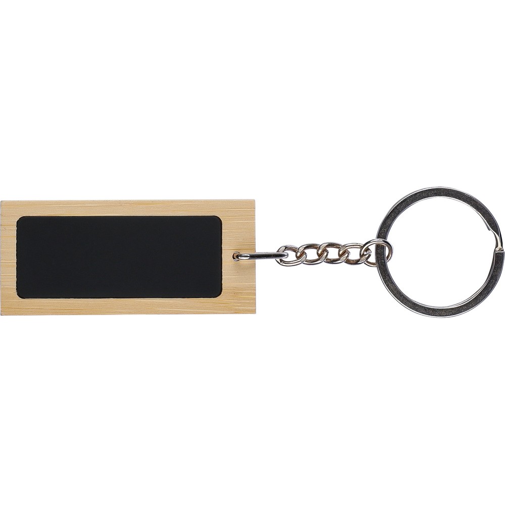 Brelok do kluczy z czarną gumowaną płytką do grawerowania, po wygrawerowaniu logo będzie widoczne w błyszczącym chromie, zapakowany w brązową kopertę kartonową, produkt wykonany ze stali nierdzewnej i bambusa