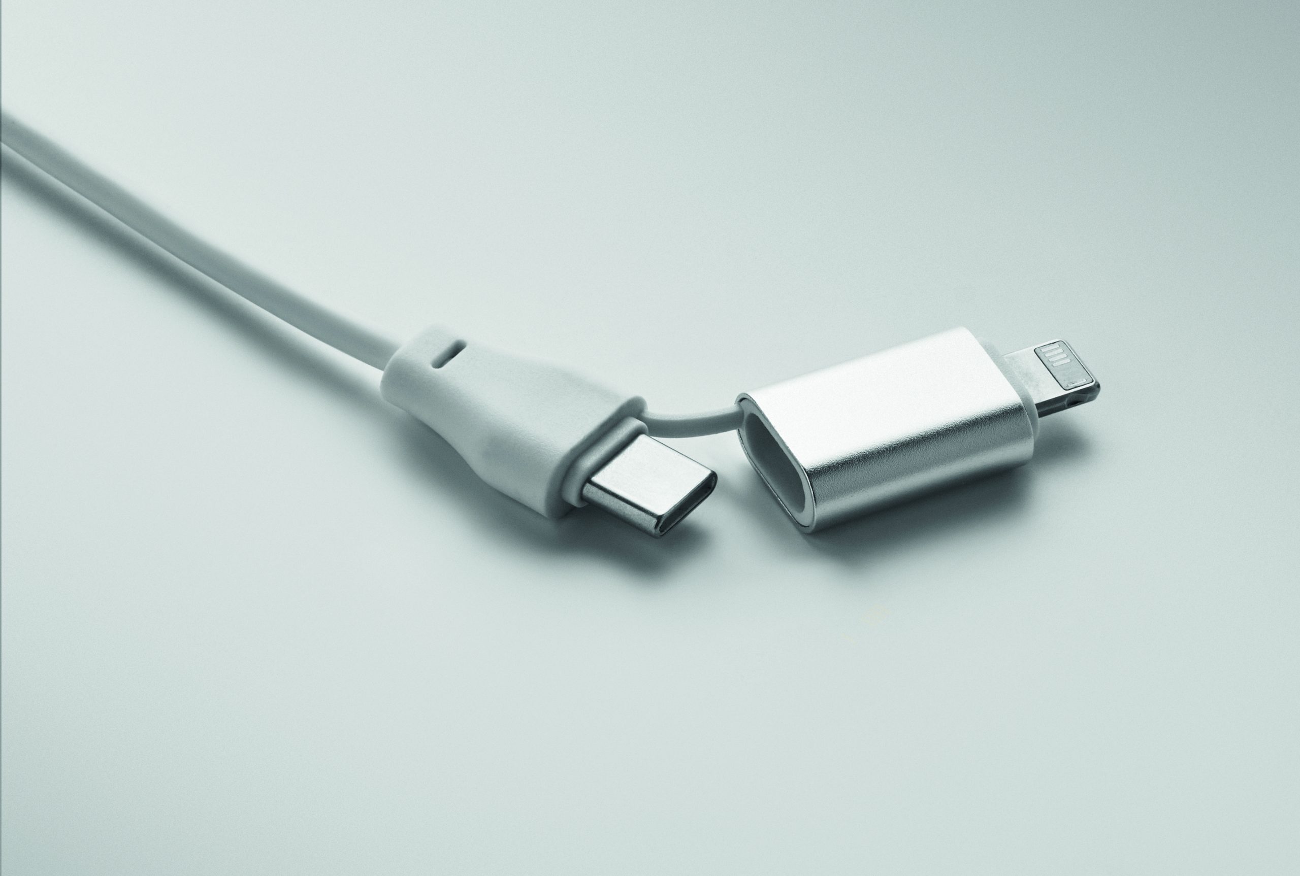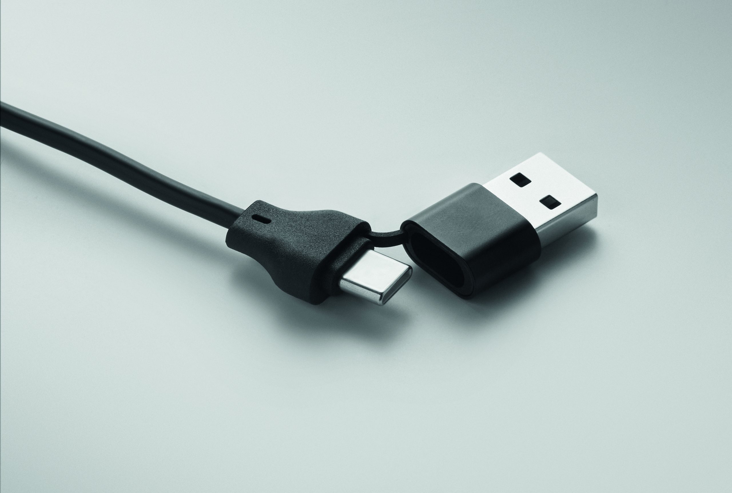 Kabel do ładowania 4 w 1 z bambusowymi detalami. Wejście: 2-w-1 Typ-C i Typ-A. Wyjście: Ładowanie zegarka (Samsung® i Apple®), typ-C i micro-B (2 w 1 pin).