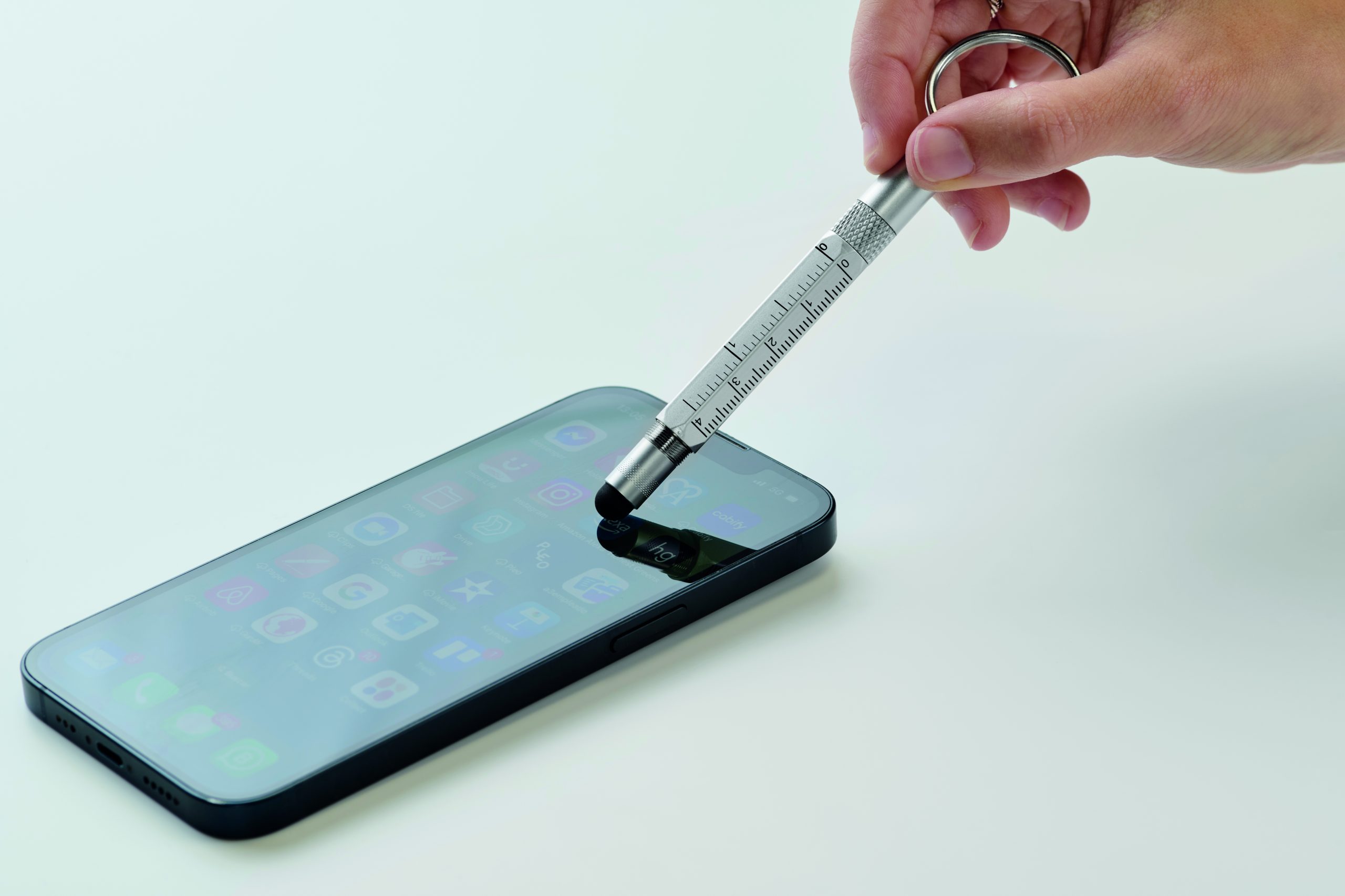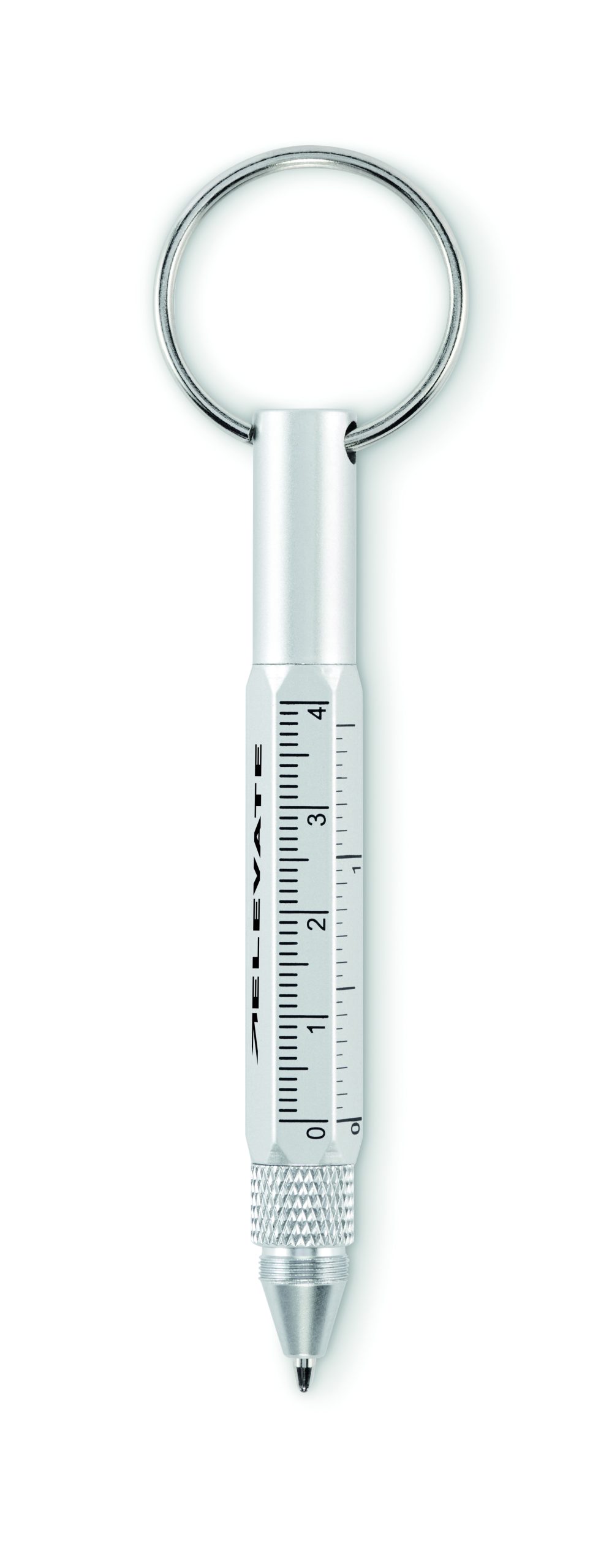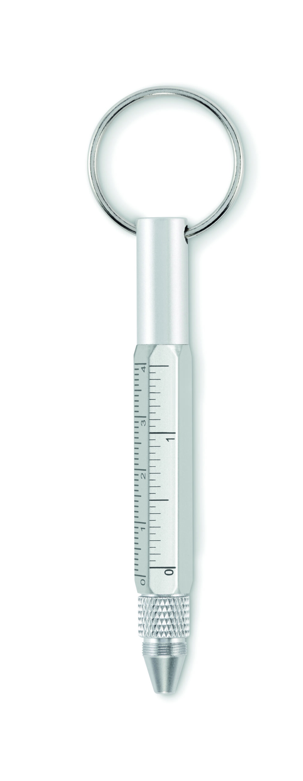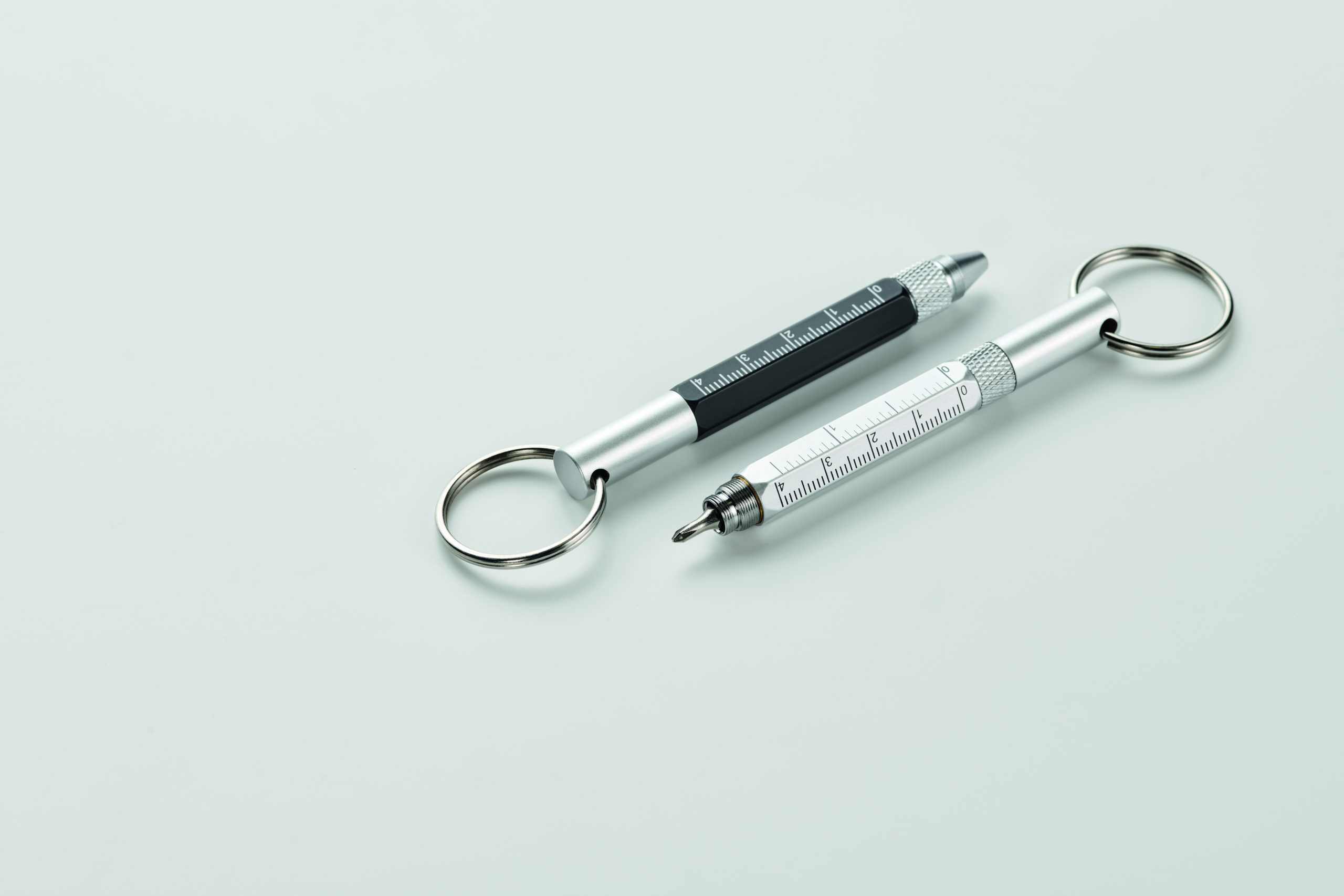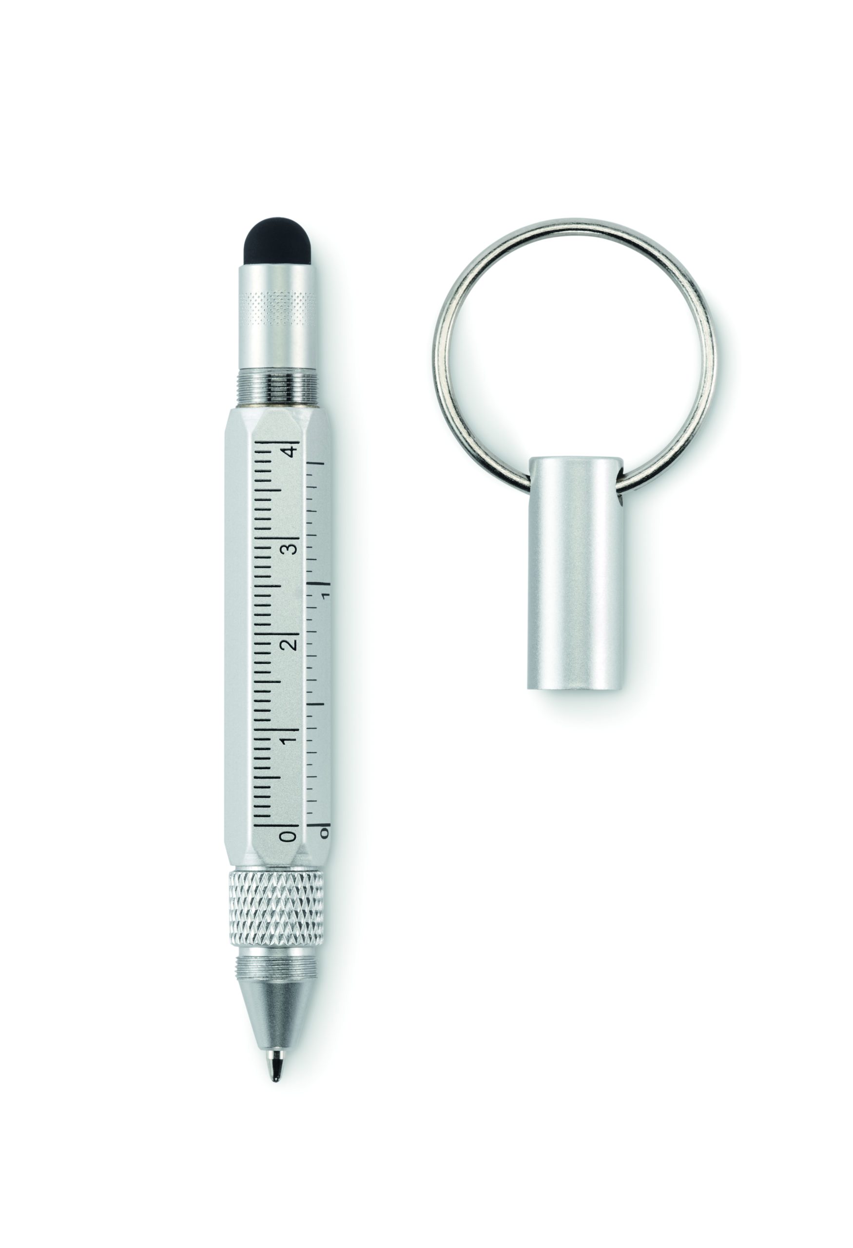 Brelok do kluczy z przekręcanym długopisem z aluminium pochodzącego z recyklingu z linijką 4 cm i 1,5 cala, rysikiem i śrubokrętem 2 w 1 z łbem krzyżakowym i płaskim. Czarny tusz.