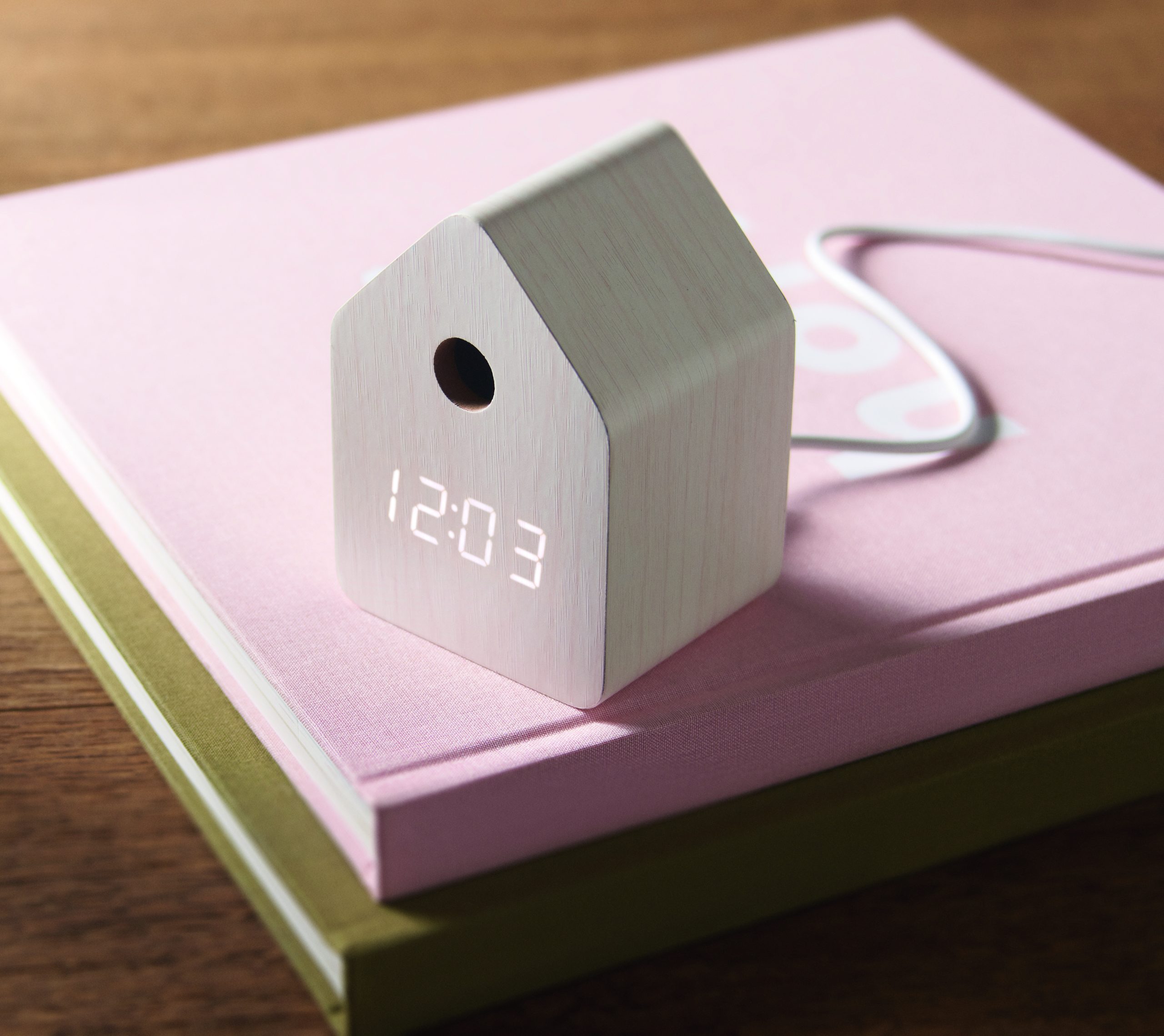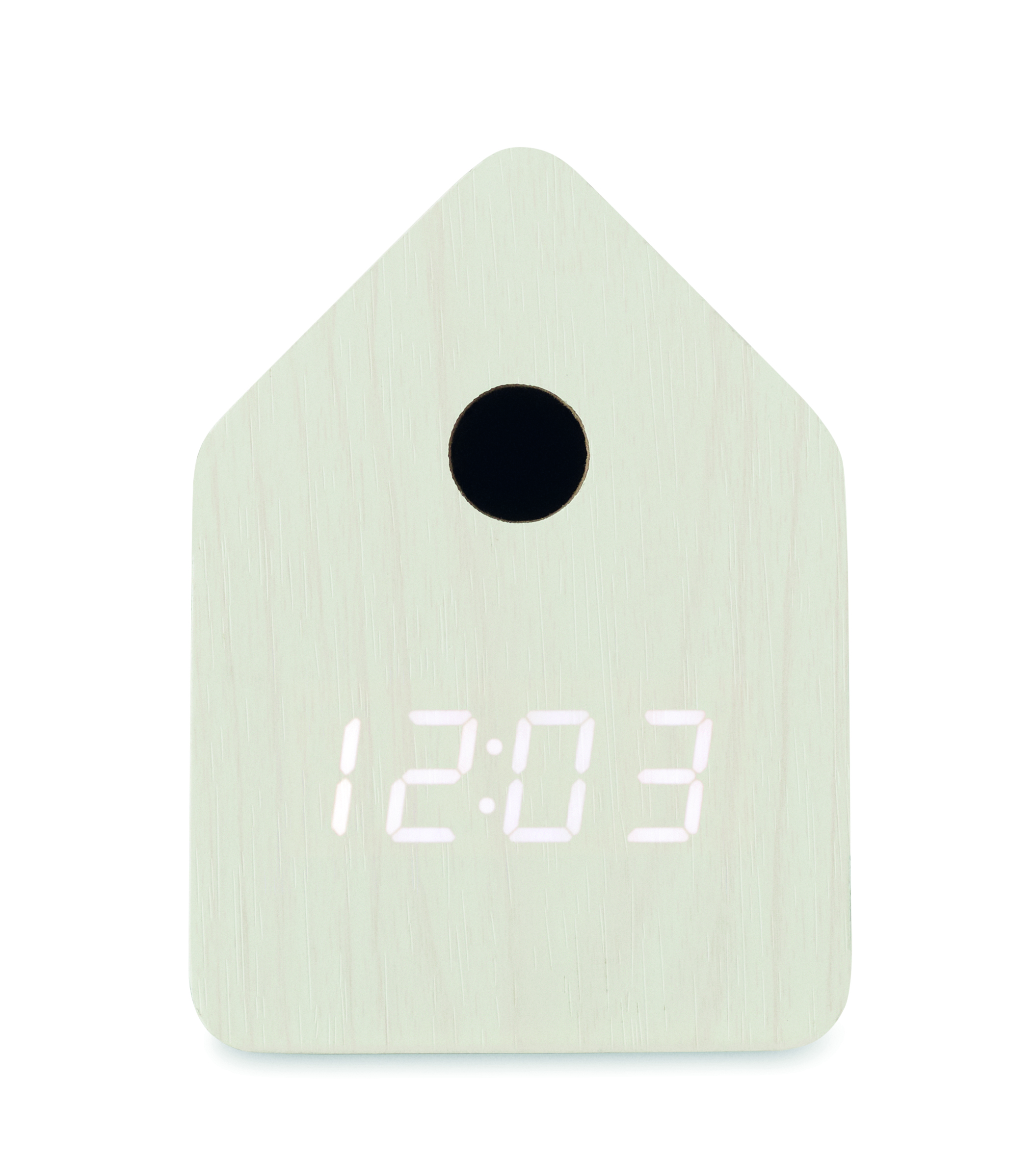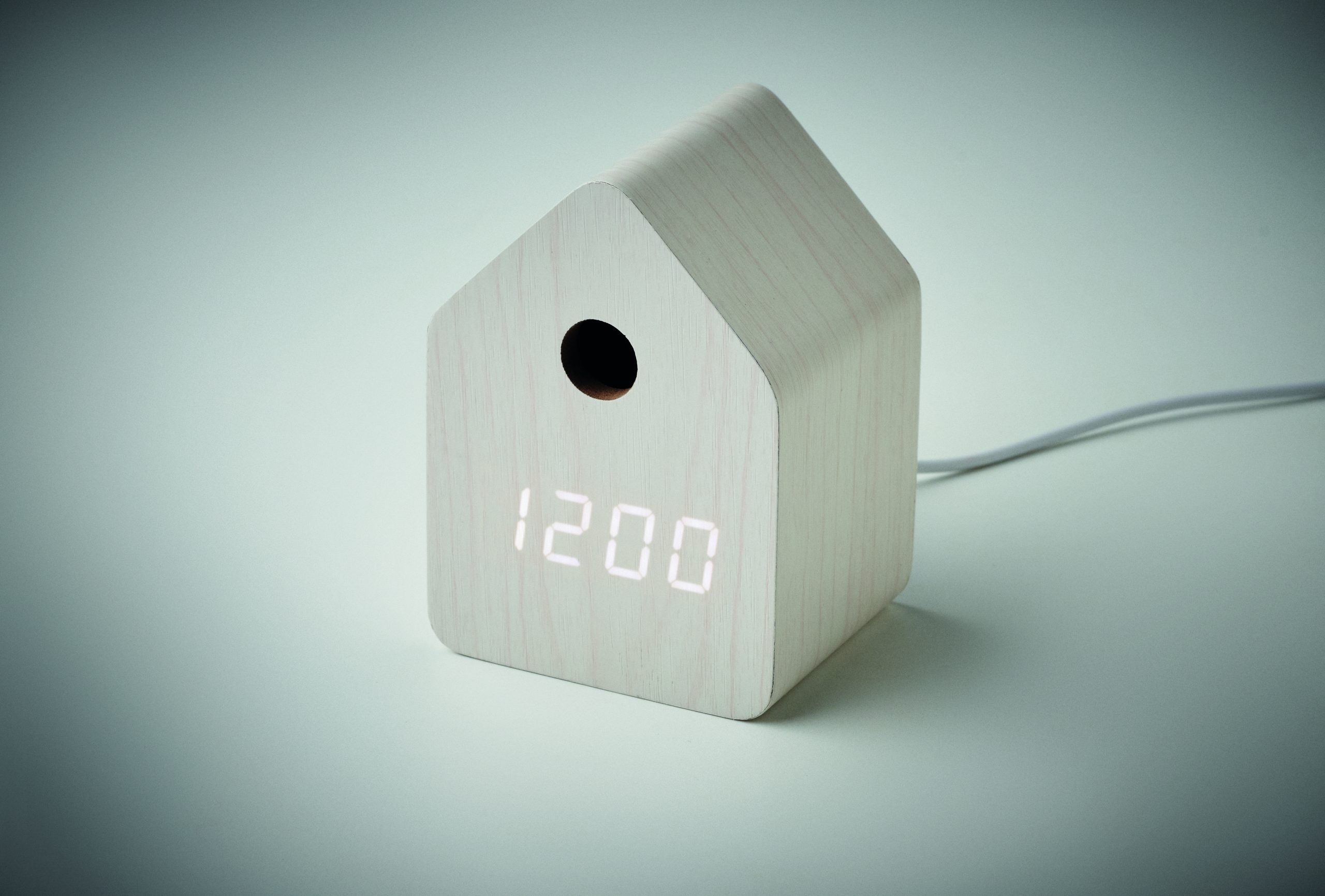 Mały zegar biurkowy z płyty MDF z wbudowanym alarmem z odgłosem kukułki i wyświetlaczem temperatury. Biały wyświetlacz LED. Dźwięk jest automatycznie wyciszany między 22:00 a 06:00. 5-minutowe interwały drzemki