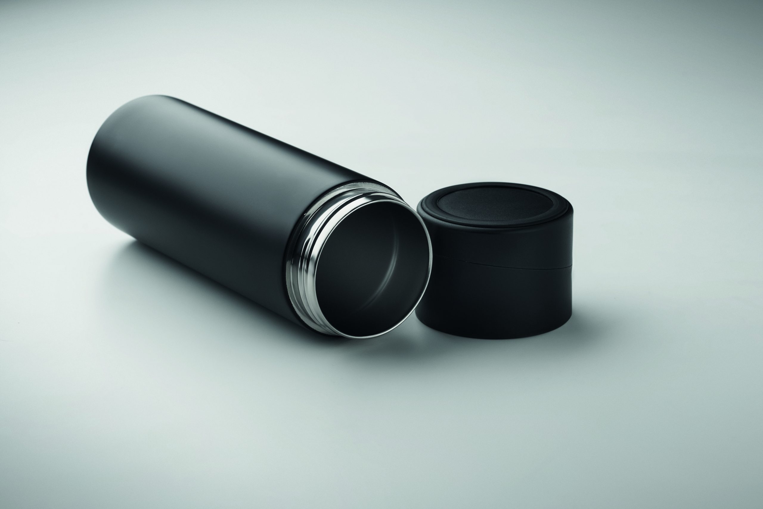 Dwuścienna butelka z izolacją próżniową z recyklingowanej stali nierdzewnej (90% z recyklingowanej stali nierdzewnej i 10% ze stali nierdzewnej) z silikonową, antypoślizgową zakrętką z uchwytem na telefon. Pojemność: 420 ml.
