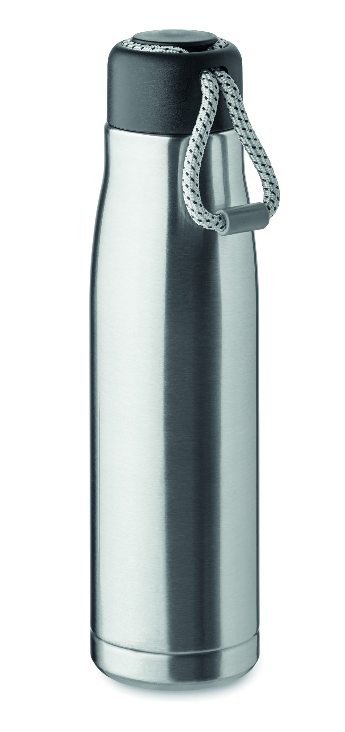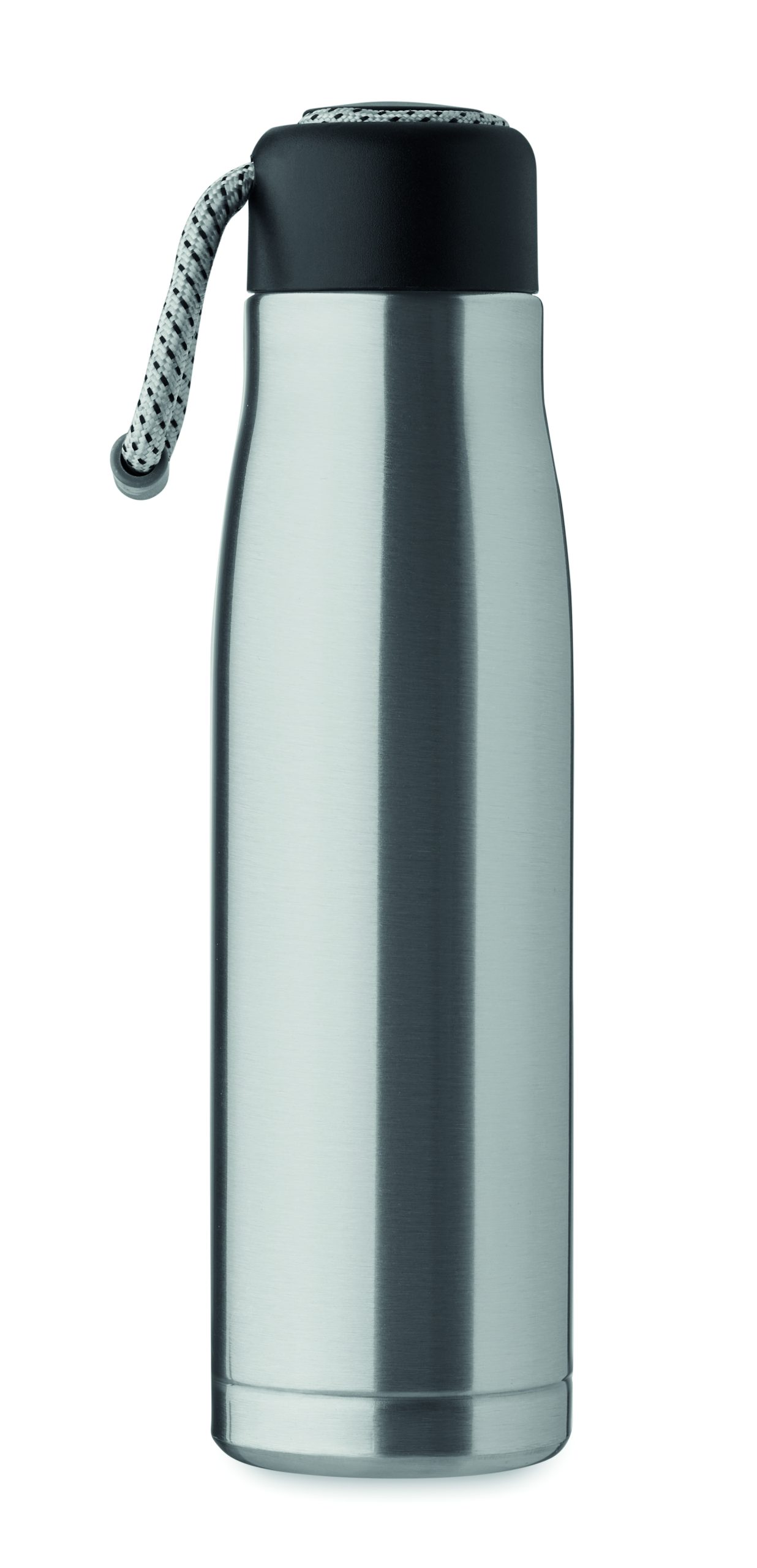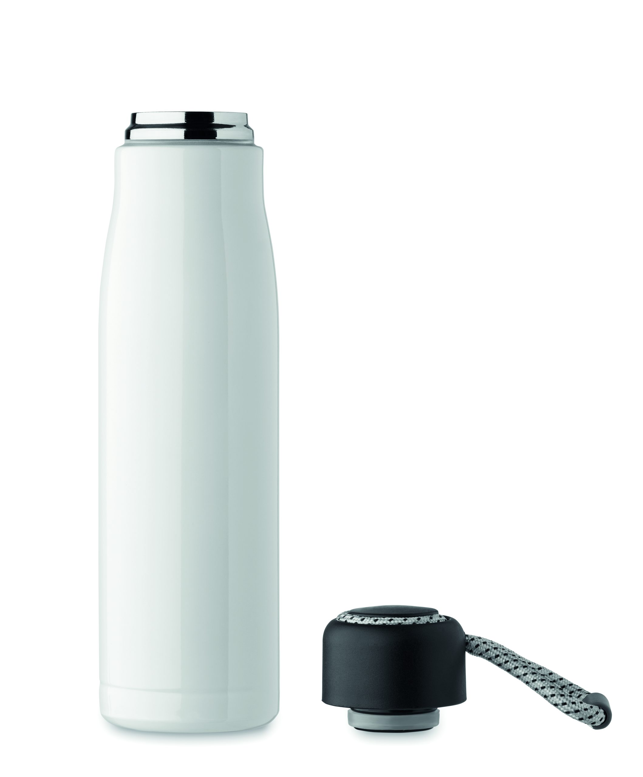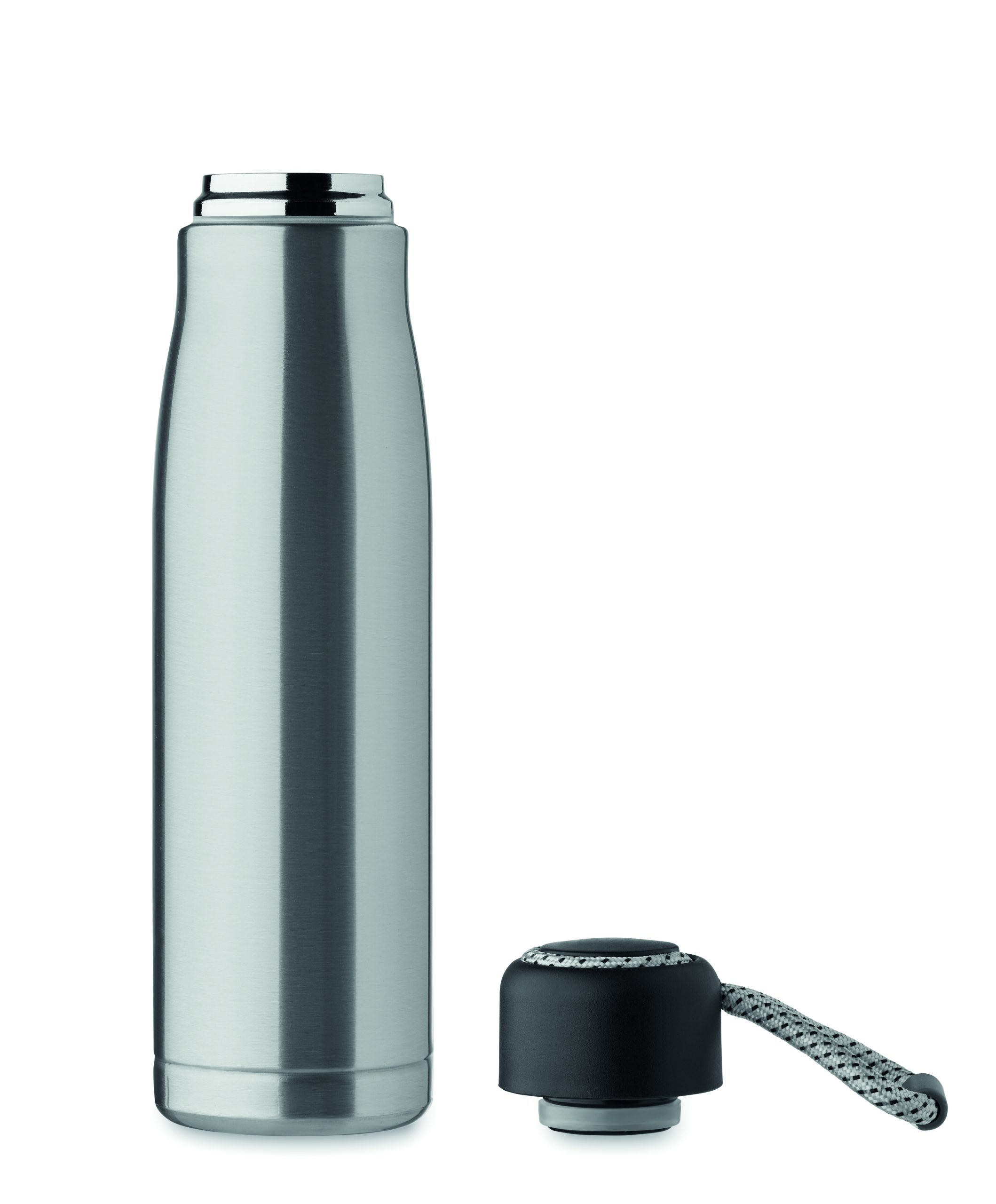 Izolowana próżniowo butelka z podwójnymi ściankami z recyklingowanej stali nierdzewnej (90% z recyklingowanej stali nierdzewnej i 10% ze stali nierdzewnej) ze zintegrowanym uchwytem sznurkowym w zakrętce z PP. Nie przecieka. Pojemność: 500 ml.