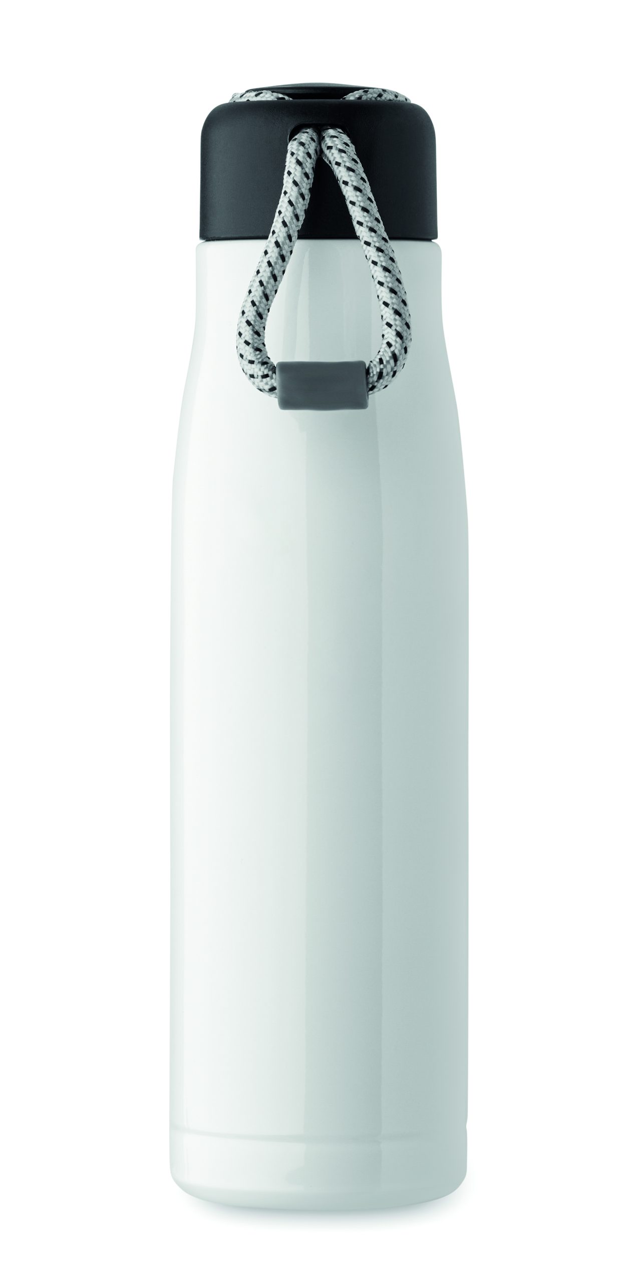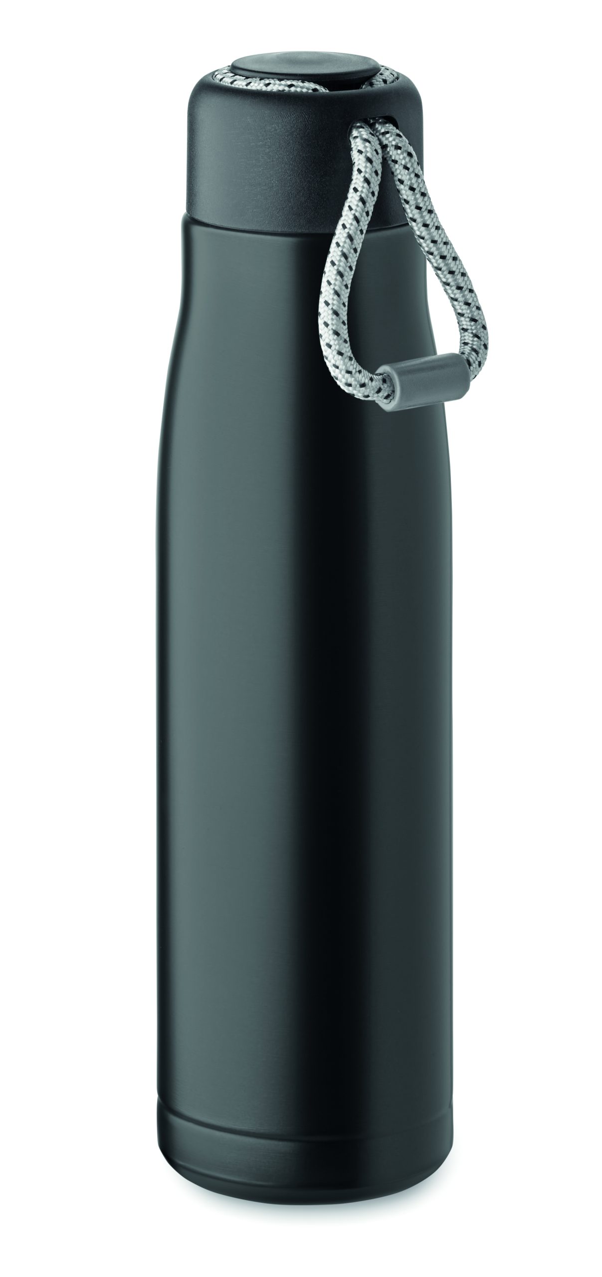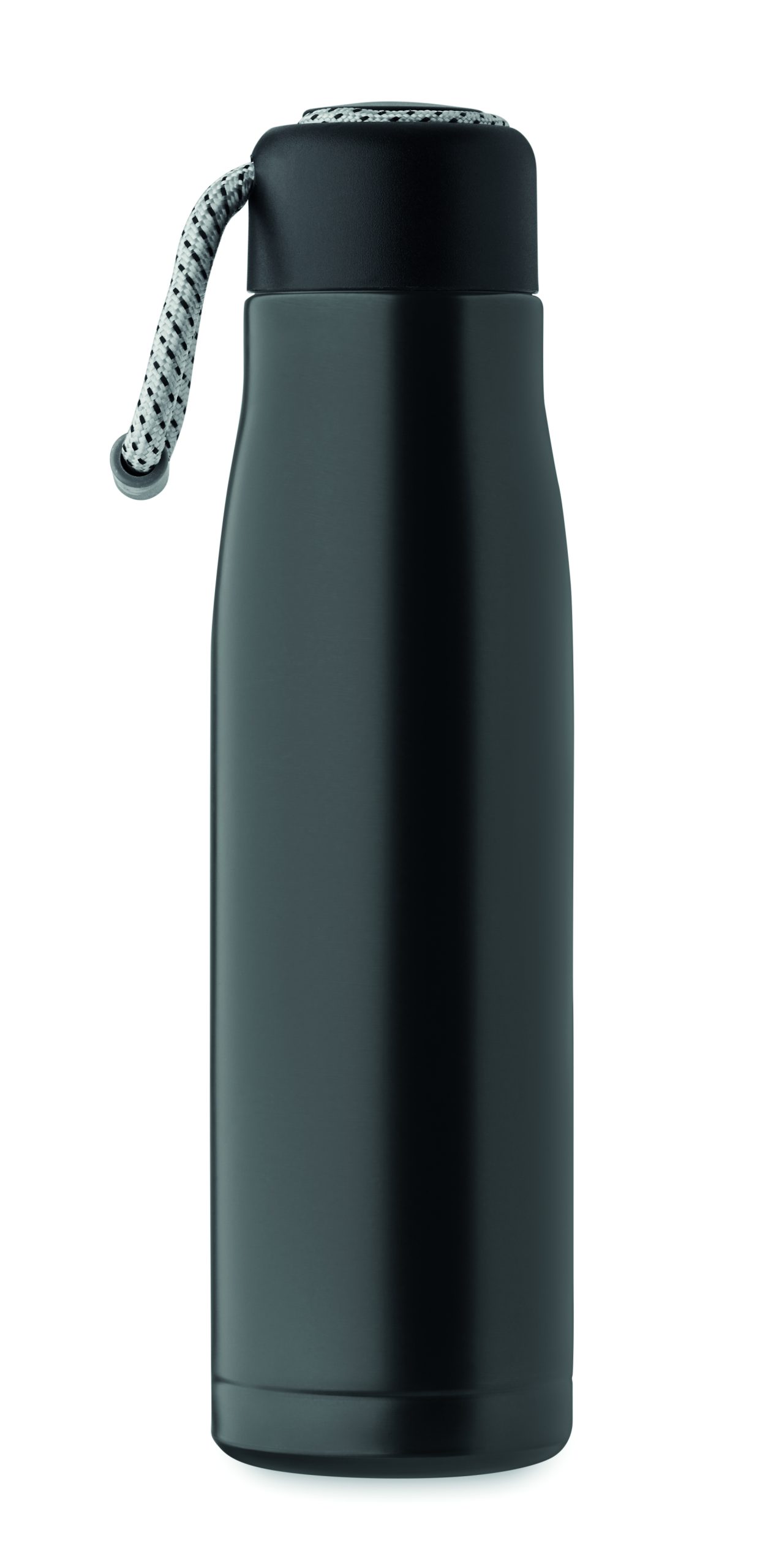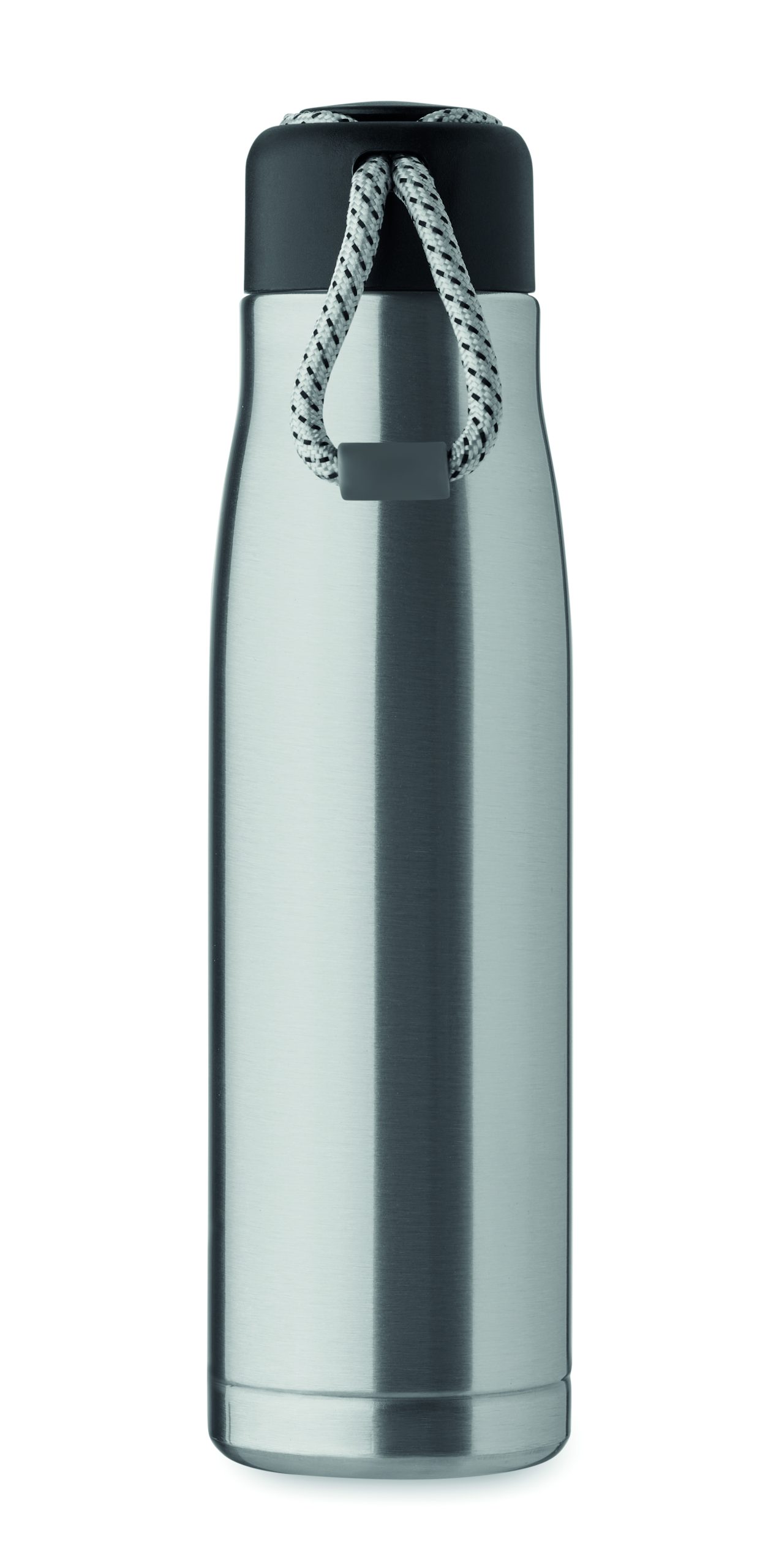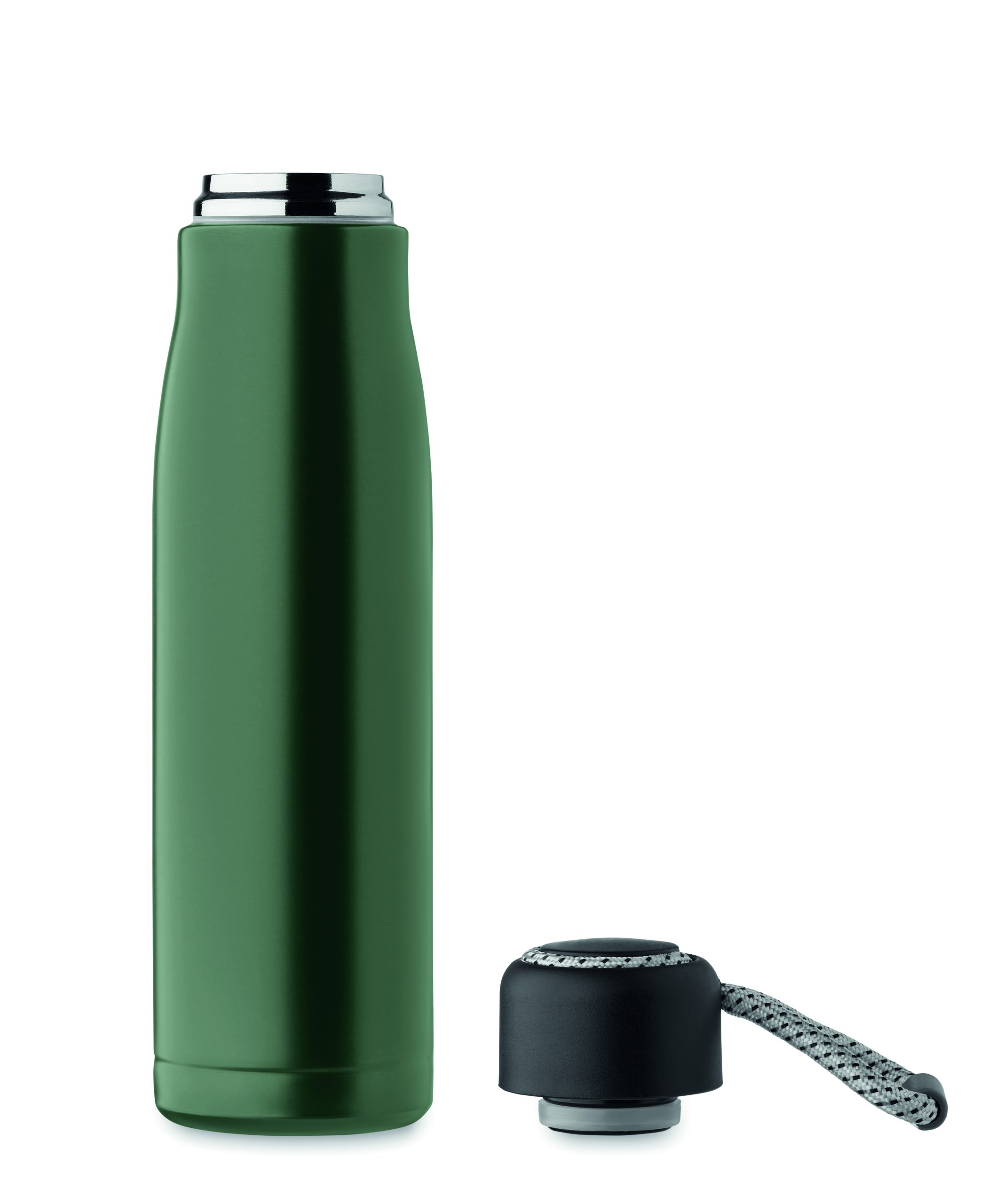 Izolowana próżniowo butelka z podwójnymi ściankami z recyklingowanej stali nierdzewnej (90% z recyklingowanej stali nierdzewnej i 10% ze stali nierdzewnej) ze zintegrowanym uchwytem sznurkowym w zakrętce z PP. Nie przecieka. Pojemność: 500 ml.