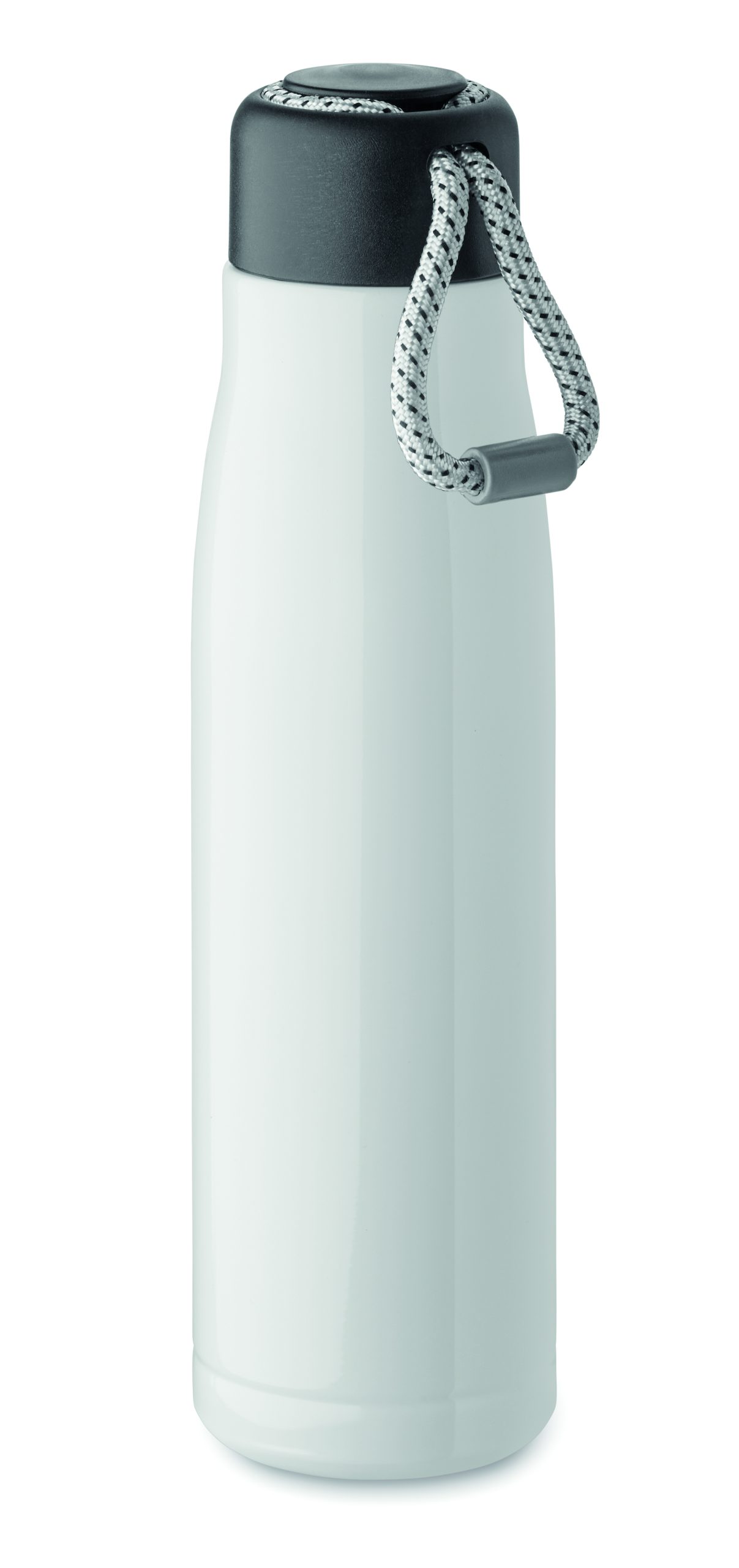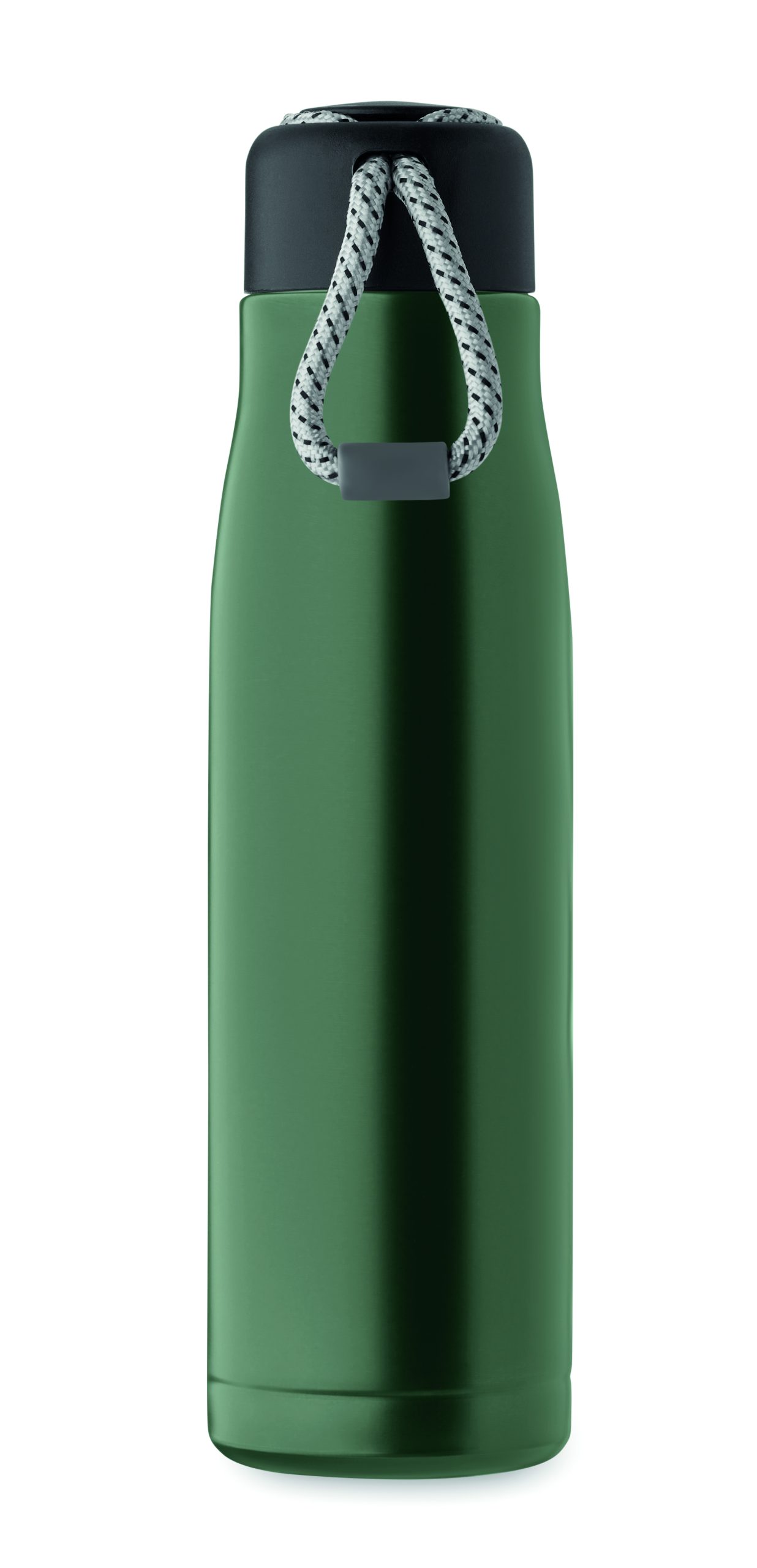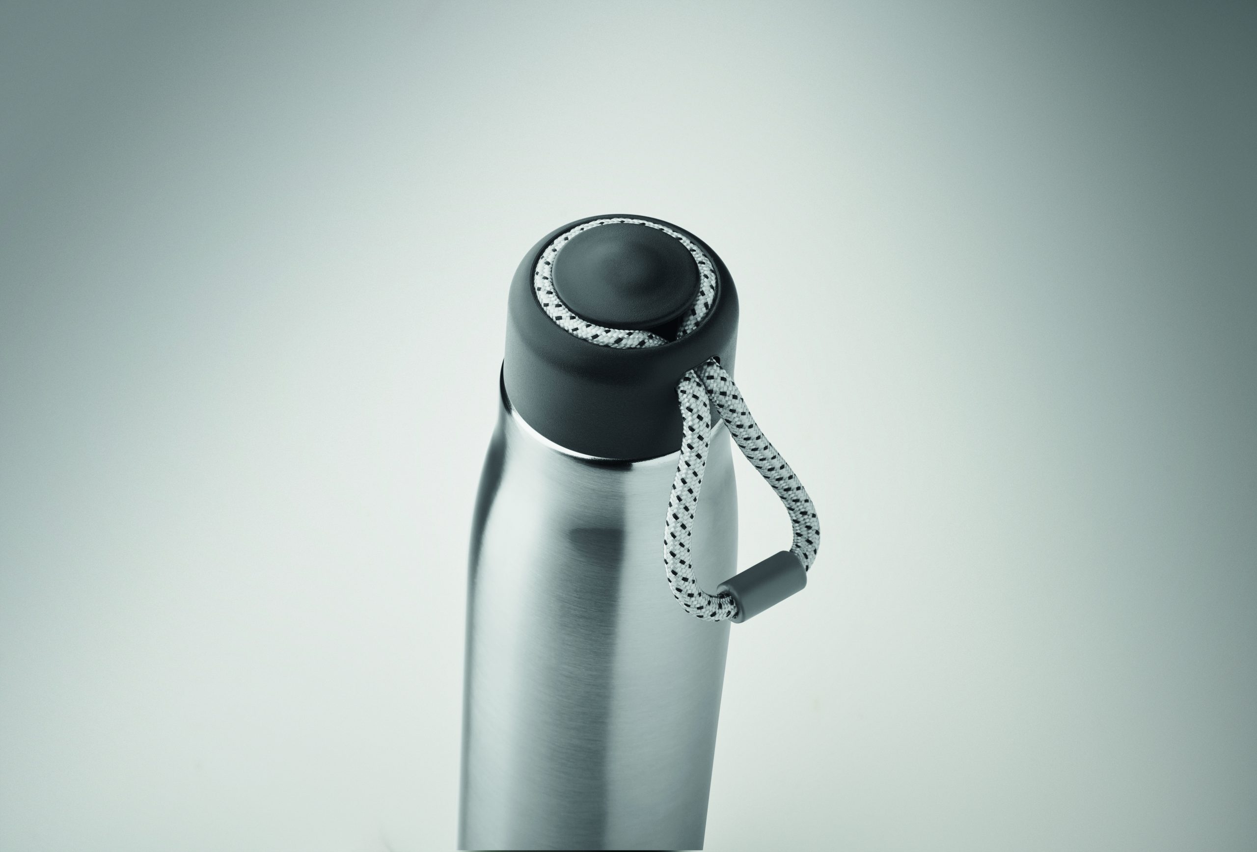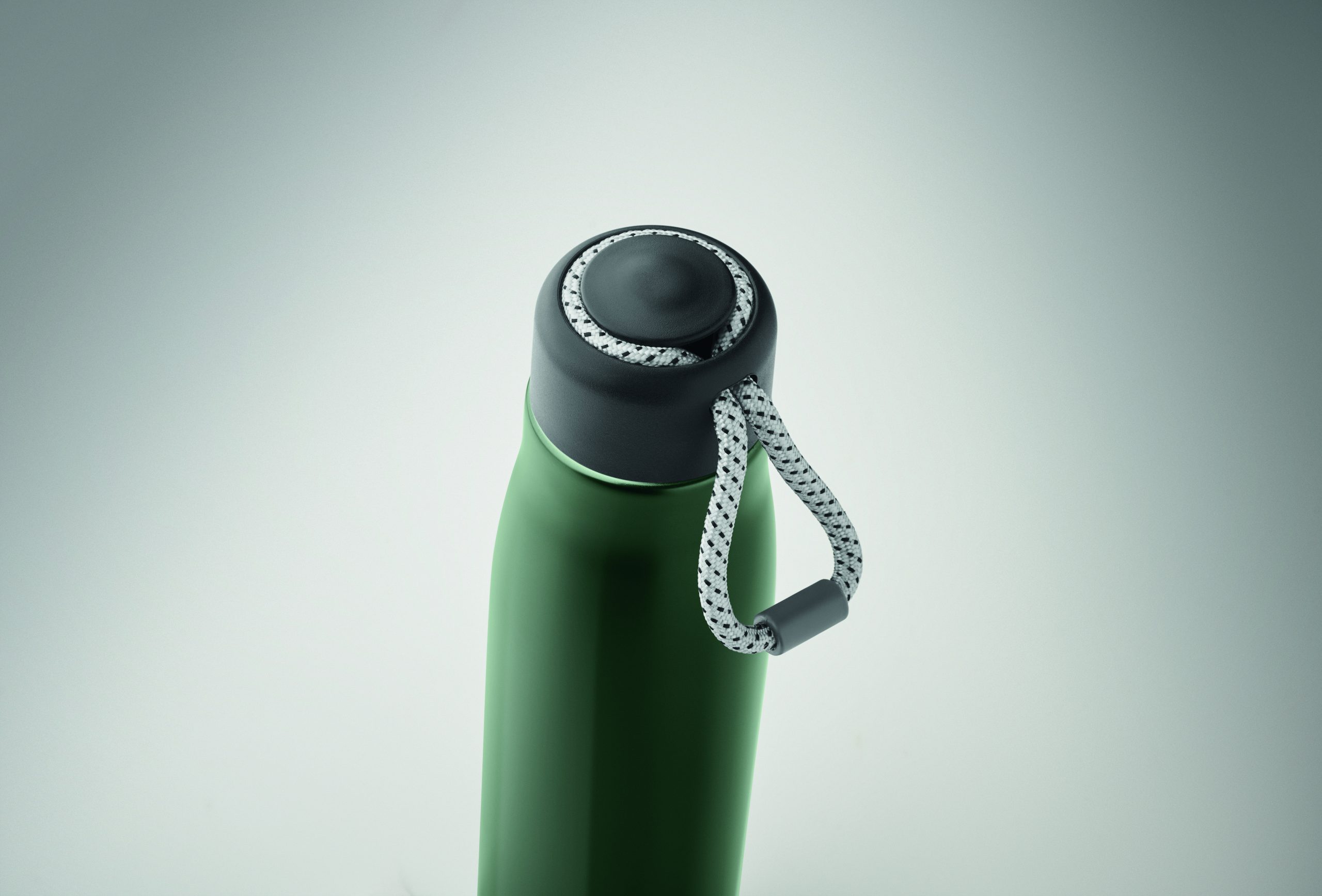 Izolowana próżniowo butelka z podwójnymi ściankami z recyklingowanej stali nierdzewnej (90% z recyklingowanej stali nierdzewnej i 10% ze stali nierdzewnej) ze zintegrowanym uchwytem sznurkowym w zakrętce z PP. Nie przecieka. Pojemność: 500 ml.