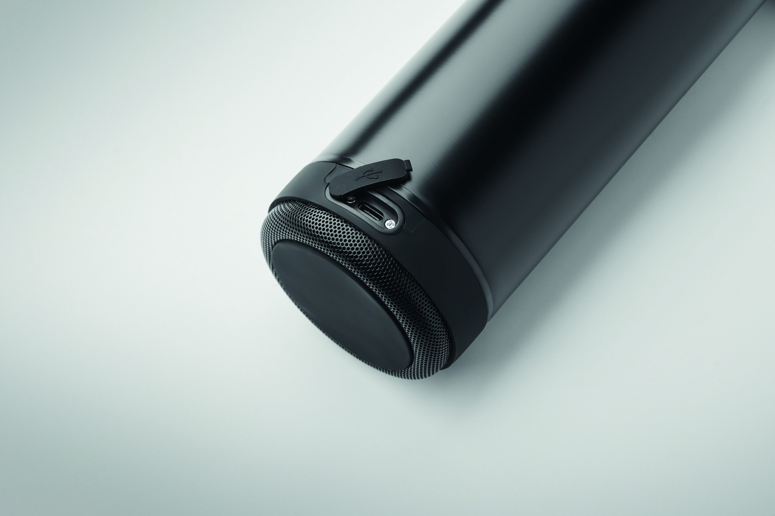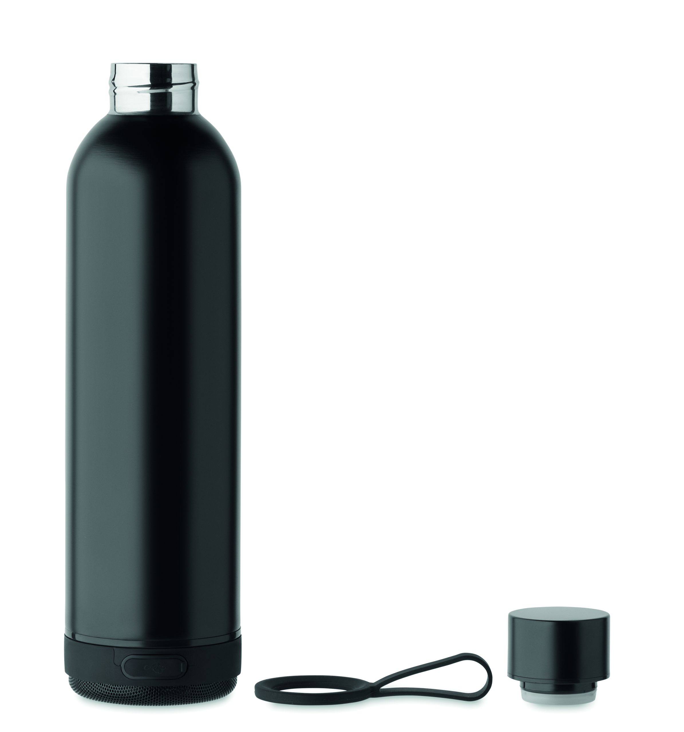 Dwuścienna butelka z izolacją próżniową ze stali nierdzewnej z recyklingu (90% stali nierdzewnej z recyklingu i 10% stali nierdzewnej) i silikonowym uchwytem, z głośnikiem bezprzewodowym 3W. Pojemność: 500 ml. Wbudowana bateria: 500 mAh. Głośnik jest odłączany.