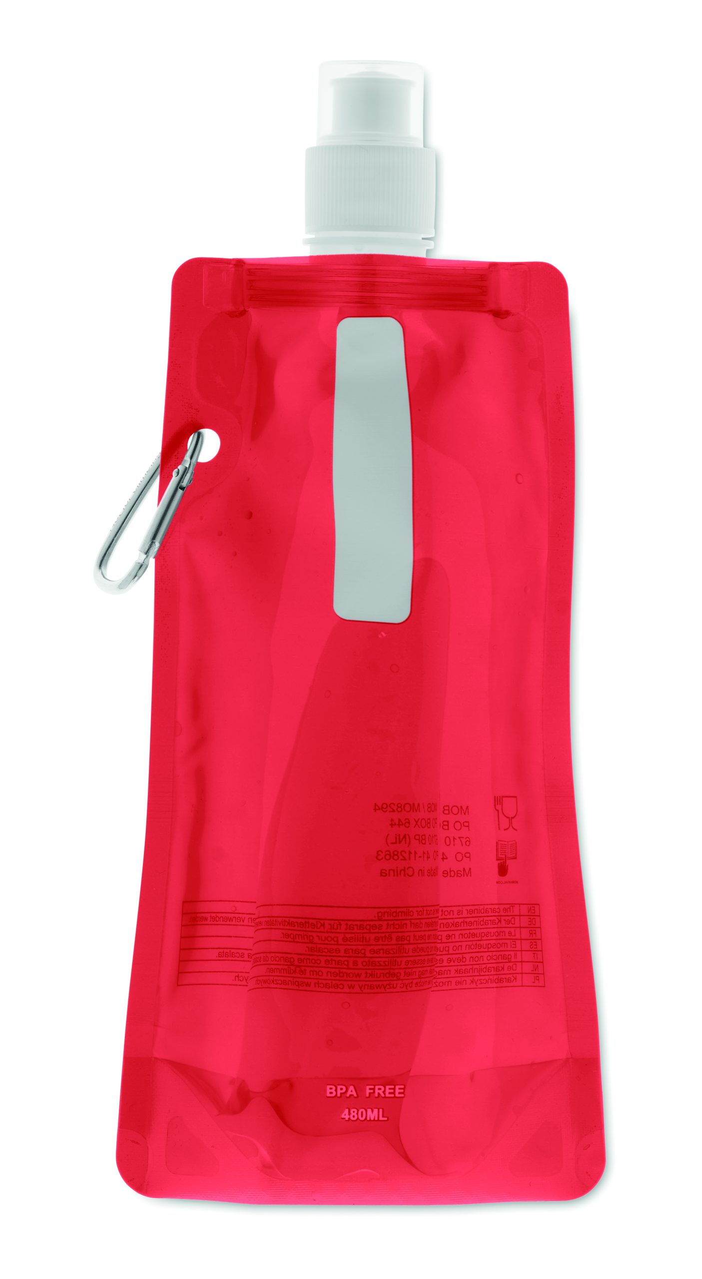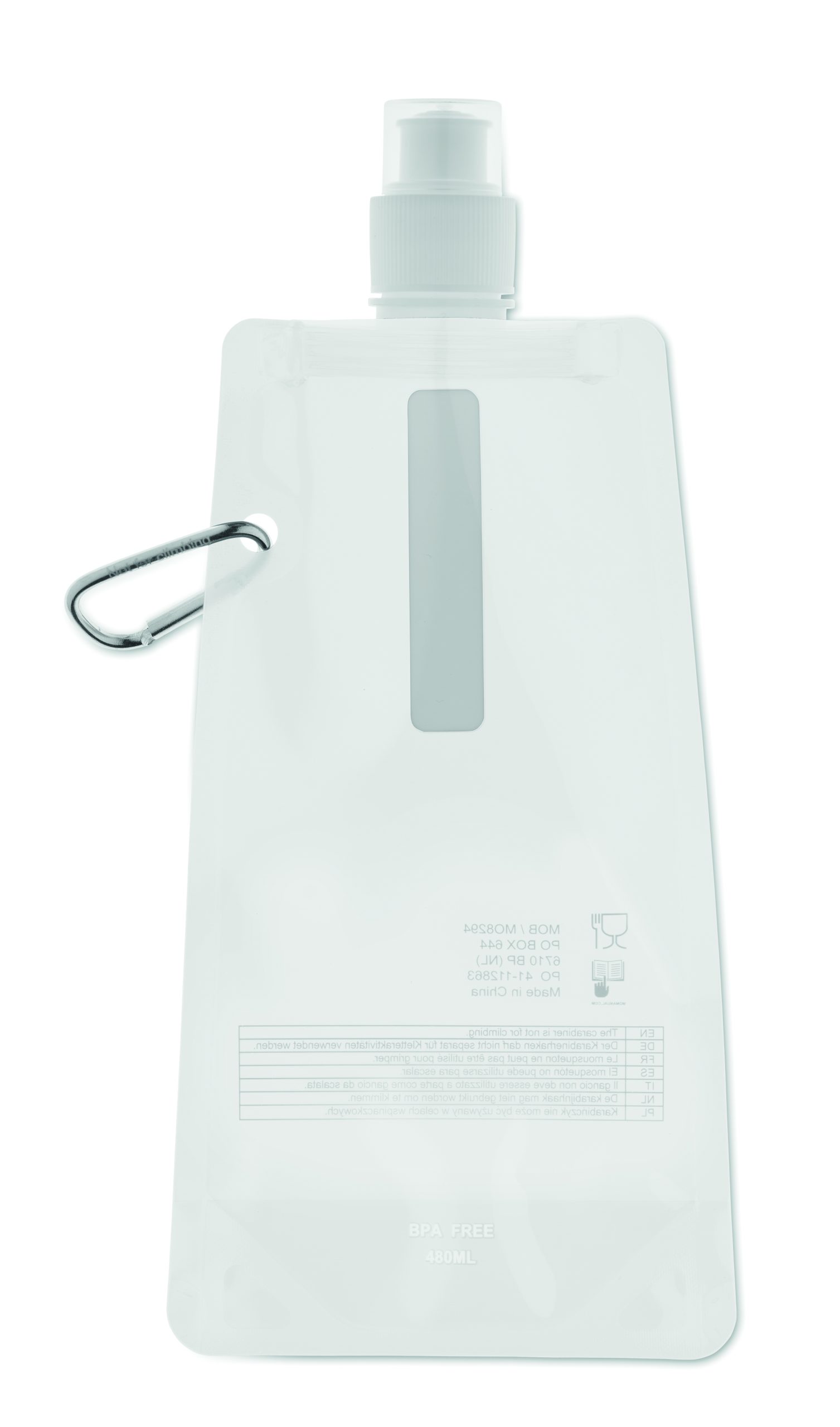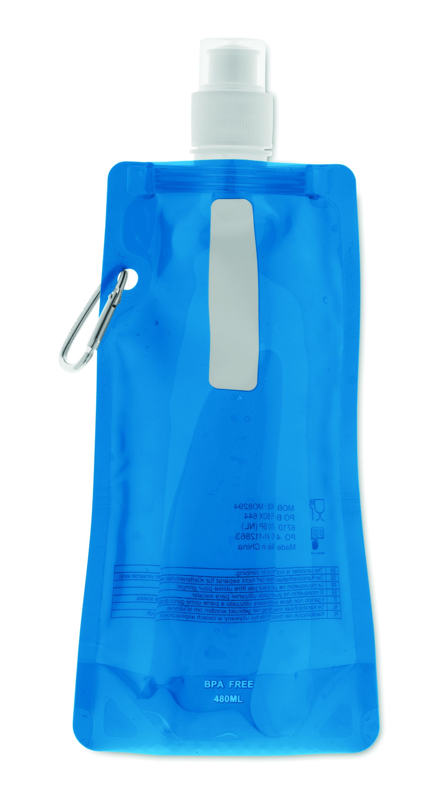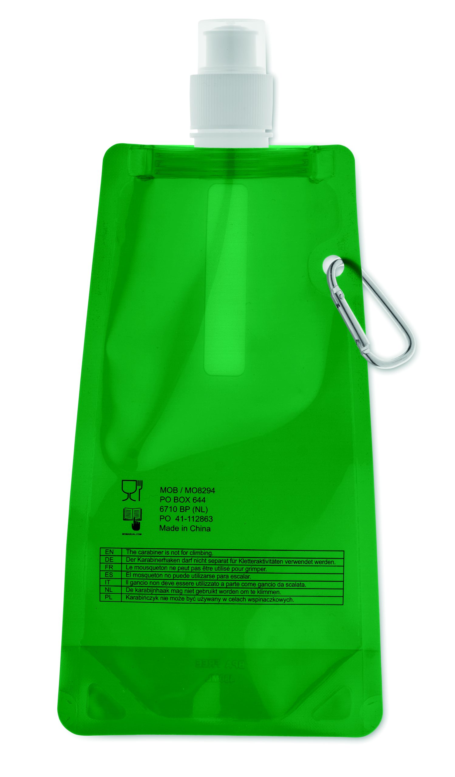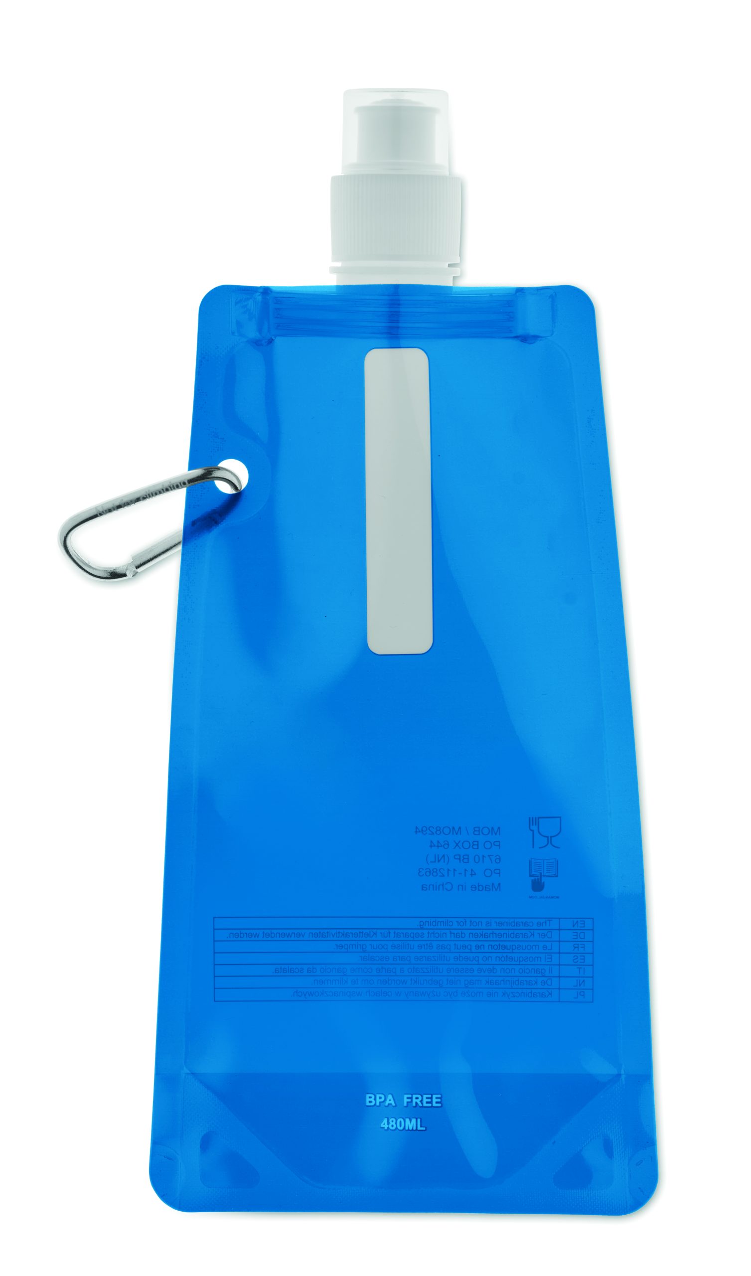Składany plastikowy pojemnik na wodę z PET (nie zawiera BPA), z aluminiowym karabinkiem. Pojemność 480ml. Szczelna.