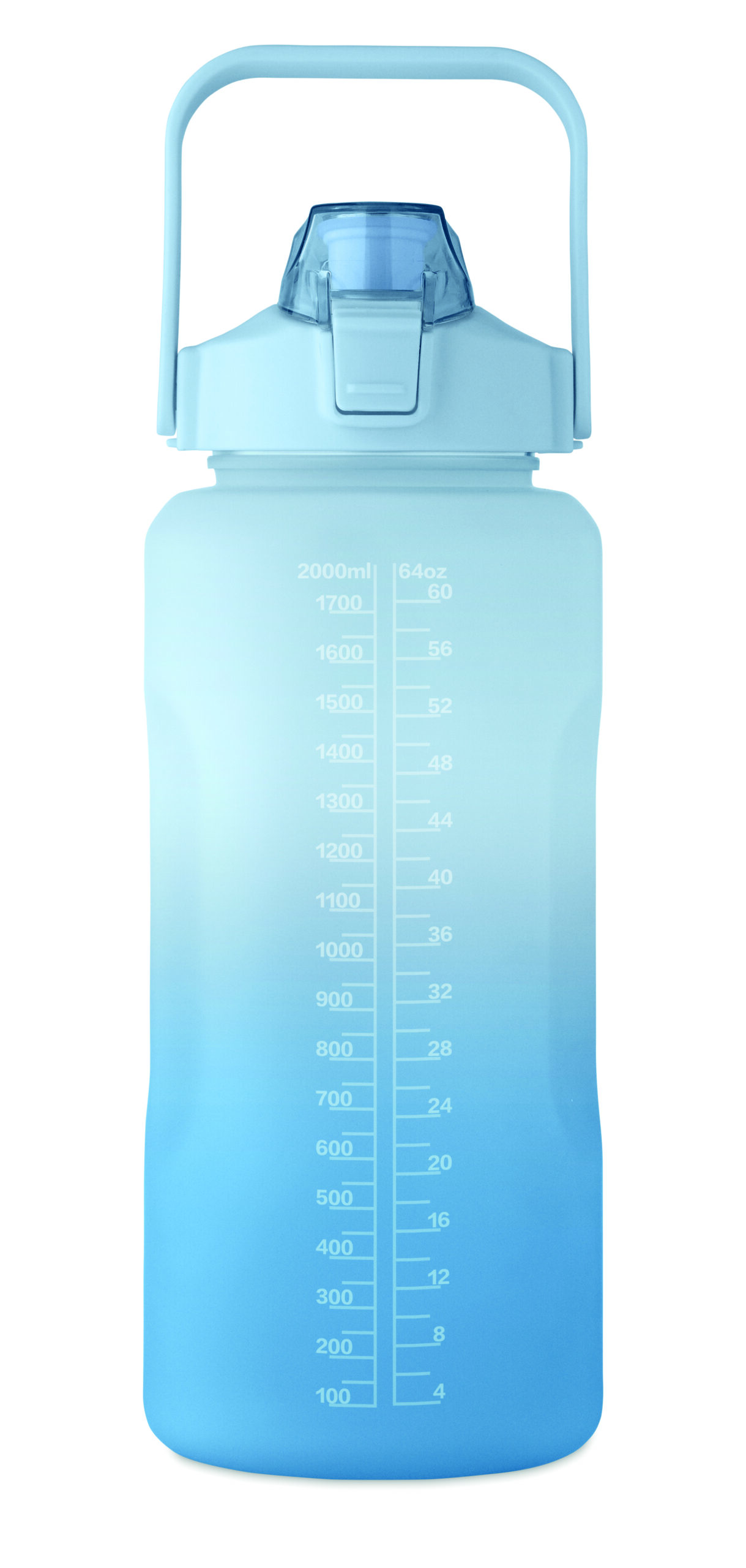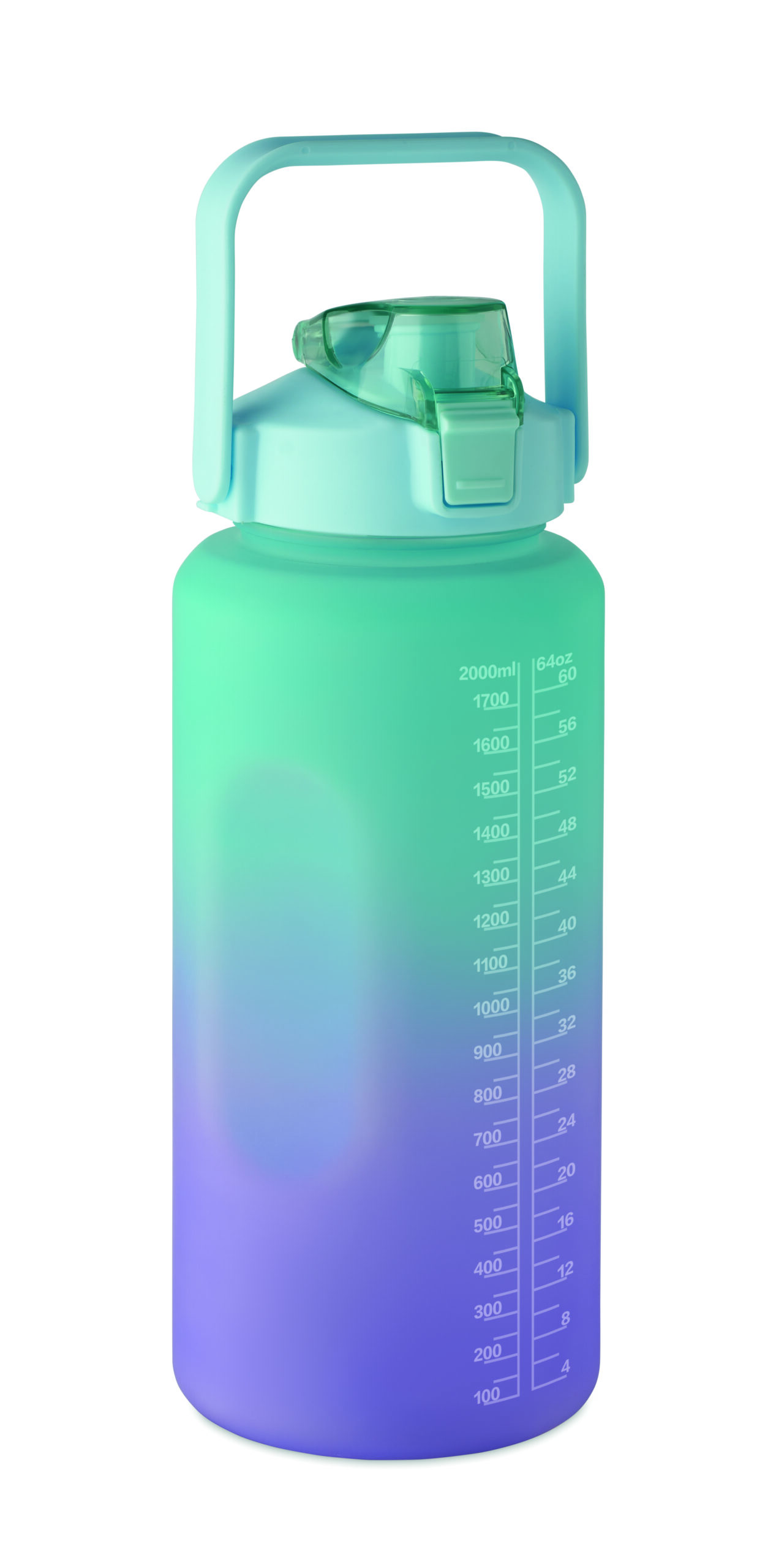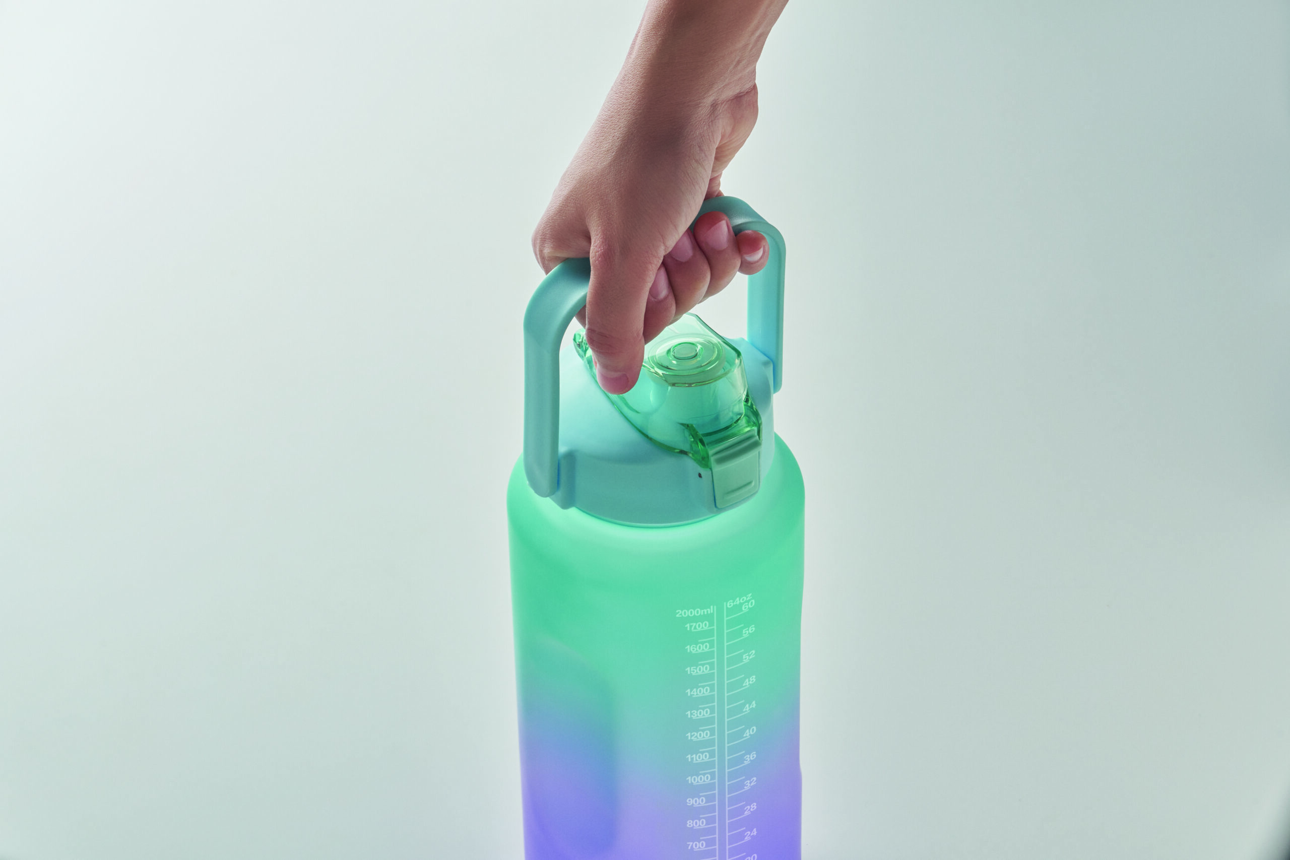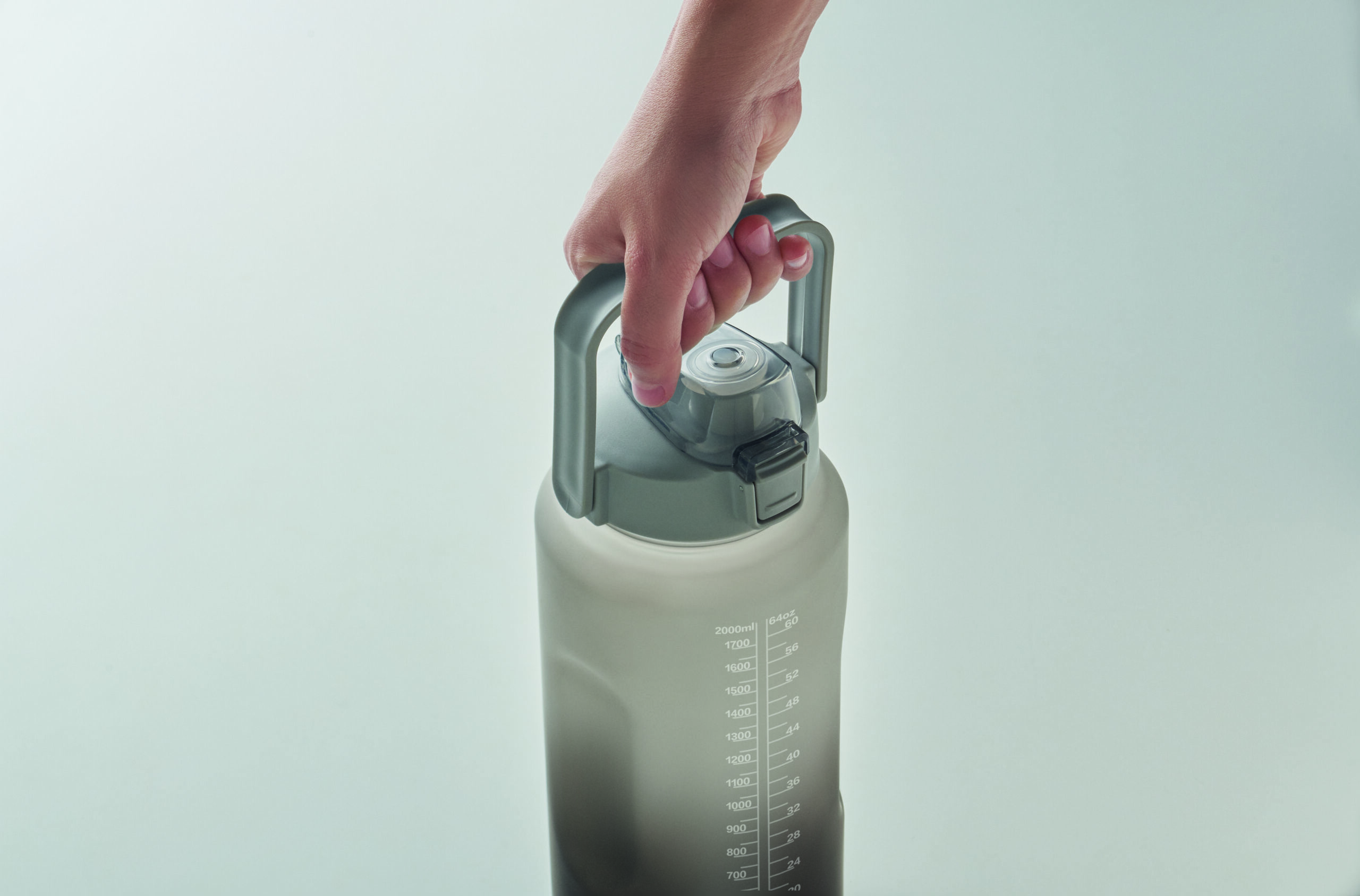 Motywacyjna butelka na wodę z RPET. Posiada otwieraną jedną ręką klapkę ze słomką, blokadę bezpieczeństwa i uchwyt. Nie przecieka. Pojemność: 2000 ml